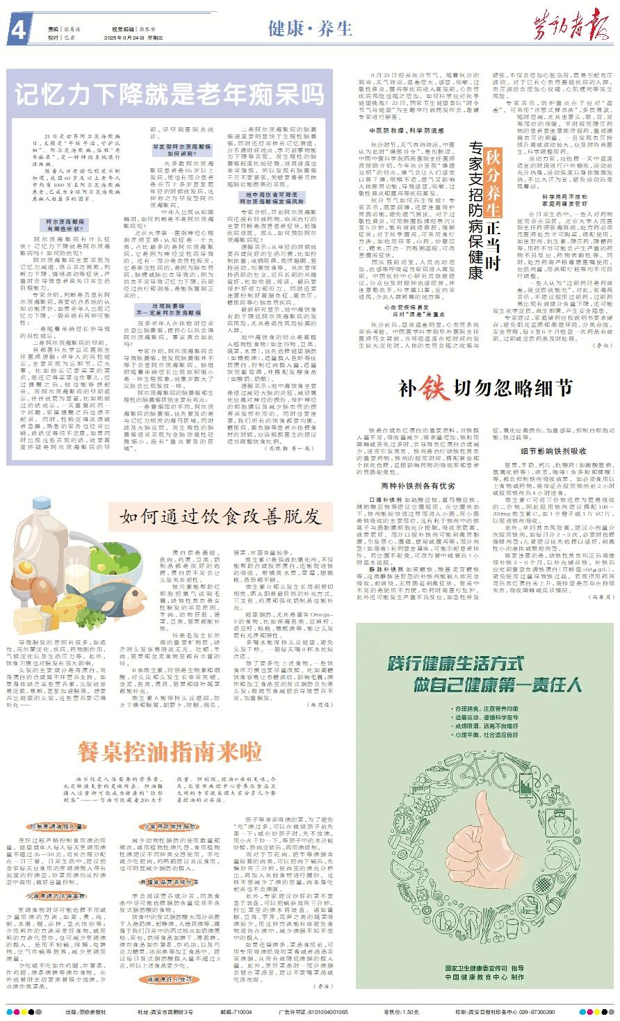 9月23日迎来秋分节气。随着秋分的到来,天气转凉、温差增大,感冒、咳嗽、过敏性鼻炎、腹泻等疾病进入高发期,心血管疾病风险也随之增加。如何科学应对秋季健康挑战?22日,国家卫生健康委以“时令节气与健康”为主题举行新闻发布会,邀请专家进行解答。中医防秋燥,科学防流感 秋分时节,天气由热转凉,中医认为此时“燥邪当令”,易伤肺津。中国中医科学院西苑医院主任医师黄欲晓介绍,今年秋分呈现“燥湿交织”的特点,燥气会让人们感觉口鼻干燥、咽喉不适,湿气又影响人体脾胃功能,导致感冒、咳嗽、过敏性鼻炎和腹泻等疾病高发。 秋分节气如何养生保健?专家表示,既要润燥,还要注重保护胃肠功能,避免湿气困扰。对于过敏性鼻炎,可用指腹按揉迎香穴3至5分钟,能有效疏通鼻腔,缓解症状;对于秋季腹泻,可采用食疗方法,如选用茯苓、山药、炒薏苡仁、粳米、百合一同熬粥温服,可改善腹泻症状。 国庆假期将至,人员流动增加,流感等呼吸道传染病进入高发期。中国疾控中心研究员韩俊建议,公众应及时接种流感疫苗,并注意勤洗手、科学戴口罩、室内常通风、少去人群密集的地方等。心血管疾病易发应对“温差”是重点 秋分前后,昼夜温差明显,心血管系统面临考验。中国医学科学院阜外医院主任医师马文君说,当环境温度在短时间内发生较大变化时,人体的血管会随之收缩与舒张,不仅会增加心脏负荷,更易引起血压波动。对于已有心血管基础疾病的人群,血压波动会增加心绞痛、心肌梗死等发生风险。 专家表示,防护重点在于应对“温差”。可采用“洋葱式穿衣法”,多层薄款、随时增减,尤其注意头、颈、背、足等部位的保暖。平时服用降压药物的患者要注意规律服药,重视清晨血压的测量。一旦发现血压持续升高或波动较大,应及时咨询医生,科学调整用药。 运动方面,应选择一天中温度适宜的时段进行户外锻炼,运动前充分热身,运动强度以身体微微发热、不出大汗为宜,避免运动后受风着凉。科学用药不放松家庭药箱要管好 在日常生活中,一些人对药物使用存在误区。北京大学人民医院主任药师张海英说,处方药必须凭医师处方才可购买、调配使用,如注射剂、抗生素、降压药、降糖药等,用药不当可能会产生严重的药物不良反应、药物依赖性等。同时,处方药需严格遵循医嘱使用,包括剂量、用法和疗程等均不可自行调整。 一些人认为“过期药只是药效差,没变质就能吃”,对此,张海英表示,不建议服用过期药,过期药易出现有效成分含量下降,还可能发生化学变质,滋生细菌,产生安全隐患。 专家建议,家庭储药应按说明书要求储存,避免阳光直晒和潮湿环境,分类存放,安全管理,每3至6个月检查一次药品有效期,过期或变质药品及时处理。 (李恒)