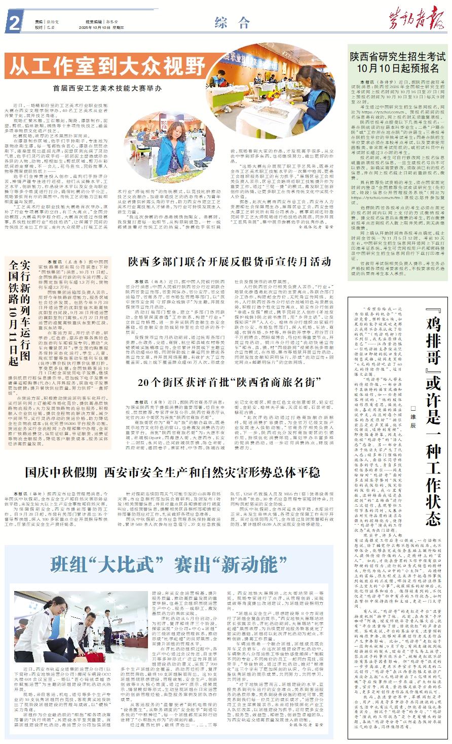 近日,西安市轨道交通集团运营分公司(以下简称:西安地铁运营分公司)渭河车辆段OCC大楼601会议室里,一场以“匠心铸就卓越 协作赋能运营”为主题的班组建设评比活动火热开展。 现场,来自客运、机电、通号等多个生产专业的10支优秀班组同台竞技,客观真实地反映出了现阶段班组建设的管理与成效,以“硬核”实力角逐。 班组作为企业最活跃的“细胞”和各项决策部署的“执行终端”,其建设水平至关重要。首届班组建设评比活动,是运营分公司加强班组建设、夯实安全运营根基,提升服务质量、推动高质量发展的重要举措,也是工会组织围绕运营生产中心、服务一线职工、激发基层活力的具体实践。 评比活动从5月份启动,分为初评、复评和终评三个阶段,探索实现“分公司+中心+班组”的三级班组建设管理体系,推动形成“比学赶超”的良好氛围,全面提升班组的管理水平。 在评比活动组织过程中,各生产中心通过会议传达、自主学习等多种形式广泛宣传开展班组建设活动的意义,实现了700多个生产班组的全覆盖。活动历经初评、复评的层层筛选,最终10支班组脱颖而出。这10支班组围绕思想建设、管理效能、安全生产、创新创效等8大核心维度,通过PPT演示、视频展示、情景模拟等形式,生动呈现班组在日常运营中的创新管理经验、典型服务案例及团队协作成果。 从客运服务的“温馨使者”到机电维保的“设备医生”,从乘务调度的“安全舵手”到通号系统的“中枢神经”,每一个班组都用实际行动诠释了“小细胞大作为”的深刻内涵。 经过激烈比拼,最终评选出一、二、三等奖。西安地铁大雁塔站、北大街站荣获一等奖。现场专家进行了点评,从管理创新、实践成效等角度提出改进建议,为班组建设指明方向。 “班组从安全生产、思想建设等 8个方面进行了班组全复盘的展示。”西安地铁大雁塔站站区长张震表示,评比活动期间,大雁塔站“比学赶超”氛围浓厚,为后续更好地服务乘客奠定了坚实的基础,班组将以此次评比活动为起点,不断创新,提高工作质量。 车辆运维是一个融合班组,班组成员既会开车又会修车。在这次班组建设评比活动中,车辆乘务八分部运维工毕佳怡感受颇深:“能跟不同的专业,不同岗位的员工一起同台竞技,很荣幸。”毕佳怡说,通过评比活动,她对“标准化”这三个字有了更加深刻的认识。今后,将借鉴优秀班组的展示成果,共同努力,共同学习,共同进步。 “对于地铁运营而言,班组建设的水平,直接关系到列车运行的安全准点,关系到客运服务的品质形象,关系到设备设施的稳定可靠,更关系到我们每一位员工的成长成才。”运营分公司工会主席袁媛表示,未来将持续深化产业工人队伍改革,以班组建设为抓手,培育更多安全型、服务型、效益型、和谐型、创新型卓越团队,为西安轨道交通高质量发展注入新动能。 全媒体记者 苗莹