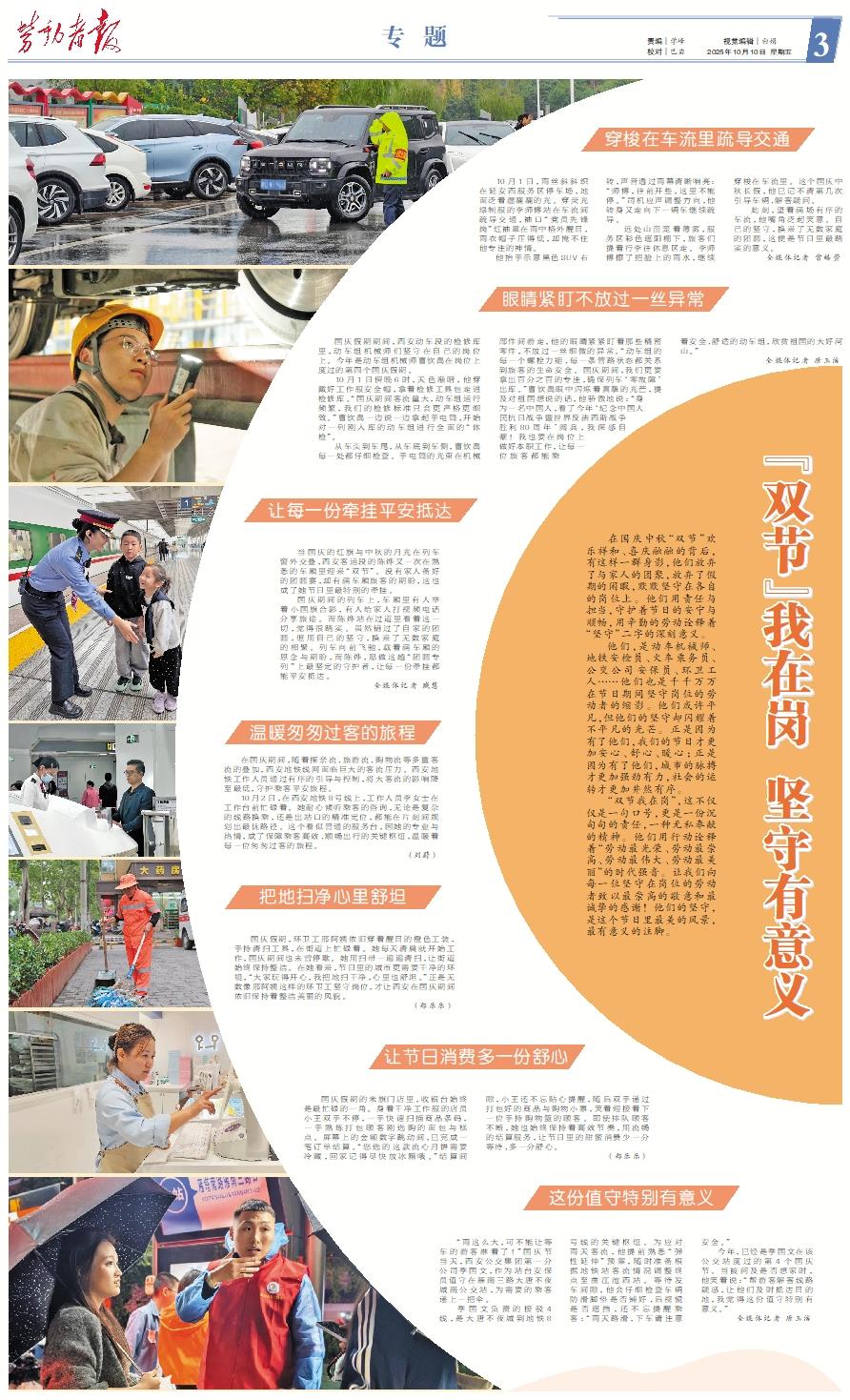 在国庆中秋“双节”欢乐祥和、喜庆融融的背后,有这样一群身影,他们放弃了与家人的团聚,放弃了假期的闲暇,默默坚守在各自的岗位上。他们用责任与担当,守护着节日的安宁与顺畅,用辛勤的劳动诠释着“坚守”二字的深刻意义。 他们,是动车机械师、地铁安检员、火车乘务员、公交公司安保员、环卫工人……他们也是千千万万在节日期间坚守岗位的劳动者的缩影。他们或许平凡,但他们的坚守却闪耀着不平凡的光芒。正是因为有了他们,我们的节日才更加安心、舒心、暖心;正是因为有了他们,城市的脉搏才更加强劲有力,社会的运转才更加井然有序。 “双节我在岗”,这不仅仅是一句口号,更是一份沉甸甸的责任,一种无私奉献的精神。他们用行动诠释着“劳动最光荣、劳动最崇高、劳动最伟大、劳动最美丽”的时代强音。让我们向每一位坚守在岗位的劳动者致以最崇高的敬意和最诚挚的感谢!他们的坚守,是这个节日里最美的风景,最有意义的注脚。穿梭在车流里疏导交通 10月1日,雨丝斜斜织在延安西服务区停车场,地面泛着湿漉漉的光。穿荧光绿制服的李师傅站在车流间疏导交通,袖口“党员先锋岗”红袖章在雨中格外醒目,雨衣帽子压得低,却掩不住他专注的神情。 他抬手示意黑色SUV右转,声音透过雨幕清晰响亮:“师傅,往前开些,这里不能停。”司机应声调整方向,他转身又走向下一辆车继续疏导。 远处山峦笼着薄雾,服务区彩色遮阳棚下,旅客们提着行李往休息区走。李师傅擦了把脸上的雨水,继续穿梭在车流里。这个国庆中秋长假,他已记不清第几次引导车辆、解答疑问。 此刻,望着满场有序的车流,他嘴角泛起笑意。自己的坚守,换来了无数家庭的团圆,这便是节日里最踏实的意义。 全媒体记者 常皓萱眼睛紧盯不放过一丝异常 国庆假期期间,西安动车段的检修库里,动车组机械师们坚守在自己的岗位上。今年是动车组机械师曹钦禹在岗位上度过的第四个国庆假期。 10月1日傍晚6时,天色渐暗,他穿戴好工作服安全帽,拿着检修工具包走进检修库。“国庆期间客流量大,动车组运行频繁,我们的检修标准只会更严格更细致。”曹钦禹一边说一边拿起手电筒,开始对一列刚入库的动车组进行全面的“体检”。 从车头到车尾,从车底到车侧,曹钦禹每一处都仔细检查。手电筒的光束在机械部件间游走,他的眼睛紧紧盯着那些精密零件,不放过一丝细微的异常。“动车组的每一个螺栓力矩、每一条管路状态都关系到旅客的生命安全。国庆期间,我们更要拿出百分之百的专注,确保列车‘零故障’出库。”曹钦禹眼中闪烁着真挚的光芒,提及对祖国想说的话,他骄傲地说:“身为一名中国人,看了今年‘纪念中国人民抗日战争暨世界反法西斯战争胜利80周年’阅兵,我深感自豪!我也要在岗位上做好本职工作,让每一位旅客都能乘着安全、舒适的动车组,欣赏祖国的大好河山。” 全媒体记者 唐玉洁让每一份牵挂平安抵达 当国庆的红旗与中秋的月光在列车窗外交叠,西安客运段的陈烨又一次在熟悉的车厢里迎来“双节”。没有家人备好的团圆宴,却有满车厢旅客的期盼,这也成了她节日里最特别的牵挂。 国庆期间的列车上,车厢里有人举着小国旗合影,有人给家人打视频电话分享旅途。而陈烨站在过道里看着这一切,觉得很踏实。虽然错过了自家的团圆,但用自己的坚守,换来了无数家庭的相聚。列车向前飞驰,载着满车厢的思念与期盼,而陈烨,愿做这趟“团圆专列”上最坚定的守护者,让每一份牵挂都能平安抵达。 全媒体记者 臧慧温暖匆匆过客的旅程 在国庆期间,随着探亲流、旅游流、购物流等多重客流的叠加,西安地铁线网面临巨大的客流压力。西安地铁工作人员通过有序的引导与控制,将大客流的影响降至最低,守护乘客平安旅程。 10月2日,在西安地铁8号线上,工作人员李女士在工作台前忙碌着。她耐心倾听乘客的咨询,无论是复杂的线路换乘,还是出站口的精准定位,都能在片刻间规划出最优路径。这个看似普通的服务台,因她的专业与热情,成了保障乘客高效、顺畅出行的关键枢纽,温暖着每一位匆匆过客的旅程。 (刘蔚)把地扫净心里舒坦 国庆假期,环卫工邢阿姨依旧穿着醒目的橙色工装,手持清扫工具,在街道上忙碌着。她每天清晨就开始工作,国庆期间也未曾停歇。她用扫帚一遍遍清扫,让街道始终保持整洁。在她看来,节日里的城市更需要干净的环境,“大家玩得开心,我把地扫干净,心里也舒坦。”正是无数像邢阿姨这样的环卫工坚守岗位,才让西安在国庆期间依旧保持着整洁美丽的风貌。 (郑乐乐)让节日消费多一份舒心 国庆假期的米旗门店里,收银台始终是最忙碌的一角。身着干净工作服的店员小王双手不停,一手快速扫描商品条码,一手熟练打包顾客刚选购的面包与糕点。屏幕上的金额数字跳动间,已完成一笔订单结算。“您选的这款流心月饼需要冷藏,回家记得尽快放冰箱哦。”结算间隙,小王还不忘贴心提醒,随后双手递过打包好的商品与购物小票,笑着迎接着下一位手持购物篮的顾客。即使排队顾客不断,她也始终保持着高效节奏,用流畅的结算服务,让节日里的甜蜜消费少一分等待、多一分舒心。 (郑乐乐)这份值守特别有意义 “雨这么大,可不能让等车的游客淋着了!”国庆节当天,西安公交集团第一分公司季国文,作为站台安保员值守在