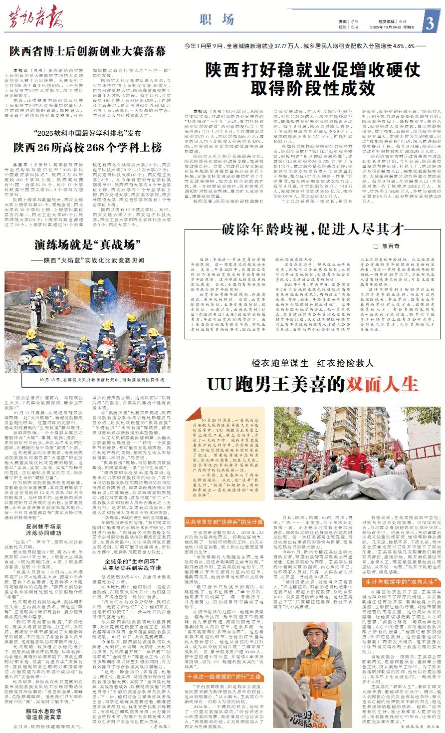 10月20日清晨,一夜秋雨让西安航天城街道笼罩在久久不散的晨雾中。UU 跑腿员王美喜已穿上橙色工装,骑上电动车,开始了一天的工作。他的车筐里装着客户的生鲜订单,尽管路面湿滑,但他凭借经验安全准时完成了配送。望着他穿梭不息的身影,谁也难以想象,就在几天前,这位年仅29岁的骑手还奋战在广西南宁的抗洪救援一线。 一年前,王美喜加入了西安先锋救援队。从此,他“送单”载着生计,“救援”扛起担当,用双脚奔跑出一条充满温情的“双面热血路”。从共享单车到“优种兵”的生计路 王美喜是安徽阜阳人。2018年,22岁的他为爱奔赴西安。初到这座城市,他找到了一份银行特勤的工作,白天在地铁口巡逻执勤,晚上则在出租屋里琢磨新的生计。 “当时看到有人跑腿送东西,觉得时间自由,很适合刚到陌生城市的我。”刚开始接单时,王美喜没有电动车,只能骑着共享单车接两公里内的短单。遇到雨雪天,他就依靠地铁和公交来转运货物。 “最早抢单只敢挑单价高的,怕路程远了,包不住路费。”半个月后,他用攒下的钱买了一辆二手自行车,并凭借努力,很快将自行车换成了电动车。 在接单送货的过程中,他逐步摸索出一套跑单技巧:跑单时避开早晚高峰,优先承接商超、药房的固定订单;遇到特殊人员的订单,还会多问一句“需不需要帮忙多带点东西”。这些看似微不足道的细节,让他的订单量与收入稳步增长。他也从当初的单打独斗,成为如今航天城片区“三秦家雁”战队的一员,累计服务用户超26000人,接单里程超十万公里,并连续5年保持零投诉,成为 UU 跑腿名副其实的“优种兵”。十余次一线救援的“逆行”之路 “平台很照顾我,知道我常去救援,每次回来都为我保留优先派单的权益,这点特别暖心。”从小到大,王美喜心中始终保有一份助人为乐的热忱。 2024年,一个偶然的机会,他结识了一位蓝天救援队成员。“听他讲述在山林搜救的故事,我觉得自己也应该加入。”深受触动的他,义无反顾地加入了西安市先锋救援队。 自此,陕西、西藏、山西、四川、贵州、广西……一年多里,他十余次奔赴救援一线。无论是山地搜救还是洪涝清淤,那抹跃动的红色身影总在危难时刻出现。每一次任务都是生死竞速,而成功救出被困者后的喜悦与自豪,便是他无畏前行的最大动力。 今年6月,贵州省榕江县发生特大自然灾害,罕见的强降雨导致洪水肆虐街巷,无数家园沦为泽国。王美喜从新闻中看到灾区的画面,内心焦灼不已。他不顾家人反对,只身一人再次前往灾区,在那里一待就是70多天。 “当时没想太多,就觉得灾区需要人。”抵达榕江后,眼前的场景比想象中还要严峻:街道上淤泥没膝,杂物堆积如山,众多居民楼断水断电。这让王美喜立下了“只要榕江还需要,我就不会离开”的朴实承诺。 救援期间,王美喜接到家中急电,只能匆匆返乡处理家事。可仅仅两天后,当地群众看到他再次出现在灾区,都惊讶不已。他没有多言,主动请缨前往受灾较重的杨家湾,继续帮助群众清淤。几天里,他话不多、干活扎实,给丰乐社区党支部书记陈开华留下了深刻印象。“王美喜连续几天跟着我们到杨家湾清淤、搬运杂物。刚开始机器进不来,全靠人工,哪里最脏最累他就往哪里钻,从不说一句苦。”陈开华说起这名志愿者,满是感激。生计与救援中的“双向人生” 在榕江的那些日子里,王美喜与当地群众结下了深厚的情谊。从安徽到榕江经商的乔强,看到他身上的救援服,主动接过他的行囊,将他带回自己经营的民宿安置。这份突如其来的温暖,让他真切感受到了陌生人之间的善意。“救援之路是一场双向奔赴的温暖,人心中的善意,有时能消散救灾路上所有的疲惫。”他回忆起那段经历,依旧记忆犹新。这份温暖也成为他看到广西突发灾情后,毫不犹豫在中秋节当天再次踏上救援之路的强大动力。 当地救援告一段落后,王美喜立即回到西安,迅速调整状态,重新穿上橙色工装,投入到跑单工作中。为了弥补救援期间耽误的时间,他比以往更加努力,常常早上七点就出门,一跑就是十多个小时。 王美喜的“双面人生”,看似忙碌又充满矛盾,但他却乐在其中。偶尔,爱人会因担心他的安全而与他争吵,旁人也会对他的选择投来不解的目光,但这些都没能动摇他的想法。他说:“送单是我的生计,能让我和家人更好地生活,而救援是我的心中所向,让我的生活更充实和有意义。” 全媒体记者 唐玉洁