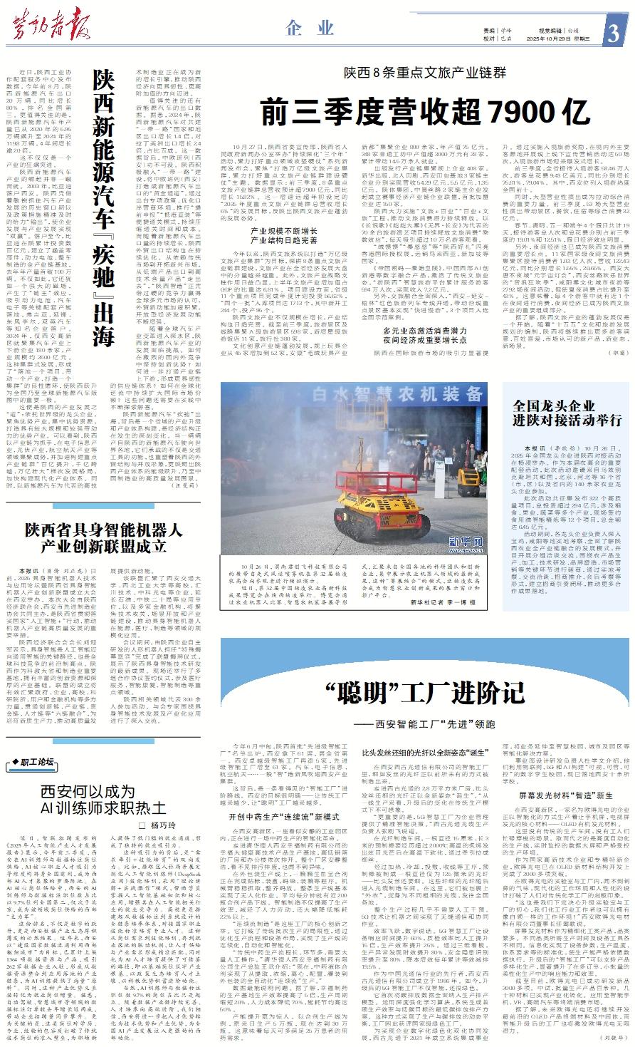 今年6月中旬,陕西首批“先进级智能工厂”名单出炉,西安拿下61席,居全省第一。西安卓越级智能工厂再添5家,先进级智能工厂增至61家。汽车、电子信息、航空航天……一股“智”造新风吹遍西安产业集群。 这背后,是一条看得见的“智能工厂”进阶路线。西安的目标很明确——让传统工厂越来越少,让“聪明”工厂越来越多。开创中药生产“连续流”新模式 在西安高新区,一座看似安静的工业园区内,正在进行一场中药生产的智能化革命。 走进清华德人西安幸福制药有限公司的幸福大健康高技术产品生产基地,高低错落的厂房和办公楼依次排开。整个厂区安静整洁,看不见排污排废,也闻不到异味。 在外包装生产线上,一箱箱生血宝合剂正在完成贴标、装盒、码垛、装箱等程序。机械臂稳稳抓取,整齐码放。整条生产线基本实现了无人化作业。平均每分钟就有近200瓶合剂产品下线。智能制造不仅提高了生产效率,减轻了人力劳动,还大幅降低能耗22%以上。 “连续流制造”是这座工厂的核心创新之举。它打破了传统批次生产的局限性,通过优化生产流程和设备布局,实现了生产线的连续化、自动化和智能化。 “传统中药生产流程长、环节多,需要大量人工操作。”清华德人西安幸福制药有限公司生产总监王武介绍:“现在,中药液体合剂实现了从提取、浓缩、离心、配置、灌装到外包装的全自动化“连续流”生产。” 数据最能说明问题。据了解,幸福制药的生产基地生产效率提高了5倍,生产周期缩短20%,人力成本降低70%,能耗节约高达50%。 产能提升更为惊人。以合剂生产线为例,原来日生产5万瓶,现在达到30万瓶。这意味着每天可多满足25万患者的用药需求。比头发丝还细的光纤以全新姿态“诞生” 在西安西古光通信有限公司的智能工厂里,细如发丝的光纤正以前所未有的方式被制造出来。 走进西古光通的2.8万平方米厂房,比头发丝还细的光纤正以全新姿态“诞生”。“从一线生产来看,升级后的变化在传统生产模式下不可想象。 “更重要的是,5G智慧工厂为企业管理提供了精准智能决策。”西古光通光缆生产负责人张刚飞说道。 在光纤制造车间,一根直径15厘米、长3米的预制棒要经历超过2000℃高温的炙烤发出炫目光芒后在高温下软化,通过牵引拉成细丝。 经过加热、冷却、投敷、收线等工序,预制棒被制成一根直径仅为125微米的光纤——比头发丝还要细。这些纤细的光纤随后进入光缆制造车间。在这里,它们被包裹上“外衣”,变身为不同粗细的光缆,发往全国各地。 整个生产过程几乎不需要人工干预。5G技术让机器之间实现了无缝通信和协同作业。 效率飞跃,数字说话。5G智慧工厂让设备响应时间提升60%,质检效率比人工提升15倍,生产效率提升25%。通过三维看板,生产异常发现时效提升80%,安全隐患识别率提升至80%,降本增效每年累计等效减排19.5%。 作为中国光通信行业的先行者,西安西古光通信有限公司成立于1986年。如今,升级后的5G智能工厂不仅智能,还很绿色。 它首次将碳排放数据全面纳入生产排产模型。运用深度强化学习算法,系统生成兼顾生产效率与低碳目标的最低碳排放排产方案。这种方式实现了生产与碳排放的动态平衡,工厂因此获评国家级绿色工厂。 为实现企业数字化绿色化双化协同发展,西古光通于2021年成立系统集成事业部,将业务延伸至智慧校园、城市及园区等智能化解决方案。 事业部设计研发负责人杜学文介绍,他们利用物联网、5G和AI构建“可视、可管、可控”的数字孪生校园,现已落地西安十余所学校。屏幕发光材料“智造”新生 在西安高新区,一家名为欧得光电的企业正以智能化的方式生产着让手机屏、电视屏发光的核心材料——OLED有机发光材料。 这里没有传统的生产车间,没有工人们忙碌穿梭的场景。取而代之的是高度自动化的生产线、实时监控的数据大屏和严格受控的生产环境。 作为国家高新技术企业和专精特新企业,欧得光电已在OLED新材料结构开发上完成了2000多项突破。 在欧得光电的实验室与工厂内,闻不到刺鼻的气味,现代化的工作环境和人性化的设计打破了人们对传统化学工厂的刻板印象。 “这也是我们下定决心升级实验室与工厂的初心,我们化工行业工作者也可以拥有像白领一样的工作环境!”西安欧得光电材料有限公司董事长任莺歌说。 屏幕发光材料作为精细化工类产品,品类繁多。不同品类所需生产时间及设备工具各不相同。信息化实现了设备参数、生产温度、体系要求等的标准化,使生产能严格依循数据执行。升级后的“智能工厂”可以支持产品多样化生产,显著提升了在多订单、小批量的柔性化生产中的响应能力和效率。 截至目前,欧得光电已成功研发新品3000多项。中试、批量生产产品百余种。几十种材料已实现产业化转化。应用至智能手机、VR、高端汽车等终端消费市场。 据了解,未来欧得光电还将继续开发最前沿的OLED产品终端材料及中间体,而智能升级后的工厂也将激发欧得光电无限潜力。 (刘骁华)