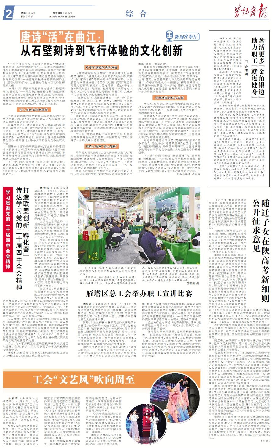 “三月三日天气新,长安水边多丽人”“曲江水暖花千树,有底忙时不肯来”……当唐诗的韵律持续在大唐不夜城的灯火中悠然回响;当曲江飞行剧院以科技为骨、文化为魂,让观众穿越时空览诗城;当大唐芙蓉园的唐诗峡引领游客沉浸在诗画交融的梦幻世界……曲江这片被千年诗情浸润的土地,正以创新的姿态,让盛唐的气韵与当代的脉搏同频共振。 10月31日,西安市政府新闻办组织“‘诗道终南 心意长安’——西安市打造唐诗之都”曲江新区主题采访活动,走进大唐不夜城、曲江飞行剧院、大唐芙蓉园唐诗峡、唐城墙遗址公园等点位,中省市媒体通过观看唐诗主题文艺节目、参与答诗互动等形式,共同见证这场以诗为魂的文化盛宴。步入盛唐的诗意画卷 大唐芙蓉园作为全方位展示盛唐风貌的大型文化主题公园,是“唐诗之都”建设的核心载体,通过多层次手段活化唐诗文化。 在氛围营造上,唐诗峡将石刻诗篇与自然景观融合,构建出“诗景一体”的沉浸式空间。在诗人IP活化上,通过《大唐追梦》等演艺项目,让李白、杜甫等诗人从历史中“走”出来,成为可亲可感的鲜活形象。在活动赋能上,创新推出唐诗接力赛等互动活动,推动唐诗从静态文字转变为动态的现代体验。 园区内丰富的诗词演出构成了立体的诗意网络:《长安诗会》以互动形式为商圈引流;《鹿柴》在唐诗峡情景再现王维的诗意禅境;《舟上诗画》于水域激情吟诵《琵琶行》;《阳台诗会》则以趣味密盒形式深度解读杜诗。 下一步,园区将围绕“深化体验”进行升级。计划在2025年新春灯会打造“诗词灯会”,以光影为诗赋形,并对经典演出《鼓》进行升级,强化“诗乐共鸣”,推动唐诗文化融入更深层次的体验之中。可感可触的沉浸式诗境 大唐不夜城作为全国首个沉浸式唐文化主题街区,探索出“盛唐文化+文旅经济”的独特发展模式,在“唐诗之都”建设中形成了系统布局。文化景观与IP活化并重,街区以“大唐群英谱”雕塑群再现文坛璀璨,奠定宏大历史背景。通过《华灯太白》等行为艺术,让李白、杜甫等诗人从历史走入现实,成为可与游客互动问答的“明星”和“文化向导”,实现诗人IP的创造性转化与活化。 “诗意长安”灯光装置营造出“一步一诗”的梦幻场景。而“太白三百杯”酒品、“唐诗烧”等特色商品,则将唐诗意境深度植入消费体验,形成可感、可品、可购的完整闭环。曲江华物文创旗舰店更以“盛唐文化的现代表达”为核心,通过场景化设计,让唐风元素融入现代生活美学。 与此同时,诗意演艺赋能街区活力。众多演出以唐诗为魂,形式新颖多元:《诗弦潮韵》用吉他萨克斯、混搭演绎王维诗句,开创“诗乐潮玩”新风尚;《青莲剑歌》再现李白诗意江湖;《琵琶行》以舞诵展现经典共情。这些演出使唐诗从文字变为可感可赏的立体艺术。 下一步,街区将聚焦2026年长安灯会,以唐诗为魂串联商业与演艺资源,打造集观赏、互动、消费于一体的文商旅超级场景。科技为唐诗“插上翅膀” 用年轻人喜欢的形式,让优秀传统文化“火”起来。坐落于大唐不夜城街区内的曲江飞行剧院,处处隐藏着“盛唐密码”,光晕倒影间,“李白”从中走出,随口吟出“长安一片月,万户捣衣声”,有游客立刻接话:“秋风吹不尽,总是玉关情!”一唱一和间,盛唐的诗意就飘进了心里。 曲江飞行剧院为全球首座以唐诗为主题的飞行乐园,以科技为骨,文化为魂,让观众穿越时空帷幕,独览一整座诗城。 剧院将引入国际领先的沉浸式飞行座舱系统,通过180度球幕投影、全息影像、多声道环绕音效及动感座椅等先进技术,实现观众“飞越唐诗长安”的沉浸式体验。在内容创作方面,围绕李白、杜甫、王维、白居易等唐代诗人经典诗篇进行主题设计,将每首诗歌化作一幅画卷,搭配音乐音效,演绎唐诗中的意境,以长安城、灞桥、曲江池等历史文化地标为主要场景,打造兼具文学意境与视觉冲击力的数字化剧目。诗意栖居的城市长廊 全长4.2公里的开放式唐城墙遗址公园,是在唐长安城外郭城遗址上建成。公园以唐诗人物和意境为主题,打造了一条集诗歌、美学与生态于一体的休闲文化长廊。 公园紧扣“唐诗之都”建设,践行“以诗造景、以景传诗”理念,将唐诗通过书法、雕塑、壁画等艺术形式融入景观。不仅拥有诗词壁画、碑刻等静态展示,更创新设置了唐诗迷宫、回音壁吟诗坛等国内少有的互动设施,让游客在探索与诵读中亲近诗句,使公园成为一座开放的“唐诗课堂”。李白的《早发白帝城》等名篇化为可视的雕塑,让唐诗从文字变为可感的视觉符号。 此处不仅是遗址保护区,更是诗词交流的“活态平台”。通过举办“诗意风雅集”社区诗会等活动,设置诗词接龙、场景互动等环节,让唐诗从静态景观走向市民的动态生活,成为连接古今的精神纽带。 下一步,公园将围绕“场景营造”与“活动赋能”深化体验。一方面,通过季节性布景还原“诗画意境”,并邀请演员扮演诗人进行情景互动;另一方面,将打造常态化的“全民诗会”品牌,结合传统节气主题,让唐诗从“文人雅事”真正走进“全民生活”,成为可触可感、可共享的城市文化空间。 全媒体记者 唐玉洁