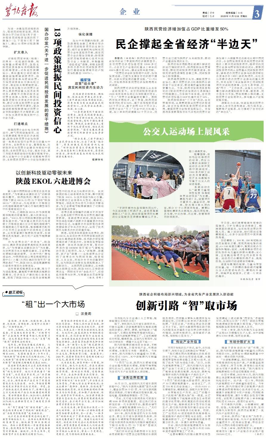 本报讯 (杨晓梅) 陕西省统计局日前发布的前三季度陕西经济数据显示,全省民营经济增加值增至12800多亿元,占全省生产总值的比重从上半年的49.8%提升至50%,提前实现年度目标。 “民营经济总体呈现稳中向好、加快发展态势,已成为支撑全省经济稳中提质、向新向好发展的重要支柱。”11月6日,省发展改革委民营经济发展局局长刘斌说。 陕西民营经济良好发展势头从去年一直延续至今。全省民间投资增速自2024年开年由负转正后保持高位增长,“五上”民营企业数量稳定攀升。据陕西省统计局统计,前三季度,陕西民间投资同比增长9.8%,高于全部投资增速6.9个百分点,高于全国12.9个百分点;民营企业在“五上”企业中的占比超八成,较上半年同期提高0.2个百分点,民营企业已成为陕西扩大有效投资、推动产业蓬勃发展的主力。 陕西省统计局副局长胡清升解读经济运行情况时表示,陕西坚持优化营商环境,降低民间投资项目融资成本,持续用好新型政策性金融工具,民间投资信心持续提振。 陕西是国资国企大省,提振民营企业信心、提升民营经济占比是陕西在新形势下应变求变、推进高质量发展的重要着力点。今年,陕西省发展改革委制定的《促进民营经济发展的七条措施》中明确提出,力争到今年年底,全省民营经济增加值占GDP比重不低于50%。 陕西持续深化“三个年”活动,优化营商环境,认真贯彻落实民营经济促进法,设立省发展改革委民营经济发展局,提振民营企业投资发展信心。省发展改革委推荐我省有代表性的民营企业参加第十六届夏季达沃斯论坛和中国民洽会,在全国发展改革系统民营经济现场会上推介民间投资项目,组织省内民营企业参与国家投贷联动试点,推荐民间投资项目纳入全国重点民间投资项目库,储备适合民营企业参与的政府和社会资本合作(PPP)新机制项目,向社会公开推介适合民营企业参与的重大项目,并且连续三年实施新开工民间投资项目贷款贴息政策,出台七条举措、打造“四个一”工作体系、实施七大行动,着力解决政策知晓率不高、融资难、民企竞争力不强、营收规模小等问题,支持民营企业发展壮大,参与重点产业链延链补链。 政策有力有效,快速发展的民营企业嵌入全省先进制造业、现代服务业、能源等产业链条,有力撑起了全省经济的“半边天”。