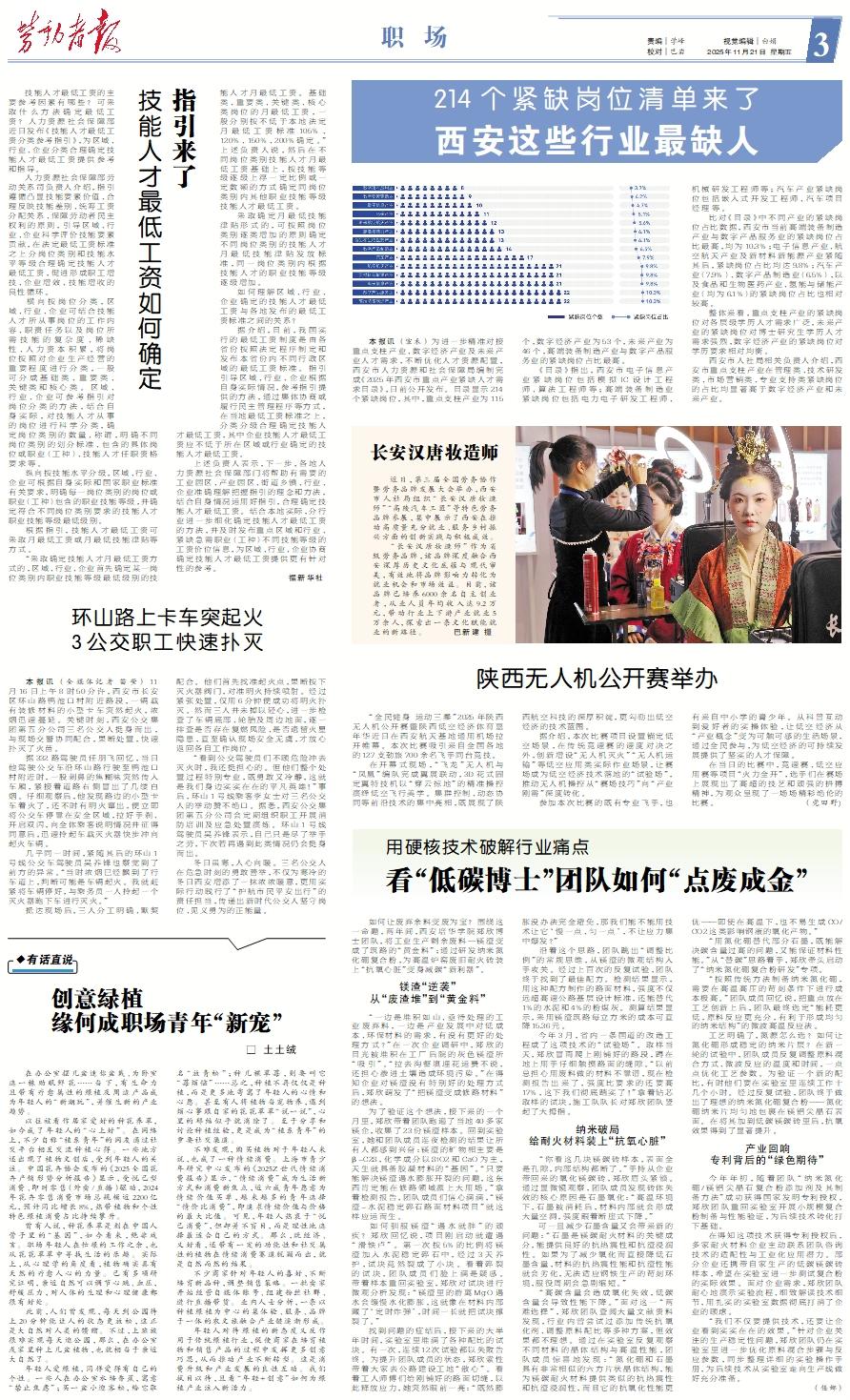本报讯 (宗禾) 为进一步精准对接重点支柱产业、数字经济产业及未来产业人才需求,不断优化人才资源配置,西安市人力资源和社会保障局编制完成《2025年西安市重点产业紧缺人才需求目录》,日前公开发布。目录显示214个紧缺岗位,其中,重点支柱产业为115个,数字经济产业为53个,未来产业为46个,高端装备制造产业与数字产品服务业的紧缺岗位占比最高。 《目录》指出,西安市电子信息产业紧缺岗位包括模拟IC设计工程师、算法工程师等;高端装备制造业紧缺岗位包括电力电子研发工程师、机械研发工程师等;汽车产业紧缺岗位包括嵌入式开发工程师、汽车项目经理等。 比对《目录》中不同产业的紧缺岗位占比数据,西安市当前高端装备制造产业与数字产品服务业的紧缺岗位占比最高,均为10.3%;电子信息产业、航空航天产业及新材料新能源产业紧随其后,紧缺岗位占比均达9.8%;汽车产业(7.9%)、数字产品制造业(6.5%),以及食品和生物医药产业、氢能与储能产业(均为6.1%)的紧缺岗位占比也相对较高。 整体来看,重点支柱产业的紧缺岗位对各层级学历人才需求广泛,未来产业的紧缺岗位对博士研究生学历人才需求强烈,数字经济产业的紧缺岗位对学历要求相对均衡。 西安市人社局相关负责人介绍,西安市重点支柱产业在管理类、技术研发类、市场营销类、专业支持类紧缺岗位的占比均显著高于数字经济产业和未来产业。