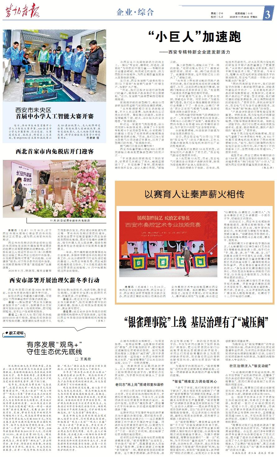 在城市治理的末梢神经,一句邻里抱怨、一桩物业琐事,这些看似不起眼的“褶皱”,若不能及时抚平,便可能演变成撕裂社区和谐的裂痕。如何为基层治理装上灵敏的“减压阀”,筑牢矛盾化解的第一道防线?在西安市碑林区朱北社区,“银雀理事院”正以其生动的实践,交出了一份鲜活答卷。 这一由碑林区长安路司法所牵头,在人民调解“碑林 365”模式基础上延伸拓展的创新平台,紧密结合社区实际,为矛盾纠纷化解注入了全新活力。老同志“再上岗”搭建邻里和谐桥 在老旧小区与单位家属院交织的朱北社区,曾长期面临治理结构多元、矛盾纠纷易发的挑战。今年9月,长安路司法所与社区党委开展联合走访。走访中发现,社区内“藏龙卧虎”,居住着8名平均年龄65岁的退休检察官和老政法干警。 这群老同志不仅身怀专业的法律素养与丰富的办案经验,更对服务社区、发挥余热抱有赤诚之心——这正是基层调解工作中求之不得的专业力量。司法所与社区党委迅速行动,以党建为引领,创新构建起“党建+司法+银发人才”三位一体的工作机制,成功破解了社区治理的被动局面。 将老同志的专业优势与社区治理需求精准对接,“银雀理事院”应运而生。平台取名“银雀”,既寓意退休人员如“银发”般珍贵,又象征调解工作能像“雀鸟衔枝”一样,搭建起邻里间的和谐桥梁。这个集矛盾调解、法律咨询、法治宣传等功能于一体的综合性服务平台,不仅为老同志提供了发挥余热的广阔舞台,更让社区居民在家门口就能享受到优质便捷的法律服务。老同志们用通俗易懂的语言为居民讲解法律知识,用亲身经历过的案例化解邻里纠纷,成为社区里的“和谐使者”。 为确保平台规范运行,“银雀理事院”还同步建立起标准化调解流程,让每一项调解都兼具法理的严谨与情理的温暖。“银雀”精准发力调处暖民心 “多亏了老张,我们两家的矛盾终于解决了,现在邻里关系也和睦了!”提起“银雀理事院”的调解员张勇谋,社区居民王姐赞不绝口。王姐家曾因阳台漏水与邻居发生严重摩擦,“银雀理事院”的调解员张勇谋见两家因此伤了和气,主动介入调解——既从法律角度为双方剖析利弊,又以“远亲不如近邻”的情理疏导情绪。经过多次耐心沟通协调,最终以邻居主动维修、双方握手言和画上圆满句号。 在“银雀理事院”,像张勇谋这样善解“千千结”的银发调解员并非个例。他们凭借多年积累的法律专业素养和洞察人情世故的丰富经验,在法理与情理之间找到最佳平衡点。为提升调解精准度,理事院创新推行“一案一议”机制,为不同纠纷“量体裁衣”:面对物业矛盾,启动由社区、司法所、派出所及检察院退休干部组成“四方联调”机制;处理家庭纠纷,则采用“情感疏导+法律释明”相结合的模式,实现定分止争与情感修复的双重效果。 为确保这支“银发智囊团”的专业能力持续在线,司法所还联合社区定期邀请专业律师,为老同志开展法律前沿知识讲座与调解技能提升培训,让他们的知识库始终与时俱进,为基层治理持续注入专业活力。社区治理注入“银发动能” “以前遇到问题不知道该找谁,现在不仅学到了实用法律知识,还懂得了用合法途径维护权益。”自从有了“银雀理事院”,居民们真切感受到了社区治理的明显变化。 截至目前,理事院已经成功化解邻里纠纷、物业矛盾、家庭琐事等各类民生诉求15起,调解成功率实现100%。 这一创新平台并未止步于矛盾发生后的被动化解,而是将工作重心前移,构建起一套行之有效的预防机制。短短3个月,通过理事院,司法所、社区累计开展法律知识讲座8场,发放普法宣传资料200余份,直接覆盖居民超1000人次,不仅向居民普及了法律知识,还提升了居民的法律意识和维权意识。 “理事院对我们这些退休政法干警而言是发挥余热的好平台。”调解员张勇谋感慨道。在这里,他们多年积累的法律专业素养与办案经验有了用武之地,既丰富了退休后的精神文化生活,实现了个人价值的再提升,又为社区治理注入了宝贵的“银发动能”,真正达成“退休人才再发光”与“基层治理提质效”的双向共赢。 全媒体记者 唐玉洁 通讯员 程拓