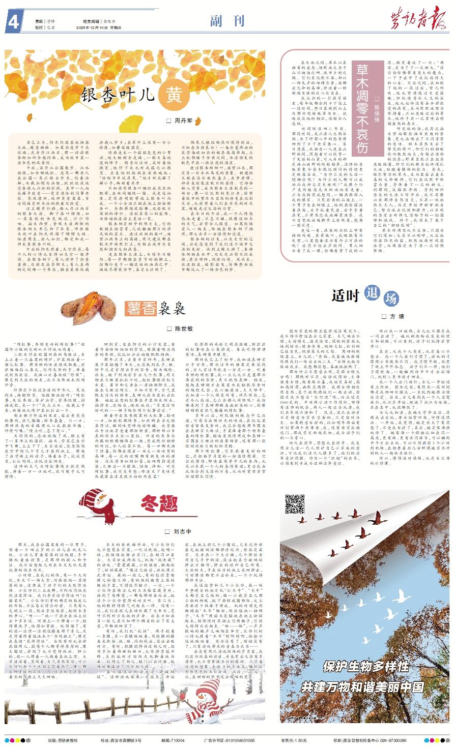 虽已立冬,阳光仍温柔地洒落大地,暖意融融。如果你漫步于北环路,或者丹江南岸,那一排排银杏树如碎金般闪烁,成为城市里一道金色的风景线。 午后,沿丹江公园散步。江水潋滟,如金鳞跳跃。忽见一群老人在公园一角正褪去外衣,仅着泳裤,头戴泳帽与泳镜,跃跃欲试地准备投入江水的怀抱。其中一人向我挥手致意——竟是退休的同事老张。寒风凛冽,他却笑意盈盈,言谈间满是对冬泳的执着与热爱。 过王塬步行桥,踏入丹江南岸的银杏大道。脚下落叶铺陈,如一层柔软的金色绒毯,沙沙作响。抬头西望,景观大道两侧的银杏树大半已卸下华裳,唯余枝头残叶在阳光照耀下熠熠生辉。恰逢周末,游人如织,都是和我一样来看银杏叶的。 午后的阳光照着,天空很蓝,每个人的心情也变得如天空一般开阔。在银杏树下,有人撑开了折叠桌椅,与朋友品茶聊天;有人在两树之间绑一个吊床,躺在里面优哉游哉入梦乡;在草坪上还有一些小帐篷,如蘑菇般漂亮。 迎面走来一个摇摇晃晃的小男孩,他大概刚会走路,一副天真烂漫的样子。错身而过时,我对着他微笑,他停下来也对我报之以微笑。直至他的妈妈在前面喊他:“快给爷爷说再见。”他才对我挥了挥小手,蹒跚着离开。 不知谁用银杏叶编织成长长的飘带,在林间缠绕一圈。我走近细看,是用透明胶带粘上银杏叶而成。一个小女孩正蹴在地上捡拾银杏叶。金飘带随风轻舞,宛若秋日写就的诗行。这别具匠心的装饰,为静谧林道添上灵动一笔。 银杏树是树中的伟丈夫,它的枝梢直指苍穹,几欲触碰那片纯净无瑕的蓝天。透过疏朗的枝叶,遥望江南耸立的高楼,现代建筑群在秋光中静默伫立,勾勒出城市与自然和谐共生的画卷。 走在银杏大道上,头顶冬日暖阳,每一步都踏在季节的韵脚上,仿佛行走于一幅流动的油画之中。满城尽带黄金甲,真是太壮观了。 偶见几株玫瑰依旧深情绽放,不知在为谁表白?一朵含苞待放的花骨朵被细长的枝条高高举起,点点红艳缀于金黄之间,为这静美的秋色平添一抹浪漫的温度。 透过银杏树树叶,遥望江北,那是另一处车水马龙的景象。新建的大楼在远处巍然矗立,庄重肃穆,却并未割裂这秋日的柔情。它静静融入背景,成为银杏大道秋色的一部分,像一位沉默的见证者,凝望着城市的繁华与自然的静美在此刻交会,也凝望着人们在金色的时光里,缓缓走过生活的日常。 在冬日的午后,我一个人慢悠悠地走着,不急不躁,就像这初冬的天气,非常令人惬意。如果能陪爱人一起来,给她在银杏树下拍照,那又会多一分温情和浪漫。 银杏树的壮美,以及天空的辽阔,让我感受到了我们这个城市生活的美好。快到王塬大桥了,看桥体倒映在水中,与天光云影交织成趣,虚实难辨,恍若幻境。风吹来,水波轻漾,楼影摇曳,仿佛整座城市都沉入了一场金色的梦。