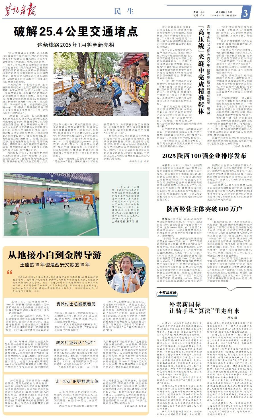 清晨6点40分,天还没有亮,客房里的学生们仍在熟睡,王佳已经走进酒店餐厅。她举起手机核对餐食清单,又跟餐厅领班反复确认,确保孩子们起床就能吃上热乎饭。再过1小时,研学队伍就要奔赴安定门开启一天的行程。王佳随手喝了碗稀饭,揣了个全麦面包,就开始对接景点的消息,她得赶在学生出发前,提前抵达对接现场工作人员。这样的早出晚归,只是她工作日常的一部分。真诚付出总能被看见 这份日常,一坚持就是18年。2007年,怀揣着对西安城墙的一见钟情和对古城文化的热爱,非旅游专业出身的王佳正式踏入导游行业,成为一名地接导游。 从业初期的道路并不平坦。初入职场便要面对游客的直接反馈和各种突发状况,委屈时常涌上心头。但正是这些磨练,让她快速成长,逐渐练就了出色的组织协调能力和问题处理能力。2009年,她带领南京老年团前往延安、壶口瀑布,彼时路况不佳,5小时的车程里,她与老人们谈天说地,贴心照料。行程结束时,老人们对她纷纷夸赞不已。 “人和人之间的情感链接最珍贵,真诚的付出总能被看见。”王佳这样总结自己的服务理念。 2012年,王佳转型为出境领队,足迹遍布50个国家。从输出本土文化到带领国人走向世界,她的角色转变背后,是西安旅游从“引进来” 到 “走出去”的拓展。2013年《旅游法》的实施,让导游行业告别了粗放式发展,走向规范化、职业化。王佳敏锐地意识到专业能力的重要性,开启了 “旺季工作、淡季学习”的模式,努力从“讲解员”向“复合型导游人才”转变。成为行业公认“名片” 自2017年开始,西安文旅迈入转型升级与品牌爆发阶段,大唐不夜城火爆出圈,“文旅融合”“智慧旅游”成为关键词。面对市场变化,王佳再次调整步伐,从出境领队转型为政务、商务接待的核心力量,承接了第十届西部文博会、第九届丝绸之路艺术节等重大活动。她还作为总领队带领近200人前往哈萨克斯坦阿拉木图,完成中国中亚人文专列活动,为中国中亚峰会打前站。不同于传统带团,商务接待对礼仪规范、政治敏感度和个性化服务要求极高。她根据不同团队特点调整讲解方式,用专业与细致赢得了各方认可。2023年,她荣获西安市五一劳动奖章,成为行业公认的“名片”。 “导游是民间外交家,一言一行都代表着城市和行业的形象。”这是王佳常挂在嘴边的话。在她看来,导游的职业价值在于“被需要、被肯定”,而这份价值的实现,始终与西安文旅的发展同频共振。从早期依赖传统历史遗迹的观光游,到如今融合科技与创意的沉浸式体验;从2006年2738.7万人次的游客量,到2024年突破3亿人次的文旅热潮,王佳既是西安文旅发展的见证者,更是参与者和推动者。让“长安”IP更鲜活立体 如今的王佳,不仅活跃在一线接待现场,更肩负起行业传承的重任。2023年,她作为核心成员参与组建西安金牌导游团队,筛选100位新晋导游进行系统培训,最终打造出20人的核心队伍。她奔走于厦门、西安等地授课,分享“文博精讲”与“成长之路”的经验;手把手指导徒弟打磨稿件、调整仪态,助力他们在文旅推荐官大赛中斩获一等奖。 从22岁初出茅庐的青涩导游,到如今沉稳从容的行业领军人,王佳的二十年从业路,恰似西安文旅的发展缩影,在坚守中沉淀,在变革中成长。 西安文旅的蓬勃发展,离不开成千上万像王佳这样的从业者。他们顺应行业变革,不断提升自我,从传统导游到文化传播者、体验设计师,在时代浪潮中找准定位;他们以城为家,以文为媒,让每一位游客感受古城的温度与魅力。正如西安从历史深处走来,在文旅融合与科技赋能中焕发新生,王佳们的坚守与成长,也让 “长安”这座城市IP更加鲜活立体。 全媒体记者 焦芃滈
