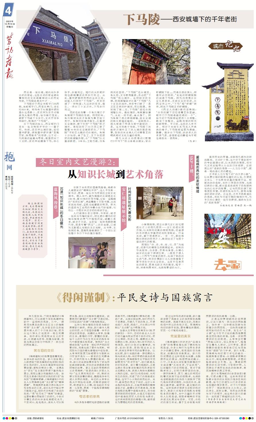 继上期探访方所、美术博物馆与ROC科技交互场之后,本期我们继续深入城市的肌理,开启新的冬日漫步。这是一趟在温暖空间里完成的穿越:推开三扇截然不同的门,在知识构筑的巨墙下徜徉,于盛唐的烟火光影中驻足,并与当下最柔软的情绪安然对话,愿文艺的光温暖整个季节。蓝海风漫巷:沉浸“知识长城”的冬日暖光 坐落于未央区的蓝海风漫巷,是都市人最坚实的“精神庇护所”,这儿不仅是一家书店,更是一座以书为脊梁的立体文化城市。踏入其中,最为震撼的无疑是全长240米、高18米的巨型书墙,它如一道巍峨的“知识长城”,承载着数十万册书籍,从地面拔地而起,直抵光线朦胧的穹顶。原木的温润与工业风的冷静在此巧妙碰撞,勾勒出一个既宏伟又亲切的阅读宇宙。 人们散落在悬空楼梯、书架间,或寻一处面向书墙的座位,时光便在翻书的轻响与咖啡的香气中缓慢沉淀,或静心备考,或亲子共读。这里每一处转角都暗藏巧思,那条写着“西安”二字的走廊,已成为无数镜头定格的文艺地标。从书香、文创到轻食,蓝海风漫巷提供了一个足以安放整个冬日下午的复合暖居。安仁坊遗址展示馆:时间折页处的大唐光影 小雁塔南侧,建立在唐代安仁坊宅邸遗址之上的现代建筑——安仁坊遗址展示馆,以其独特的黑白极简风格,将盛唐的市井烟火举重若轻地托至眼前。行走其间,脚下即是原址,一步一行,都仿佛踏在时间的回音之上,瞬间拉近了与那个遥远时代的距离。 展馆以“诗、乐、衣、住、灯、茶”为线索,将唐代的精致生活娓娓道来。仿制的华美服饰、古乐器、茶具与食器,在精心设计的光影下熠熠生辉。二楼关于唐人与二十四节气饮食的展示,充满了鲜活的生活气息,环形巨幕影片让人仿佛置身于繁华而有序的长安里坊。这里不仅是历史的课堂,更是光影艺术的殿堂,随手一拍,皆是构图考究、充满故事感的大片。SKP十楼:邂逅城市高处的柔软情绪 离开历史的厚重,来到现代都市的时尚高地。在SKP十楼,这个位于商业体中的专业画廊空间,以其活跃的策展,将当代艺术实践带入公众的日常视野。近期展出的“柔软的角落——儿力力个展”,便是一场治愈心灵的邂逅。 艺术家儿力力笔下的“白日梦小姐”,以其星空般的眼眸与蓬松的头发,引领观众步入一个私密而轻盈的情绪宇宙。细腻流动的色彩、化作小怪兽的泪珠、充满幻想的小窝,都在温柔诉说关于自我接纳与内心庇护的故事。它与同层的唐三彩等展览并置,形成传统与当代、器物与情感的奇妙对话。在这里,艺术不再是遥远的展品,而化为可感可触的情绪共鸣,为冬日内心提供一处可供停顿、漫游与生长的“柔软角落”。 全媒体记者 常皓萱 焦一鹤