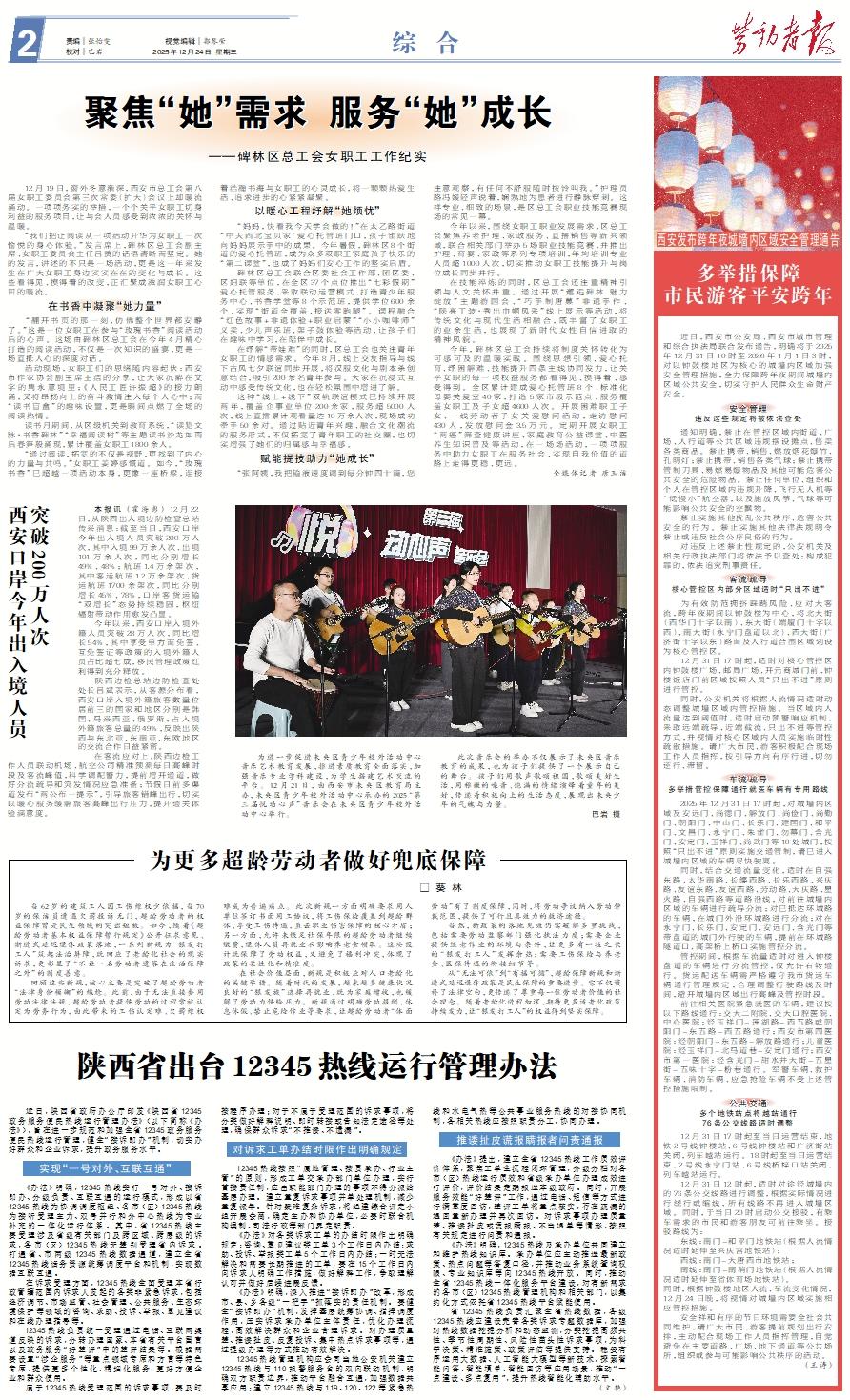 12月19日,窗外冬意渐深,西安市总工会第八届女职工委员会第三次常委(扩大)会议上却暖流涌动。一项项务实的举措,一个个关乎女职工切身利益的服务项目,让与会人员感受到浓浓的关怀与温暖。 “我们让阅读从一项活动升华为女职工一次愉悦的身心体验。”发言席上,碑林区总工会副主席、女职工委员会主任吕贇的话语清晰而坚定。她的发言,讲述的不只是一场活动,更是这一年来发生在广大女职工身边实实在在的变化与成长。这些看得见、摸得着的改变,正汇聚成滋润女职工心田的暖流。在书香中凝聚“她力量” “翻开书页的那一刻,仿佛整个世界都安静了。”这是一位女职工在参与“玫瑰书香”阅读活动后的心声。这场由碑林区总工会在今年4月精心打造的阅读活动,不仅是一次知识的盛宴,更是一场直抵人心的深度对话。 活动现场,女职工们的思绪随内容起伏:西安市作家协会副主席王洁的分享,让大家沉醉在文字的隽永意境里;《人民工匠许振超》的接力朗诵,又将昂扬向上的奋斗激情注入每个人心中;而“读书盲盒”的趣味设置,更是瞬间点燃了全场的阅读热情。 读书月期间,从区级机关到教育系统,“读览文脉·书香碑林”“幸福阅读树”等主题读书沙龙如雨后春笋般涌现,累计覆盖女职工1800余人。 “通过阅读,拓宽的不仅是视野,更找到了内心的力量与共鸣。”女职工姜婷感慨道。如今,“玫瑰书香”已超越一项活动本身,更像一座桥梁,连接着浩瀚书海与女职工的心灵成长,将一颗颗热爱生活、追求进步的心紧紧凝聚。以暖心工程纾解“她烦忧” “妈妈,快看我今天学会做的!”在太乙路街道“中天西北宝贝家”爱心托管班门口,孩子雀跃地向妈妈展示手中的成果。今年暑假,碑林区8个街道的爱心托管班,成为众多双职工家庭孩子快乐的“第二课堂”,也成了妈妈们安心工作的坚实后盾。 碑林区总工会联合区委社会工作部、团区委、区妇联等单位,在全区37个点位推出“七彩假期”爱心托管服务,采取联动运营模式,打造青少年服务中心、书香学堂等8个示范班,提供学位600余个,实现“街道全覆盖、接送零跑腿”。课程融合“红色故事+非遗体验+职业启蒙”“小小咖啡师”义卖、少儿声乐班、架子鼓体验等活动,让孩子们在趣味中学习,在陪伴中成长。 在纾解“带娃难”的同时,区总工会也关注青年女职工的情感需求。今年8月,线上交友指导与线下古风七夕联谊同步开展,将汉服文化与剧本杀创意结合,吸引200余名青年参与。大家在沉浸式互动中感受传统文化,也在轻松氛围中增进了解。 这种“线上+线下”双轨联谊模式已持续开展两年,覆盖企事业单位200余家,服务超5000人次,线上直播累计观看量达10万余人次,现场成功牵手50余对。通过贴近青年兴趣、融合文化潮流的服务形式,不仅拓宽了青年职工的社交圈,也切实增强了她们的归属感与幸福感。赋能提技助力“她成长” “张阿姨,我把输液速度调到每分钟四十滴,您注意观察,有任何不舒服随时按铃叫我。”护理员路冯媛轻声说着,娴熟地为患者进行静脉穿刺。这样专业、细致的场景,是区总工会职业技能竞赛现场的常见一幕。 今年以来,围绕女职工职业发展需求,区总工会聚焦养老护理、家政服务、直播销售等新兴领域,联合相关部门举办5场职业技能竞赛,并推出护理、育婴、家政等系列专项培训,年均培训专业人员超1000人次,切实推动女职工技能提升与岗位成长同步并行。 在技能淬炼的同时,区总工会还注重精神引领与人文关怀并重。通过开展“邂逅碑林 魅力绽放”主题游园会、“巧手制唐菓”非遗手作、“陕亮工装·秀出巾帼风采”线上展示等活动,将传统文化与现代生活相融合,既丰富了女职工的业余生活,也展现了新时代女性自信进取的精神风貌。 今年,碑林区总工会持续将制度关怀转化为可感可及的温暖实践。围绕思想引领、爱心托育、纾困解难、技能提升四条主线协同发力,让关乎女职的每一项权益服务都看得见、摸得着、感受得到。全区累计建成爱心托管班8个、标准化母婴关爱室40家,打造5家市级示范点,服务覆盖女职工及子女超4600人次。开展困难职工子女、一线劳动者子女关爱慰问活动,走访慰问430人,发放慰问金3.5万元。定期开展女职工“两癌”筛查健康讲座、家庭教育公益课堂、中医养生知识普及等活动,在一场场活动,一项项服务中助力女职工在服务社会、实现自我价值的道路上走得更稳、更远。 全媒体记者 唐玉洁