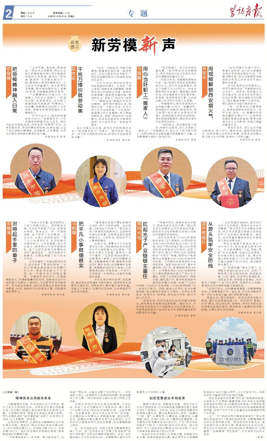 佘俊锋把劳模精神融入日常 “这份荣誉,是鼓励,更是使命。”西安市劳动模范、西安庆安航空机械制造有限公司车铣复合班组班长佘俊锋,始终以“零误差、高效率”为目标扎根生产一线,聚焦核心零部件精密加工、工艺优化与质量提升,攻克多项技术难题,累计解决数控加工难题100余项,完成精益改善80余项。 “劳模精神从不是口号,而是融入日常的点滴坚守。”回望奋斗路,佘俊锋深知,这份坚守是遇到技术瓶颈时“啃硬骨头”的执着,是脚踏实地钻研工序的韧劲,更是追求极致卓越的工匠精神初心。 “作为产业工人,我会把荣誉转化为动力。”佘俊锋表示,今后将继续深耕数控加工技术,紧盯行业前沿探索创新;同时发挥“传帮带”作用,分享经验技术,带动同事钻研技能、比学赶超,以实干笃行诠释劳模精神、劳动精神、工匠精神,为西安打造先进制造业集群贡献力量。 全媒体记者 苗莹赵传花千丝万缕织就劳动美 “作为一名教练员,荣誉只是激励,更重要的是扎根一线传承技艺,培养出更多的技术能手。”西安纺织集团细纱车间教练员赵传花表示。 工作23年来,细纱机的轰鸣声就是她的冲锋号。车间里,“带头攻坚”是她传承劳模精神,带领团队攻克纱线断头率高、效率波动等难题,探索更优操作法,推动团队从“要我干”转变为“我要干”;“脚踏实地”是她内化的劳动精神。她手把手指导工友,细致纠正每一个接头手势,在平凡的工序中追求卓越;“守正创新”是她坚守的工匠精神,学习智能纺织技术,创新“师徒结对”培训模式,将多年经验转化为标准化教材,为车间培养出一批批技术能手。 走出表彰大会会场,赵传花的话语坚定有力:“我将做好技艺‘传承人’,勇当创新‘排头兵’,用千丝万缕织就劳动美,持续为企业发展贡献力量。” 全媒体记者 唐玉洁马海腾用心当好职工“娘家人” “我只是做了一名工会主席该做的事。”获评西安市劳动模范后,西安市物流行业工会联合会主席马海腾更觉重任在肩。 任职五年来,马海腾深耕物流行业一线,把货车司机的急难愁盼挂在心头,扛牢行业发展重任,用实干诠释工会人的担当。他走访摸排司机从业痛点,搭建暖心服务阵地,切实破解货车司机停车难、休息难、维权难等烦心事,让奔波在路上的司机们倍感工会温暖。 马海腾牵头承办多届物流行业技能大赛,培育出一批懂技术、善攻坚的行业能手;耗时两年,牵头起草《网约货车运营服务规范》,首创驾驶员资质动态核验、货主权益保障清单,推动西安成为行业规范化试点。 “新的起点,我将继续坚守岗位,深耕行业服务,用心当好职工‘娘家人’。”马海腾表示,将以实干担当践行初心,为西安物流行业高质量发展凝聚职工力量,让劳模精神在岗位上持续闪光。 全媒体记者 苗莹肖军平用视频解锁西安烟火气 “这份荣誉不只属于自己,更属于支持者、这片热土和蓬勃发展的互联网新媒体行业。”手捧劳模奖章,西安市雁塔区互联网协会网络工作者肖军平满心激动与感恩。 作为扎根西安的自媒体人,肖军平始终笃信“幸福都是奋斗出来的”。多年来,他用镜头记录古城变迁,用文字讲述普通人的奋斗故事,深刻感悟劳动的意义,既在精益求精中打磨内容,更以服务社会践行责任担当。 “每一位粉丝的点赞和留言,都是我坚持创作的动力。”肖军平说,网友一句“跟着你的视频读懂西安烟火气”,让他深知自媒体既是信息载体,更是连接城市与大众的桥梁,传递正能量的重要平台。 肖军平表示,将以这份荣誉为新起点,坚守初心、精进专业,深耕互联网创作,用鲜活镜头讲好西安故事,用更务实的镜头助力本土文化传播,传递向上向善力量。 全媒体记者 苗莹申锋涛对得起手里的单子 “当年父亲病重,我回到西安,干起了送餐的活儿。那时路线不熟,雪天送单摔破了衣裳,顾客没有怪我。我就这么一单一单坚持地跑,如今获评了劳动模范。这份认可,在我心里沉甸甸的。”饿了么U+B骑手队长、外卖送餐员申锋涛坦言,八年送餐路,他从单打独斗,到带领50名骑手组成团队,创下连续五年零交通事故纪录的“最强战队”。他的奔跑终于被看见,也更加明确了自己的前行方向。 这份荣誉给了申锋涛更多的动力,也让他有了更多的思考。“从前只觉得送餐就是份养家糊口的工作,风里雨里跑久了才发现,每一行都有自己的敬业精神。对得起手里的单子,对得起等饭的人,对得起跟着你的兄弟,就是我对这个行业的坚守与责任。”他表示,今后要带兄弟们跑好单。作为新业态群体,他们曾获得社会诸多关爱与帮助,未来,他愿多行力所能及之事,将温暖传递给更多人。 全媒体记者 唐玉洁冯妮娜把平凡小事做细做实 “看到蓝田县教育事业取得巨大进步,我心中满怀感恩。这份温暖,正是我前行的底气。”蓝田县北关小学教师冯妮娜坦言,这项殊荣令她无比自豪,也更坚信教育需要俯身安心、守好阵地,把每件平凡小事做细做实。 从教27年,看着孩子们从幼童成长为少年,冯妮娜深刻体会到教育在于点滴积累与无私奉献。“学校背后是千万家庭,教师肩上是千斤重任。”这份沉甸甸的责任,在她看来,需要三种劳动精神支撑:劳模精神是引领,激励带动身边同仁携手奋进;劳动精神作为根基,是脚踏实地的实干底色;工匠精神是内核,不放弃每一个孩子,不忽视每一个知识点,让教育有精度有温度。 作为扎根乡村