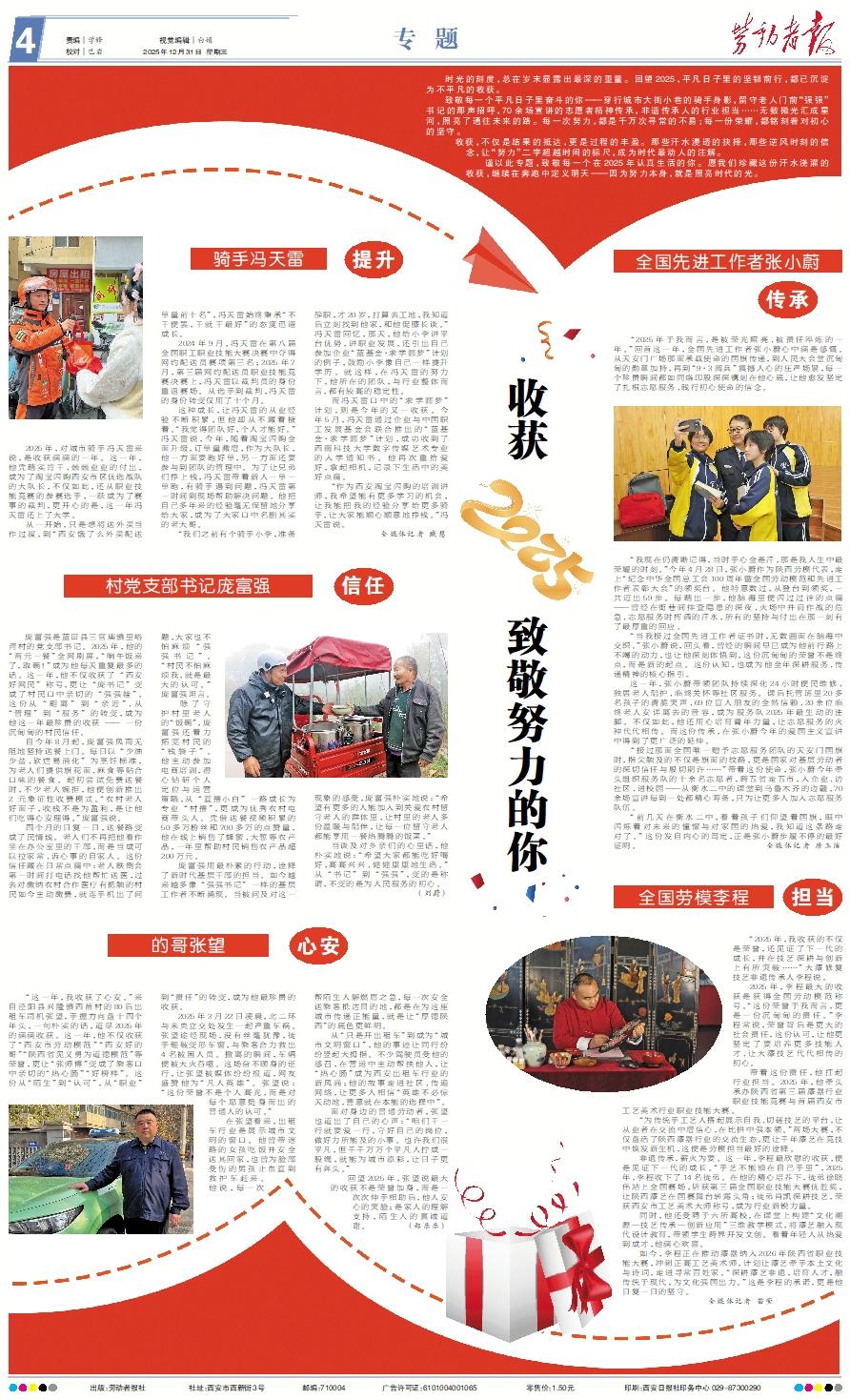 时光的刻度,总在岁末显露出最深的重量。回望2025,平凡日子里的坚韧前行,都已沉淀为不平凡的收获。 致敬每一个平凡日子里奋斗的你——穿行城市大街小巷的骑手身影,留守老人门前“强强”书记的那声招呼,70余场宣讲的志愿者精神传承,非遗传承人的行业担当……无数微光汇成星河,照亮了通往未来的路。每一次努力,都是千万次寻常的不易;每一份荣耀,都铭刻着对初心的坚守。 收获,不仅是结果的抵达,更是过程的丰盈。那些汗水浸透的抉择,那些逆风时刻的信念,让“努力”二字超越时间的标尺,成为时代最动人的注解。 谨以此专题,致敬每一个在2025年认真生活的你。愿我们珍藏这份汗水浇灌的收获,继续在奔跑中定义明天——因为努力本身,就是照亮时代的光。骑手冯天雷 提升 2025年,对城市骑手冯天雷来说,是收获满满的一年。这一年,他凭踏实肯干、兢兢业业的付出,成为了淘宝闪购西安市区优选战队的大队长,不仅如此,还从职业技能竞赛的参赛选手,一跃成为了赛事的裁判,更开心的是,这一年冯天雷还上了大学。 从一开始,只是想将送外卖当作过渡,到“西安饿了么外卖配送单量前十名”,冯天雷始终秉承“不干便罢,干就干最好”的态度迅速成长。 2024年9月,冯天雷在第八届全国职工职业技能大赛决赛中夺得网约配送员赛项第三名;2025年7月,第三届网约配送员职业技能竞赛决赛上,冯天雷以裁判员的身份重返赛场。从选手到裁判,冯天雷的身份转变仅用了十个月。 这种成长,让冯天雷的从业经验不断积累,但他却从不藏着掖着。“我觉得团队好,个人才能好。”冯天雷说,今年,随着淘宝闪购全面升级,订单量激增,作为大队长,他一方面要跑好单,另一方面还要参与到团队的管理中。为了让兄弟们挣上钱,冯天雷带着新人一单一单跑,有骑手遇到问题,冯天雷第一时间到现场帮助解决问题。他把自己多年来的经验毫无保留地分享给大家,成为了大家口中名副其实的老大哥。 “我们之前有个骑手小李,准备辞职,才20岁,打算去工地,我知道后立刻找到他家,和他促膝长谈。”冯天雷回忆,那天,他给小李讲平台优势,讲职业发展,还引出自己参加企业“蓝基金·求学圆梦”计划的例子,鼓励小李像自己一样提升学历。就这样,在冯天雷的努力下,他所在的团队,与行业整体而言,都有较高的稳定性。 而冯天雷口中的“求学圆梦”计划,则是今年的又一收获。今年5月,冯天雷通过企业与中国职工发展基金会联合推出的“蓝基金·求学圆梦”计划,成功收到了西南科技大学数字传媒艺术专业的入学通知书。他再次重拾爱好,拿起相机,记录下生活中的美好点滴。 “作为西安淘宝闪购的培训讲师,我希望能有更多学习的机会,让我能把我的经验分享给更多骑手,让大家能顺心顺意地挣钱。”冯天雷说。 全媒体记者 臧慧村党支部书记庞富强 信任 庞富强是蓝田县三官庙镇里峪湾村的党支部书记。2025年,他的“两元一餐”全网刷屏,“晌午饭来了,取碗!”成为他每天重复最多的话。这一年,他不仅收获了 “西安好网民” 称号,更让 “庞书记” 变成了村民口中亲切的 “强强娃”。这份从 “距离” 到 “亲近”、从 “管理” 到 “服务” 的转变,成为他这一年最珍贵的收获 —— 一份沉甸甸的村民信任。 自今年8月起,庞富强风雨无阻地坚持送餐上门。每日以 “少油少盐、软烂易消化” 为烹饪标准,为老人们提供旗花面、麻食等贴合口味的餐食。起初尝试免费送餐时,不少老人婉拒,他便创新推出 2 元象征性收费模式。“农村老人好面子,收钱不是为盈利,是让他们吃得心安理得。”庞富强说。 四个月的日复一日,送餐路变成了民情线。老人们不再把他看作坐在办公室里的干部,而是当成可以拉家常、诉心事的自家人。这份信任藏在日常点滴中:老人跌倒会第一时间打电话找他帮忙送医,过去对缴纳农村合作医疗有抵触的村民如今主动缴费,就连手机出了问题,大家也不怕麻烦 “强强书记”。“村民不怕麻烦我,就是最大的认可。” 庞富强坦言。 除了守护村里老人的“饭碗”,庞富强还着力拓宽村民的“钱袋子”。他主动参加电商培训,潜心钻研个人定位与运营策略,从 “直播小白” 一路成长为专业 “村播”,更成为优秀农村电商带头人。凭借送餐视频积累的50多万粉丝和700多万的点赞量,他在线上销售了蜂蜜、大葱等农产品,一年里帮助村民销售农产品超 200万元。 庞富强用最朴素的行动,诠释了新时代基层干部的担当。如今越来越多像 “强强书记” 一样的基层工作者不断涌现。当被问及对这一现象的感受,庞富强朴实地说:“希望有更多的人能加入到关爱农村留守老人的群体里,让村里的老人多份温暖与陪伴,让每一位留守老人都能享用一餐热腾腾的饭菜。” 当谈及对乡亲们的心里话,他朴实地说:“希望大家都能吃好喝好,高高兴兴、健健康康地生活。” 从 “书记” 到 “强强”,变的是称谓,不变的是为人民服务的初心。 (刘蔚)的哥张望 心安 “这一年,我收获了心安。”来自泾阳县兴隆镇西苗村的80后出租车司机张望,手握方向盘十四个年头,一句朴实的话,道尽2025年的满满收获。这一年,他不仅收获了“西安市劳动模范”“西安好的哥”“陕西省见义勇为道德模范”等荣誉,更让“张师傅”变成了乘客口中亲切的“热心肠”“好榜样”。这份从“陌生”到“认可”,
