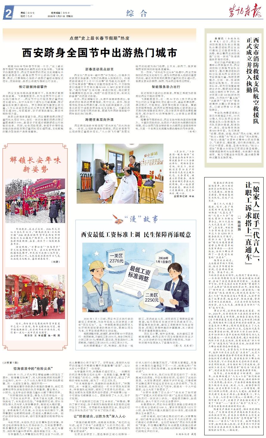 西安最低工资标准上调 民生保障再添暖意 2026年1月1日起,西安市正式执行新的最低工资标准,为全市低收入劳动者送上新年“民生红包”。这一举措既是落实陕西省人社厅相关通知要求的具体行动,更是以民生为本、共享发展成果的生动实践。 根据调整方案,新城区、碑林区等10个区县执行一类区标准,月最低工资2376元,非全日制用工小时工资23元;鄠邑区、蓝田县、周至县执行二类区标准,月最低工资2250元、小时工资21.7元。 此次调薪覆盖广泛,制造业、服务业一线职工,灵活就业人员、试用期员工等群体直接受益,每月增收将有效对冲生活成本压力。更值得关注的是,最低工资标准作为失业保险金、病假工资等待遇的计算基准,其上调将带来多重福利叠加效应。 民生无小事,枝叶总关情。此次最低工资标准调整,是西安筑牢民生保障网的务实之举,让劳动者的付出得到更合理回报,为新一年的城市发展注入了温暖与动力。 (图/文 左溪瑶)