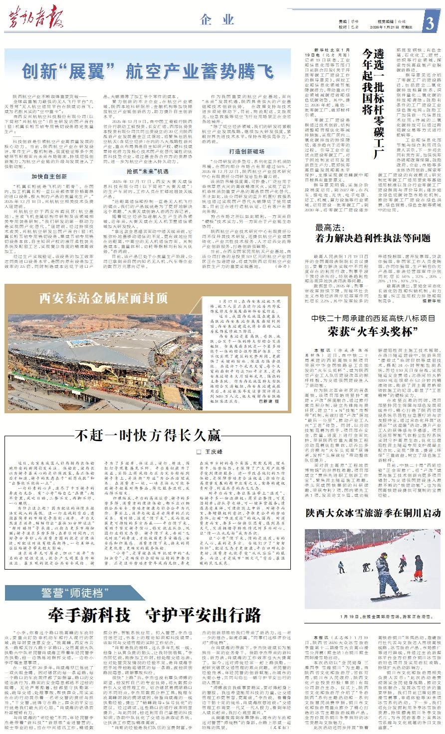 陕西航空产业不断取得重要突破—— 全球载重能力最强的无人飞行平台“九天苍穹”无人航空通用平台在陕成功首飞,成为名副其实的“空中重卡”; 由西安兴航航空科技股份有限公司(以下简称“兴航航空”)自主研发的国产首台(套)机翼长桁五轴专用铣切设备稳定批量生产; …… 科技创新是引领航空产业高质量发展的核心动力。当前,陕西航空产业在研发设计、零件生产、整机制造、强度验证等多个关键环节积极面向未来市场需求,持续增强创新能力,为航空产业链的升级与发展注入了强劲动能。加快自主创新 “机翼长桁就是飞机的‘筋骨’。在国内,加工机翼长桁一直以来都依靠价格高昂的进口设备,极大制约产品的批量化生产。”2025年12月18日,兴航航空相关技术负责人寇建说。 兴航航空位于西安市阎良区(航空基地),主攻飞机金属结构件研制及该领域相关专用装备研制。“我们研发的第一驱动力是实现国产化替代。”寇建说,经过持续技术攻关,兴航航空研发出国产首台(套)机翼长桁五轴专用铣切设备,集成五轴专用铣切设备本体、自主知识产权的液压柔性装夹系统及配套工艺,实现复杂角度的精准高效加工。 经过生产实践验证,该设备的加工效率达同类进口设备水平,是国内原有设备加工效率的2.5倍,同时制造成本远低于进口产品,大幅摊薄了加工单个零件的成本。 聚力创新的不止企业,在航空产业领域,陕西本地科研院所、金融机构等加快释放航空产业链创新活力,助力提升自主创新水平。 2025年12月9日,由中国工商银行陕西省分行联动工银投资、长安汇通、西部优势资本投资有限公司共同出资设立的20亿元陕西战新产业发展基金正式落地,将聚焦包括航空航天(含低空经济)在内的八大战略性新兴产业,重点布局具备自主知识产权、硬科技成果转化潜力及核心技术国产化替代属性的优质科技型企业,通过基金各合作方的资源协同,进一步为航空产业注入持久动力。抢抓“未来”机遇 2025年12月17日,西安大衡天成信息科技有限公司(以下简称“大衡天成”)的生产车间内,工作人员在忙碌地组装天线产品。 “远距离通信和控制一直是无人机飞行的痛点,我们的产品线就是为了更好地解决这个难题。”大衡天成创始人游鸿告诉记者。 随着低空经济加速融入生产生活各领域,近年来,大衡天成在无人机卫星通信领域加大研发投入。 “拿这款全息超表面动中通天线来说,它能弥补地基移动通信的不足,更有效地应用在远距离、中高空的无人机通信方面。其制造成本、重量体积、功耗等指标均有较大优势。”游鸿说。 目前,该产品已处于小批量生产阶段,公司已拿到来自国内知名无人机、汽车等企业的数百万元意向订单。 作为我国重要的航空产业基地,面向“未来”发展机遇,陕西具备强大的产业基础和技术创新优势。 在政策支持与技术进步双轮驱动下,目前,物流配送、文旅观光、应急救援等低空飞行应用场景正在全省各地铺开。 “除了低空经济领域,我们的研发将紧跟航空产业发展战略,继续加大研发强度,紧跟世界先进技术水平,保持市场强竞争力。”游鸿说。打造创新磁场 “公司研发的多型号、系列化直升机消防吊桶,在国内细分市场占有率超过50%。”2025年12月22日,陕西航空产业技术研究中心有限责任公司研发总监孙青云说。 该消防吊桶强度高、可折叠,广泛应用于森林草原火灾的高效精准灭火,实现了直升机森林消防重要产品的高品质国产化替代。不止如此,该公司研发的直升机医疗救援系统也通过实现国产替代大幅降低了使用成本,目前正在进行适航认证,已有客户有意向采购。 抢占市场之所以如此顺利,一方面来自“硬核”技术实力,另一方面在于产业链生态协同。 陕西航空产业技术研究中心有限责任公司不仅开展技术研发,还提供航空产业成果转化、产业共性技术服务、人才培养交流等产业创新服务,打造创新强磁场。 当前,在西安国家民用航天产业基地,由该公司打造的总投资9.9亿元的航空产业园区正在加速建设,将成为陕西培育航空产业新质生产力的重要实践基地。 (孙丹)