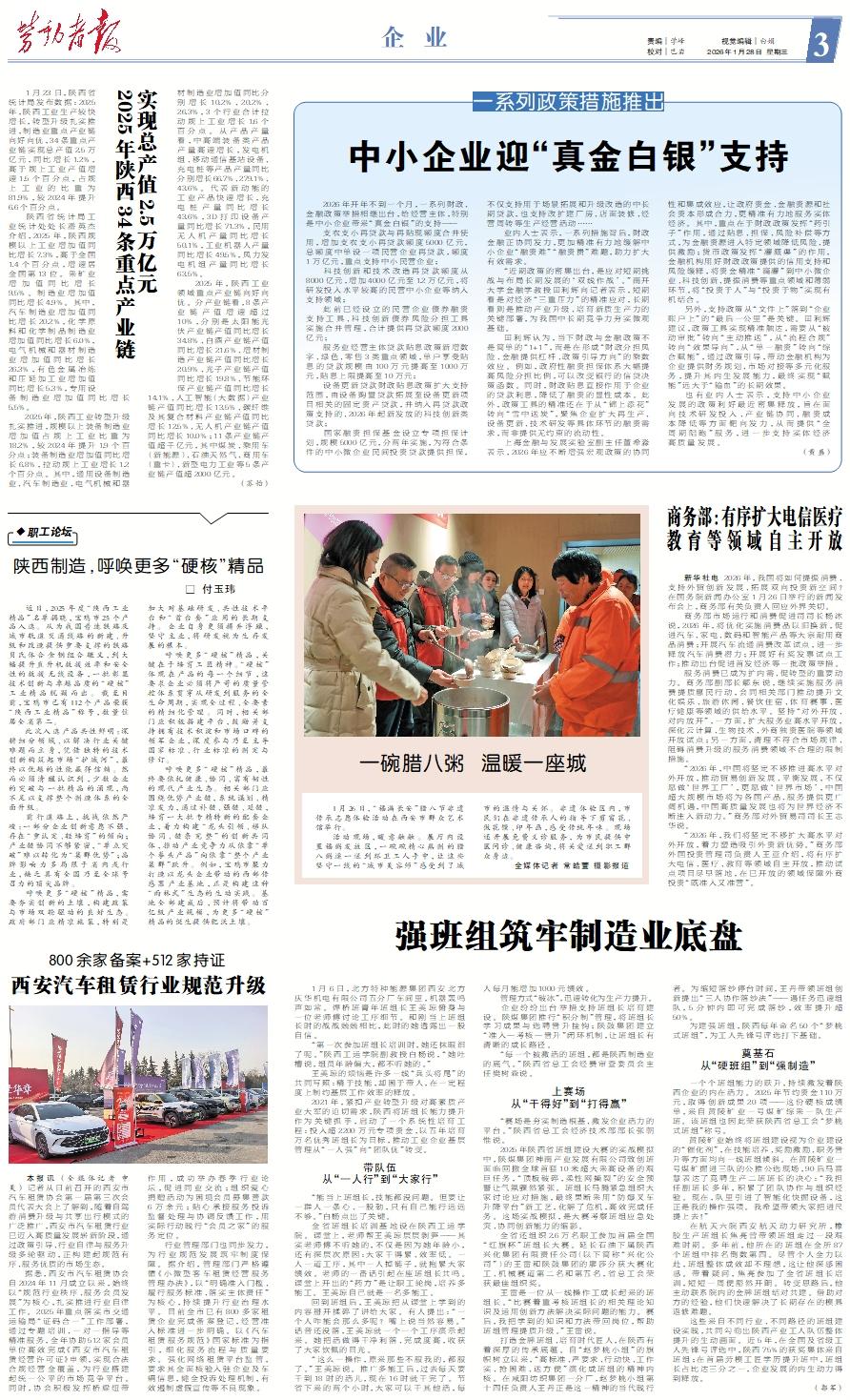 1月23日,陕西省统计局发布数据:2025年,陕西工业生产较快增长,转型升级扎实推进,制造业重点产业链向好向优,34条重点产业链实现总产值2.5万亿元,同比增长1.2%,高于规上工业产值增速1.5个百分点,占规上工业的比重为81.9%,较2024年提升6.6个百分点。 陕西省统计局工业统计处处长潘英杰介绍,2025年,陕西规模以上工业增加值同比增长7.3%,高于全国1.4个百分点,增速居全国第13位。采矿业增加值同比增长9.5%。制造业增加值同比增长4.9%。其中,汽车制造业增加值同比增长20.2%,化学原料和化学制品制造业增加值同比增长6.0%,电气机械和器材制造业增加值同比增长26.3%,有色金属冶炼和压延加工业增加值同比增长5.3%,专用设备制造业增加值同比增长5.5%。 2025年,陕西工业转型升级扎实推进,规模以上装备制造业增加值占规上工业比重为18.2%,较2024年提升1.9个百分点;装备制造业增加值同比增长6.8%,拉动规上工业增长1.2个百分点。其中,通用设备制造业、汽车制造业、电气机械和器材制造业增加值同比分别增长10.2%、20.2%、26.3%,3个行业合计拉动规上工业增长1.6个百分点。从产品产量看,中高端装备类产品产量高速增长,发电机组、移动通信基站设备、充电桩等产品产量同比分别增长66.7%、279.1%、43.6%。代表新动能的工业产品快速增长,充电桩产量同比增长43.6%,3D打印设备产量同比增长71.3%,民用无人机产量同比增长50.1%,工业机器人产量同比增长49.5%,风力发电机组产量同比增长63.5%。 2025年,陕西工业领域重点产业链向好向优。分产业链看,8条产业链产值增速超过10%,分别是太阳能光伏产业链产值同比增长34.8%、白酒产业链产值同比增长21.6%、增材制造产业链产值同比增长20.9%、光子产业链产值同比增长19.8%、节能环保产业链产值同比增长14.1%、人工智能(大数据)产业链产值同比增长13.5%、碳纤维及其复合材料产业链产值同比增长12.5%、无人机产业链产值同比增长10.0%;11条产业链产值超千亿元,其中煤炭、乘用车(新能源)、石油天然气、商用车(重卡)、新型电力工业等5条产业链产值超2000亿元。 (苏怡)