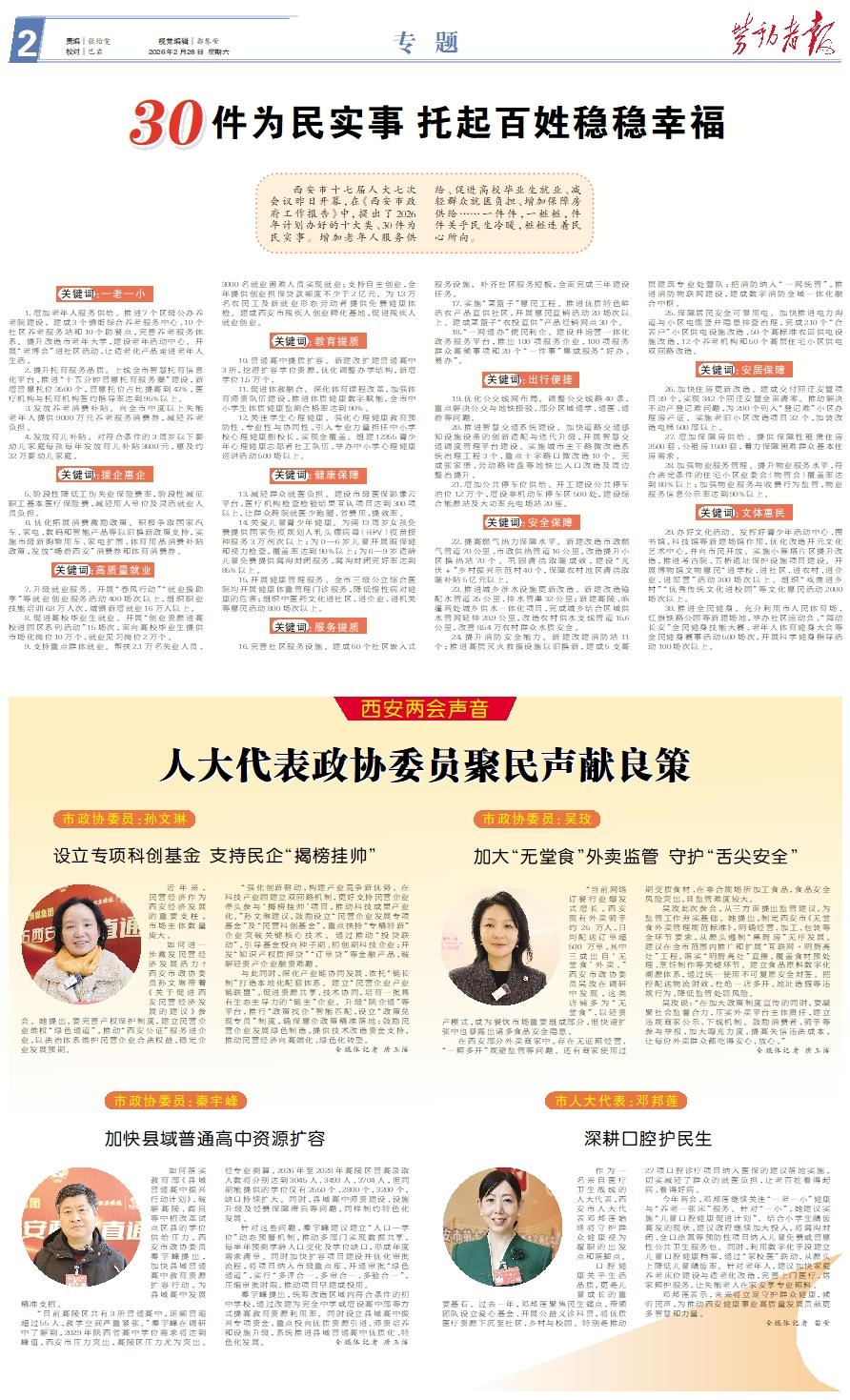 西安市十七届人大七次会议昨日开幕,在《西安市政府工作报告》中,提出了2026年计划办好的十大类、30件为民实事。增加老年人服务供给、促进高校毕业生就业、减轻群众就医负担、增加保障房供给……一件件,一桩桩,件件关乎民生冷暖,桩桩连着民心所向。关键词:一老一小 1.增加老年人服务供给。推进7个区级公办养老院建设, 建成3个镇街综合养老服务中心、10个社区养老服务站和10个助餐点,完善养老服务体系。提升改造市老年大学,建设老年活动中心。开展“老博会”进社区活动,让适老化产品走进老年人生活。 2.提升托育服务品质。上线全市智慧托育信息化平台,推进“十五分钟普惠托育服务圈”建设,新增普惠托位3500个,普惠托位占比提高到43%,医疗机构与托育机构签约指导率达到95%以上。 3.发放养老消费补贴。向全市中度以上失能老年人提供9000万元养老服务消费券,减轻养老负担。 4.发放育儿补贴。对符合条件的3周岁以下婴幼儿家庭每孩每年发放育儿补贴3600元,惠及约32万婴幼儿家庭。关键词:援企惠企 5.阶段性降低工伤失业保险费率,阶段性减征职工基本医疗保险费,减轻用人单位及灵活就业人员负担。 6.优化拓展消费激励政策。积极争取国家汽车、家电、数码和智能产品等以旧换新政策支持,实施市级新购乘用车、家电扩围、体育用品消费补贴政策,发放“畅游西安”消费券和体育消费券。关键词:高质量就业 7.升级就业服务。开展“春风行动”“就业援助季”等就业创业服务活动400场次以上,组织职业技能培训6.8万人次,城镇新增就业16万人以上。 8.促进高校毕业生就业。开展“创业资源进高校进园区系列活动”15场次,面向高校毕业生提供市场化岗位10万个、就业见习岗位2万个。 9.支持重点群体就业。帮扶2.1万名失业人员、3000名就业困难人员实现就业;支持自主创业,全年提供创业担保贷款额度不少于2亿元。为1.3万名农民工及新就业形态劳动者提供免费健康体检。建成西安市残疾人创业孵化基地,促进残疾人就业创业。关键词:教育提质 10.普通高中提质扩容。新建改扩建普通高中3所,挖潜扩容学位资源,优化调整办学结构,新增学位1.5万个。 11.促进体教融合。深化体育课程改革,加强体育师资队伍建设,推进体质健康数字赋能,全市中小学生体质健康监测合格率达到90%。 12.关注学生心理健康。强化心理健康教育预防性、专业性与协同性,引入专业力量担任中小学校心理健康副校长,实现全覆盖。组建12355青少年心理健康志愿者社工队伍,举办中小学心理健康巡讲活动500场以上。关键词:健康保障 13.减轻群众就医负担。建设市级医保影像云平台,医疗机构检查检验结果互认项目达到300项以上,让群众跨院就医少跑腿、省费用、提效率。 14.关爱儿童青少年健康。为满13周岁女孩免费提供国家免疫规划人乳头瘤病毒(HPV)疫苗接种服务3万剂次以上;为0—6岁儿童开展眼保健和视力检查,覆盖率达到90%以上;为6—9岁适龄儿童免费提供窝沟封闭服务,窝沟封闭完好率达到85%以上。 15.开展健康管理服务。全市三级公立综合医院均开展健康体重管理门诊服务,降低慢性病对健康的危害;组织中医药文化进社区、进企业、进机关等惠民活动800场次以上。关键词:服务提质 16.完善社区服务设施。建成60个社区嵌入式服务设施, 补齐社区服务短板,全面完成三年建设任务。 17.实施“菜篮子”惠民工程。推进优质特色鲜活农产品直供社区,开展惠民直销活动20场次以上。建成菜篮子“农投直供”产品经销网点30个。 18.“一网通办”便民利企。建设并运营一体化政务服务平台,推出100项服务企业、100项服务群众高频事项和20个“一件事”集成服务“好办、易办”。关键词:出行便捷 19.优化公交线网布局。调整公交线路40条,重点解决公交与地铁接驳、部分区域通学、通医、通游等问题。 20.推进智慧交通系统建设。加快道路交通感知设施设备的创新适配与迭代升级,开展智慧交通调度管理平台建设。实施城市主干路微改造系统治理工程3个、重点十字路口微改造10个。完成张家堡、劳动路转盘等地铁出入口改造及周边整治提升。 21.增加公共停车位供给。开工建设公共停车泊位1.2万个,增设非机动车停车区500处,建设综合能源站及大功率充电场站20座。关键词:安全保障 22.提高燃气热力保障水平。新建改造市政燃气管道70公里、市政供热管道16公里,改造提升小区换热站70个。巩固清洁取暖成效,建设“光伏+”乡村振兴示范村40个,保障农村地区清洁取暖补贴5亿元以上。 23.推进城乡涉水设施更新改造。新建改造输配水管道25公里、排水管渠32公里;新建高陵、临潼两处城乡供水一体化项目,完成城乡结合区域供水管网延伸20.9公里,改造农村供水支线管道15.6公里,改善8.54万农村群众水质安全。 24.提升消防安全能力。新建改建消防站11个;推进高层灭火救援设施以旧换新,建成5支高层建筑专业处置队;把消防纳入“一网统管”,推进消防物联网建设,建成数字消防全域一体化融合中枢。 25.保障居民安全可靠用电。加快推进电力沟道与小区电缆竖井隐患排查治理,完成210个“合表户”小区供电设施改造、50个高标准农田供电设施改造、12个养老机构和50个高层住宅小区供电双回路改造。关键词:安居保障 26.加快住房更新改造。建成交付回迁安置项目39个,实现342个回