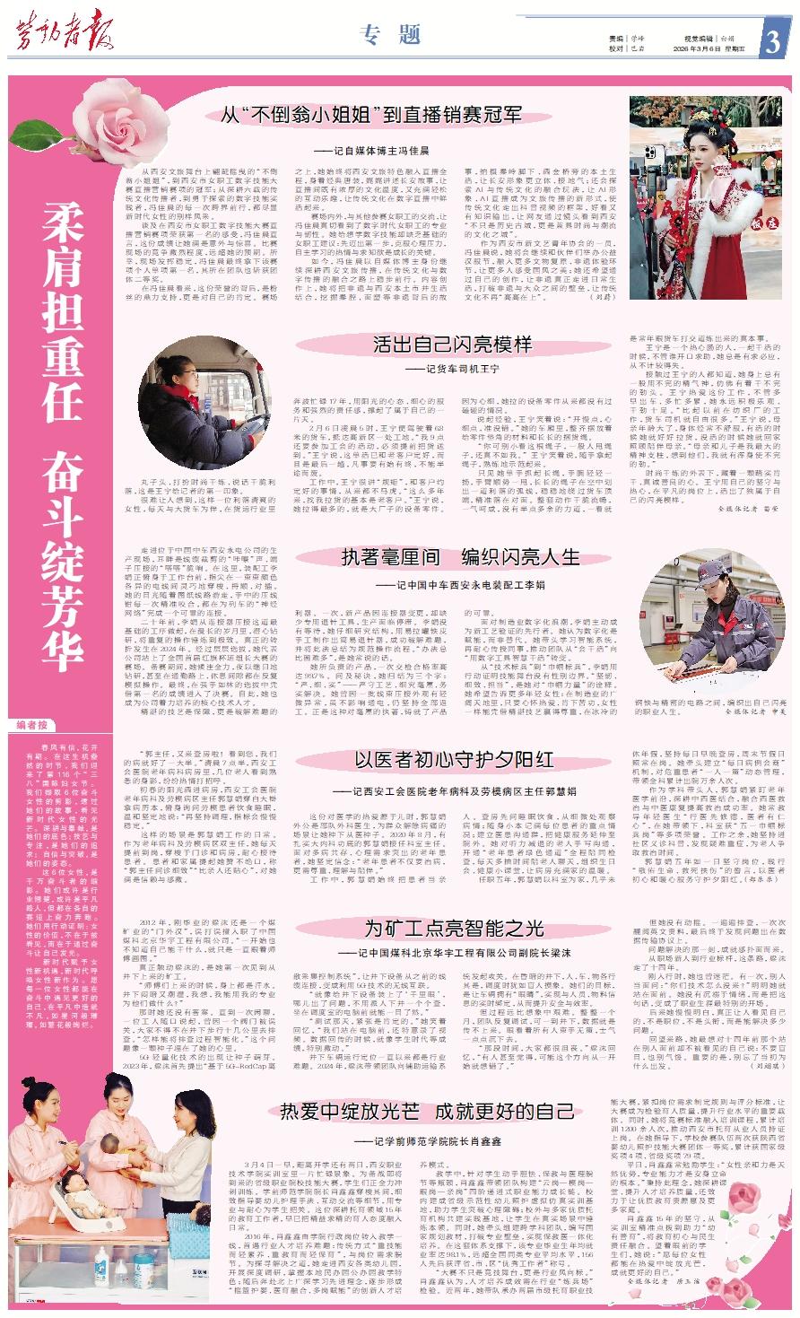 编者按 春风有信,花开有期。在这生机盎然的时节,我们迎来了第116个“三八”国际妇女节。 我们撷取6位奋斗女性的剪影,透过她们的故事,看见新时代女性的光芒。深耕与奉献,是她们的底色;技艺与专注,是她们的追求; 自信与突破,是她们的姿态。 这6位女性,是千万奋斗者的缩影。她们或许是行业翘楚,或许是平凡路人,但都在各自的赛道上奋力奔跑。她们用行动证明:女性的价值,不在于被看见,而在于通过奋斗让自己发光。 新时代赋予女性新机遇,新时代呼唤女性新作为。愿每一位女性都能在奋斗中遇见更好的自己,在平凡中造就不凡,如星河般璀璨,如繁花般绚烂。从“不倒翁小姐姐”到直播销赛冠军——记自媒体博主冯佳晨 从西安文旅舞台上翩跹摇曳的“不倒翁小姐姐”,到西安市女职工数字技能大赛直播营销赛项的冠军;从深耕六载的传统文化传播者,到勇于探索的数字技能实践者,冯佳晨的每一次跨界前行,都尽显新时代女性的别样风采。 谈及在西安市女职工数字技能大赛直播营销赛项荣获第一名的感受,冯佳晨直言,这份成绩让她满是意外与惊喜。比赛现场的竞争激烈程度,远超她的预期。所幸,现场发挥稳定,冯佳晨最终拿下该赛项个人单项第一名,其所在团队也斩获团体二等奖。 在冯佳晨看来,这份荣誉的背后,是粉丝的鼎力支持,更是对自己的肯定。赛场之上,她始终将西安文旅特色融入直播全程,身着经典唐装,娓娓讲述长安故事,让直播间既有浓厚的文化温度,又充满轻松的互动乐趣,让传统文化在数字直播中鲜活起来。 赛场内外,与其他参赛女职工的交流,让冯佳晨真切看到了数字时代女职工的专业与韧性。她给想学数字技能却缺乏基础的女职工建议:先迈出第一步,克服心理压力,自主学习的热情与求知欲是成长的关键。 如今,冯佳晨以自媒体博主身份继续深耕西安文旅传播,在传统文化与数字传播的融合之路上稳步前行。内容创作上,她将把非遗与西安本土市井生活结合,挖掘秦腔、面塑等非遗背后的故事,拍摄秦岭脚下、洒金桥旁的本土生活,让长安形象更立体、接地气;还会探索AI与传统文化的融合玩法,让AI形象、AI直播成为文旅传播的新形式,使传统文化走出科普视频的框架,好看又有知识输出,让网友通过镜头看到西安“不只是历史古城,更是兼具时尚与潮流的文化之城”。 作为西安市新文艺青年协会的一员,冯佳晨说,她将会继续和伙伴们举办公益汉服节,融入更多文物复原、非遗体验环节,让更多人感受国风之美;她还希望通过自己的创作,让非遗真正走进日常生活,打破非遗与大众之间的壁垒,让传统文化不再“高高在上”。 (刘蔚)活出自己闪亮模样——记货车司机王宁 丸子头、打扮时尚干练、说话干脆利落,这是王宁给记者的第一印象。 很难让人想到,这样一位利落清爽的女性,每天与大货车为伴,在货运行业里奔波忙碌17年,用阳光的心态、细心的服务和强烈的责任感,撑起了属于自己的一片天。 2月6日凌晨5时,王宁便驾驶着6.8米的货车,抵达高新区一处工地。“我9点还要参加工会的活动,必须提前把货送到。”王宁说,这单活已和老客户定好,而且是最后一趟,凡事要有始有终,不能半途而废。 工作中,王宁很讲“规矩”,和客户约定好的事情,从来都不马虎。“这么多年来,找我拉货的基本是老客户。”王宁说,她拉得最多的,就是大厂子的设备零件。因为心细,她拉的设备零件从来都没有过磕碰的情况。 说起经验,王宁笑着说:“开慢点,心细点,准没错。”她的车厢里,整齐摆放着给零件垫角的材料和长长的捆货绳。 “你可别小看这根绳子,一般人甩绳子,还真不如我。” 王宁笑着说,随手拿起绳子,熟练地示范起来。 只见她单手抓起长绳,手腕轻轻一扬,手臂顺势一甩,长长的绳子在空中划出一道利落的弧线,稳稳地绕过货车顶端,精准落在对面。整套动作干脆流畅,一气呵成,没有半点多余的力道,一看就是常年跟货车打交道练出来的真本事。 王宁是一个热心肠的人,一起干活的时候,不管谁开口求助,她总是有求必应,从不计较得失。 接触过王宁的人都知道,她身上总有一股用不完的精气神,仿佛有着干不完的劲头。王宁热爱这份工作,不管多早出车、多忙多累,她永远积极乐观、干劲十足。“比起以前在纺织厂的工作,货车司机就自由很多。”王宁说,母亲年龄大了,身体经常不舒服,有活的时候她就好好拉货,没活的时候她就回家照顾陪伴母亲。“母亲和儿子是我最大的精神支柱,想到他们,我就有浑身使不完的劲。” 时尚干练的外表下,藏着一颗踏实肯干、真诚善良的心。王宁用自己的坚守与热心,在平凡的岗位上,活出了独属于自己的闪亮模样。 全媒体记者 苗莹执著毫厘间 编织闪亮人生——记中国中车西安永电装配工李娟 走进位于中国中车西安永电公司的生产现场,耳畔是线缆裁剪的“咔嚓”声、端子压接的“嗒嗒”脆响。在这里,装配工李娟正俯身于工作台前,指尖在一束束颜色各异的电线间灵巧地穿梭、捋顺、对插。她的目光随着图纸线路游走,手中的压线钳每一次精准咬合,都在为列车的“神经网络”完成一个可靠的连接。 二十年前,李娟从连接器压接这道最基础的工序做起,在漫长的岁月里,潜心钻研,将重复的操作锤炼到极致。真正的转折发生在2024年。经过层层选拔,她代表公司站上了全国首届红旗杯班组长大赛的赛场。备
