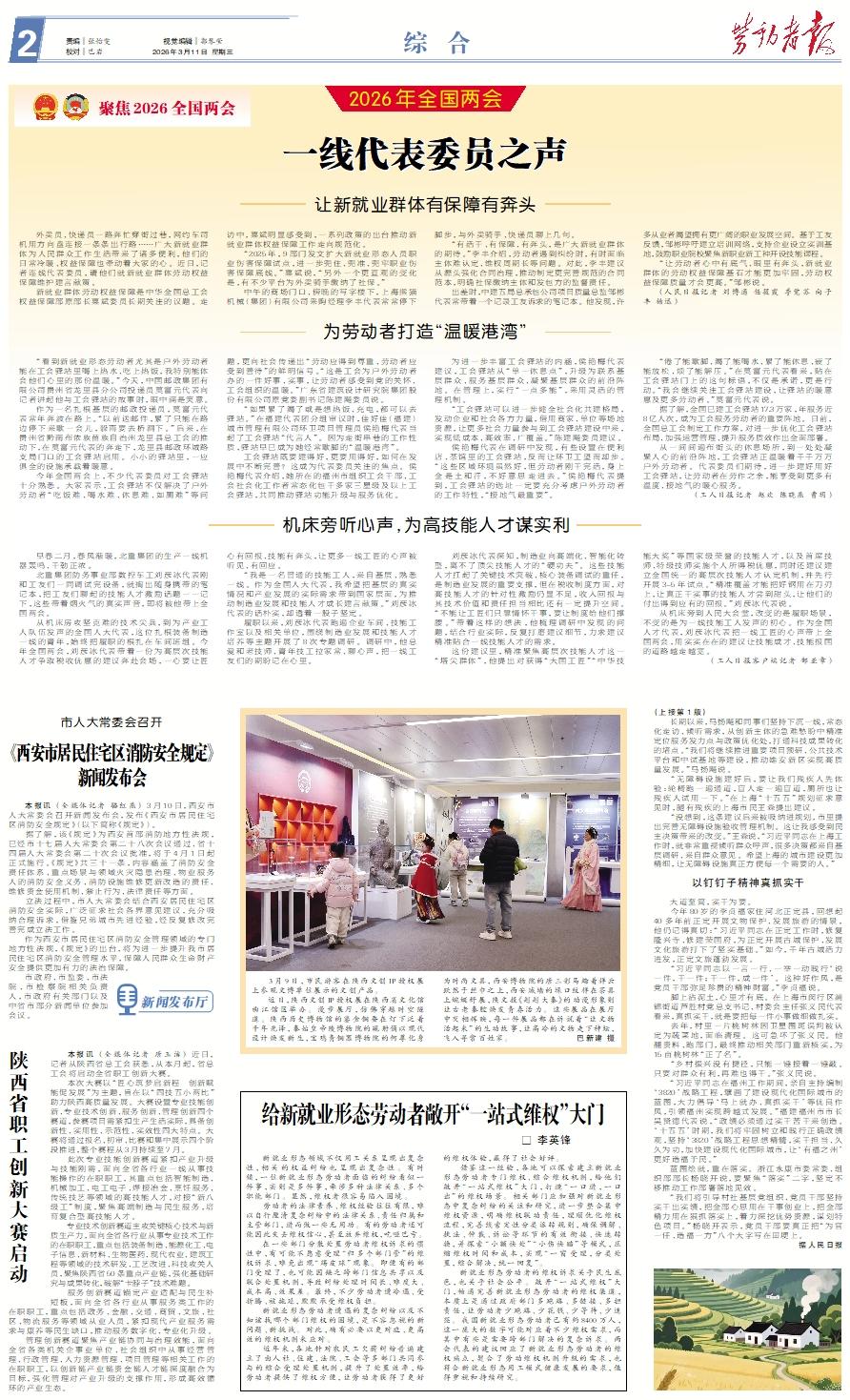 让新就业群体有保障有奔头 外卖员、快递员一路奔忙穿街过巷,网约车司机用方向盘连接一条条出行路……广大新就业群体为人民群众工作生活带来了诸多便利,他们的日常冷暖、权益保障也牵动着大家的心。近日,记者连线代表委员,请他们就新就业群体劳动权益保障维护建言献策。 新就业群体劳动权益保障是中华全国总工会权益保障部原部长粟斌委员长期关注的议题。走访中,粟斌明显感受到,一系列政策的出台推动新就业群体权益保障工作走向规范化。 “2025年,9部门发文扩大新就业形态人员职业伤害保障试点,进一步兜住、兜准、兜牢职业伤害保障底线。”粟斌说,“另外一个更直观的变化是,有不少平台为外卖骑手缴纳了社保。” 中午的商场门口、傍晚的写字楼下,上海熊猫机械(集团)有限公司采购经理李丰代表常常停下脚步,与外卖骑手、快递员聊上几句。 “有活干、有保障、有奔头,是广大新就业群体的期待。”李丰介绍,劳动者遇到纠纷时,有时面临主体难认定、维权周期长等问题。对此,李丰建议从源头强化合同治理,推动制定更完善规范的合同范本,明确社保缴纳主体和发包方的监督责任。 出差时,中建五局总承包公司项目质量总监邹彬代表常带着一个记录工友诉求的笔记本。他发现,许多从业者渴望拥有更广阔的职业发展空间。基于工友反馈,邹彬呼吁建立培训网络,支持企业设立实训基地,鼓励职业院校聚焦新职业新工种开设技能课程。 “让劳动者心中有底气、眼里有奔头,新就业群体的劳动权益保障基石才能更加牢固,劳动权益保障质量才会更高。”邹彬说。 (人民日报记者 刘博通 任筱霞 季觉苏 向子丰 杨迅)为劳动者打造“温暖港湾” “看到新就业形态劳动者尤其是户外劳动者能在工会驿站里喝上热水、吃上热饭,我特别能体会他们心里的那份温暖。”今天,中国邮政集团有限公司贵州省龙里县分公司投递员莫富元代表向记者讲起他与工会驿站的故事时,眼中满是笑意。 作为一名扎根基层的邮政投递员,莫富元代表常年奔波在路上。“以前送邮件,累了只能在路边停下来歇一会儿,躲雨要去桥洞下。”后来,在贵州省黔南布依族苗族自治州龙里县总工会的推动下,在莫富元代表的奔走下,龙里县邮政环城路支局门口的工会驿站启用。小小的驿站里,一应俱全的设施承载着暖意。 今年全国两会上,不少代表委员对工会驿站十分熟悉。大家表示,工会驿站不仅解决了户外劳动者“吃饭难、喝水难、休息难、如厕难”等问题,更向社会传递出“劳动应得到尊重、劳动者应受到善待”的鲜明信号。“这是工会为户外劳动者办的一件好事、实事,让劳动者感受到党的关怀、工会组织的温暖。”广东省建筑设计研究院集团股份有限公司原党委副书记陈建飚委员说。 “如果累了渴了或是想热饭、充电,都可以去驿站。”在福建代表团分组审议时,佳好佳(福建)城市管理有限公司环卫项目管理员侯艳梅代表当起了工会驿站“代言人”。因为走街串巷的工作性质,驿站早已成为她经常歇脚的“温暖港湾”。 工会驿站既要建得好,更要用得好,如何在发展中不断完善?这成为代表委员关注的焦点。侯艳梅代表介绍,她所在的福州市组织工会干部、工会社会化工作者常态化包干多家三星级及以上工会驿站,共同推动驿站功能升级与服务优化。 为进一步丰富工会驿站的内涵,侯艳梅代表建议,工会驿站从“单一休息点”,升级为联系基层群众、服务基层群众、凝聚基层群众的前沿阵地。在管理上,实行“一点多能”,采用灵活的管理机制。 “工会驿站可以进一步健全社会化共建格局,发动企业和社会各方力量,借用商家、单位等场地资源,让更多社会力量参与到工会驿站建设中来,实现低成本、高效率、广覆盖。”陈建飚委员建议。 侯艳梅代表在调研中发现,有些设置在便利店、茶馆里的工会驿站,反而让环卫工望而却步。“这些区域环境虽然好,但劳动者刚干完活,身上全是土和汗,不好意思走进去。”侯艳梅代表提到,工会驿站的选址一定要充分考虑户外劳动者的工作特性,“接地气最重要”。 “倦了能歇脚、渴了能喝水、累了能休息、疲了能放松、烦了能解压。”在莫富元代表看来,贴在工会驿站门上的这句标语,不仅是承诺,更是行动。“我会继续关注工会驿站建设,让驿站的暖意惠及更多劳动者。”莫富元代表说。 据了解,全国已建工会驿站17.3万家,年服务近8亿人次,成为工会服务劳动者的重要阵地。日前,全国总工会制定工作方案,对进一步优化工会驿站布局、加强运营管理、提升服务质效作出全面部署。 从一间间遍布街头的休息场所,到一处处凝聚人心的前沿阵地,工会驿站正温暖着千千万万户外劳动者。代表委员们期待,进一步建好用好工会驿站,让劳动者在劳作之余,能享受到更多有温度、接地气的暖心服务。 (工人日报记者 赵欢 陈晓燕 曹玥)机床旁听心声,为高技能人才谋实利 早春二月,春风渐暖,北重集团的生产一线机器轰鸣、干劲正浓。 北重集团防务事业部数控车工刘彦冰代表刚和工友们一同调试完设备,就掏出随身携带的笔记本,把工友们聊起的技能人才激励话题一一记下,这些带着烟火气的真实声音,即将被他带上全国两会。 从机床房攻坚克难的技术尖兵,到为产业工人队伍发声的全国人大代表,这位扎根装备制造一线的青年,