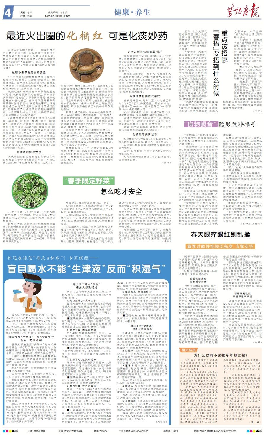 开春“打野”,挖野菜成了不少人的“春季限定”户外活动。野菜虽美味,但误食野菜引发的中毒、过敏等问题,也应引起重视。 据专家介绍,多数野菜纤维粗硬且含量高,容易刺激胃肠黏膜,连续过量食用会加重胃肠负担。胃部有炎症的人群过量食用荠菜、竹笋等,会加重炎症。马齿苋、灰灰菜、槐花等野菜含致敏物质,过敏体质者食用后易出现皮肤斑丘疹、红肿瘙痒、面部刺痛等不良反应。 专家建议,食用野菜需遵守以下原则: 1.“四不原则”:不熟悉的野菜不吃;受污染的野菜不吃;存放过久的野菜不吃;不长期、过量食用野菜。 2.清洗彻底、焯水。食用前需用清水反复冲洗干净。部分野菜需要沸水焯烫1~2分钟,以去除亚硝酸盐、生物碱、皂苷等有毒物质。 3.适量食用。健康人群单次食用建议不超过200克,每周不超过2次。老人、孩子、孕产妇,胃肠功能较弱、肝肾功能不全,以及过敏体质者要慎食野菜。 专家介绍,野菜中毒症状主要包括剧烈呕吐、腹泻、腹痛等,有些还会伴随头晕头痛、呼吸困难、心慌气短等症状。如遇野菜食用中毒,可按“三步法”处理。 1.立即停食、催吐排毒:患者意识清醒且吃下野菜不超过4~6小时,可先大量饮用温水200~300ml,用手指刺激咽喉部催吐,尽量排空胃内容物;2.尽快就医,带上样本;3.开放气道,防止窒息:在等待急救时,应让患者侧卧,防止呕吐物堵塞气管,密切观察呼吸心跳。 专家提醒,切不可盲目“解毒”。在没有确诊前,不要喝牛奶、豆浆等,以免加重肝肾负担或加速毒素吸收。也不要轻易用止泻药,强行止泻可能导致毒素滞留,加重病情。 (辛华)