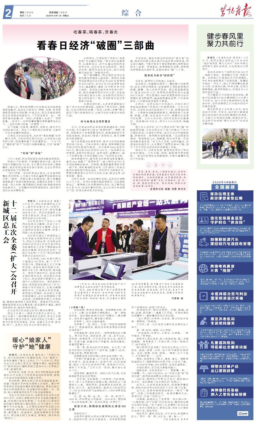 凌晨4点,菜农胡师傅已经将配送来的新鲜春菜摆放整齐,每年这个时间点,香椿、白蒿、荠荠菜等春菜深受市民热捧;午饭过后,西安汉城湖景区附近的茶馆里热闹非凡,三五好友围坐一处,一杯春茶散尽疲惫;同一时刻,河堤路上支起了一顶顶帐篷,一家老少一边呼吸着混着花香和青草味的空气,一边开启春日的第一次露营…… 天气转暖,吃春菜、喝春茶、赏春光,成为不少市民的新日常。而这三个看似独立的场景,正被同一个经济逻辑串联起来。 记者连日来走访发现,与往年“看花踏青”的单一模式不同,今年的西安春日经济,从田间地头到茶园山野,再到秦岭脚下的帐篷营地,一个从“舌尖”蔓延到“帐下”的春日消费新赛道,已然“破圈”生长。“花海”变“商海” 三月上旬起,西安各处赏花地迎来最佳观赏期。 终南山下的唐村,千株梅花傲然吐蕊,成为市民春日赏梅的热门之选,不少慕名而来的游人穿梭梅林,驻足欣赏这独有的春日景致,这也让园区内的茶馆迎来了经营旺季。 “我们茶馆一年的旺季就在春天,尤其是园区梅花开的时候,2月到4月客流量和营业额都比较可观。”唐村一茶馆负责人赵俊强说,春日赏梅品茗逐渐成了游客的标配体验,来喝茶的多是三五好友或一家人结伴,喝茶搭配打牌成为游客最受欢迎的休闲方式。在赏梅的同时享受慢时光,成为春日里的主流消费场景。 在园区内,记者发现了多家以“品茗赏春”为主题的茶馆。“春天我们就推春茶,以紫阳毛尖、汉中仙毫这些陕西本地茶为主,也会有龙井这类绿茶。春茶讲究鲜,清明节前的茶出来,我们卖到夏天就结束。”赵俊强介绍。 除了唐村梅花,西安城区及周边各类花海也相继进入盛花期。据西安市城管执法局发布的《西安市2026年春季赏花点位》显示,全市共有370处春季赏花点位,涵盖樱花、海棠、牡丹等30余个花卉品种。赏花地点遍布全市各类公园广场,既有底蕴深厚的兴庆公园、水韵盎然的曲江遗址公园,也有便民亲民的口袋公园与街心广场,市民游客可就近享受春日美景。 与春花相匹配,大多景区都配套打造了多元化的休闲体验,也催热了周边茶社、咖啡馆、文创店等相关消费,“赏花+休闲+消费”模式成为了春日休闲新方式,让春日经济在繁花中持续升温。时令春菜点亮市民餐桌 近日,记者走访西安多家农贸商超发现,为迎合市场,不少超市专门设立“春菜专区”。香椿、春笋、荠菜等近十种春菜整齐陈列,鲜嫩品相吸引市民驻足挑选,多款热门春菜上架即售空,春日消费活力持续释放。 线下永辉超市的春菜专区,是不少市民选购春菜的热门去处。记者在货架上看到,春笋和豌豆苗凭借亲民价格成为爆款。其中春笋450g装售价3.59元,豌豆苗250g装售价5.99元。“每年都吃这种春菜,永辉的价格实在、品质也好,买着放心,线上下单更方便,不用特意跑门店。”市民马女士说。 除永辉超市外,盒马鲜生的春菜也备受青睐。盒马App设置了“春菜专区”,线上榜单也可以为市民选购提供参考。红香椿、板蓝根青菜等时令菜一键下单,依托高效配送体系,让忙碌的上班族也能轻松解锁春日限定美味。评论区不少顾客表示,香椿炒蛋是春日必不可少的仪式感,错过这季,就要再等一整年。 记者在东郊一处流动摊位发现,这里的代烧档口人气十足。市民在该摊位购买春菜后,可直接现场加工。像香椿头炒鸡蛋等时令家常,加工费普遍在6至10元,味美价廉的同时,也让大家在浓浓烟火气里,沉浸式品味春天的味道。 不仅如此,餐饮市场也同步迎来“春令食”热潮,商家纷纷推出具有春日特色的菜式和饮品,西安徐记海鲜、兰湘子等多个商家更是推出春季限定时令上新菜。荠菜蒸饺、鲜香椿煎炒鸡蛋、葱香春莴笋等菜品大受好评,直接将春天“搬”上了桌。露营成为春日“新标配” 近年来,露营早已不再是小众爱好。 每年春天,河堤路的草坪上、秦岭脚下的露营地,就连公园的树荫里,总能撞见几顶色彩鲜亮的帐篷,裹着一家人的欢声笑语。据天眼查数据显示,截至2026年3月,我国现存露营相关企业超29.9万余家。西安更是以4600家露营相关企业的规模位居全国第四,涵盖露营基地运营、户外装备销售、户外餐饮服务等多个领域。 在西安一大型连锁户外用品店,记者在进门显眼处就看到了全套的户外露营装备。工作人员介绍,店里年后就对设备进行了上新,简易版的露营,一个野餐垫就能触摸到春天,精致版除了有桌椅、帐篷、天幕,还有迷你卡式炉、便携养生壶等可供选择。工作人员介绍,店内目前性价比最高的一款套餐500元左右,适合4人以内使用,销量不错。 据工作人员介绍,为了让更多市民“零门槛”体验露营乐趣,今年在西安有三家门店推出了99元日租的活动,只需垫付押金,就可以在店内租到帐篷、野餐垫及一桌四椅的装备套餐。“过去顾客觉得买一套装备投入大、怕闲置,现在花不到一百块钱就能体验全套。”该工作人员说,这种轻量化、低成本的体验方式,大大降低了露营的参与门槛,吸引了不少初次尝试的年轻家庭和上班族。 除此之外,记者还发现,露营热还带动了周边业态的爆发。户外火锅、烧烤、咖啡成为营地标配,一些有特色营地也相继涌现,不断丰富着市民的户外体验。记者手记 春菜、春茶、春光,三股看似独立,实则环环相扣的消费热潮,宣告着春日经济正在告别传统剧本。从田间到餐桌,从茶园到帐篷,
