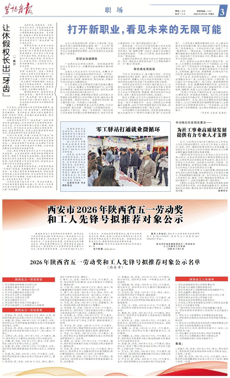 根据陕西省人力资源和社会保障厅、陕西省总工会推荐评选2026年陕西省五一劳动奖和工人先锋号有关要求,为体现公开、公平、公正原则,充分发扬民主,广泛接受社会监督,实现评选过程让群众参与、评选结果让群众认可,现将西安市2026年陕西省五一劳动奖和工人先锋号拟推荐对象予以公示,接受社会各界监督。公示期为2026年4月3日至10日。如对拟推荐对象有异议,请于公示期间通过电话、邮件、信函(以到达日邮戳为准)等方式向西安市评选表彰工作专班反映。反映情况应采取实名方式,请提供具体线索和事实依据。 联系地址:西安市未央区明光路166号凯瑞大厦I座 电子邮箱:jjb@xagh.net 联系人及电话:西安市人力资源和社会保障局张少昊029-67096877,西安市总工会崔亮029-87221590(传真)。 西安市评选表彰陕西省五一劳动奖和 工人先锋号工作专班 2026年4月3日2026年陕西省五一劳动奖和工人先锋号拟推荐对象公示名单(西安市)陕西省五一劳动奖状1. 西安瑞联新材料股份有限公司2. 绿能慧充数字技术有限公司3. 陕西永志一带一路物流有限公司4. 石羊农业集团股份有限公司5. 西安市长安区人民检察院6. 西安市公安局未央分局7. 西安市精神卫生中心8. 西安银行股份有限公司临潼支行9. 西安市莲湖区人力资源和社会保障局陕西省五一劳动奖章1. 张相东,男,汉族,1988年3月生,群众,大专,现任陕西奥通科技有限公司生产车间主任,高级工。2. 朱鹏,男,汉族,1980年5月生,中共党员,大专,现任西安庆华民用爆破器材股份有限公司起爆药班班组长,技师。3. 罗兵兵,男,汉族,1986年6月生,群众,高中,现任西安唐丰机电设备有限公司生产二部小组长,中级工。4. 仝国田,男,汉族,1977年3月生,中共党员,高中,现任西安吉丰医药包装有限公司车间副主任。5. 何峰,男,汉族,1997年3月生,群众,大专,现任西安吉利汽车有限公司员工,技师。6. 沈骞,男,汉族,1990年3月生,中共党员,大专,现任西安西航商泰高新技术有限公司员工,特级技师。7. 孙超,男,汉族,1979年1月生,中共党员,大专,现任西安陕鼓动力股份有限公司总装车间员工,高级技师。8. 韩增强,男,汉族,1982年12月生,群众,高中,现任个体货车司机,高级工。9. 高华,女,汉族,1983年11月生,中共党员,大专,现任陕西五环(集团)实业有限责任公司销售员,高级技师。10. 宁旭,男,汉族,1985年2月生,群众,本科,现任隆基绿能科技股份有限公司切片技术专家。11. 高飞,男,汉族,1983年2月生,群众,专科,现任西安西古光通信有限公司一线工段长,中级工。12. 邢龙,男,汉族,1988年5月生,群众,高中,现任陕西威达机械制造股份有限公司机加二班班长。13. 马强,男,汉族,1982年11月生,民盟盟员,专科,现任陕西阳光慈善发展中心理事长。14. 刘保亮,男,汉族,1984年12月生,中共党员,硕士研究生,现任西安三角防务股份有限公司副总工程师兼技术中心副主任,正高级工程师。15. 任艳楠,女,汉族,1982年8月生,中共党员,硕士研究生,现任中国启源工程设计研究院有限公司启源设计电气专业工程师,教授级高级工程师。16. 李兴龙,男,汉族,1986年12月生,中共党员,本科,现任中建七局第四建筑有限公司西安市经开第七中学项目机电经理,高级工程师、高级技师。17. 马虹,女,回族,1985年3月生,中共党员,本科,现任西安市安居建设管理集团有限公司项目建设管理部员工,经济师。18. 高珊,女,汉族,1977年6月生,中共党员,高中,现任西安饮食股份有限公司德发长酒店副厨师长,高级技师。19. 马波,男,汉族,1971年6月生,中共党员,硕士研究生,现任西安市人民医院(西安市第四医院)眼科医院副院长、白内障中心主任,主任医师。20. 安军明,男,汉族,1971年2月生,中共党员,硕士研究生,现任西安市中医医院针灸推拿康复科主任,主任医师。21. 贺蓬勃,男,汉族,1975年10月生,中共党员,硕士研究生,现任西安市第一中学党总支书记,高级教师。22. 樊晓晨,男,汉族,1984年10月生,中共党员,硕士研究生,现任西安市红会医院中医康复科主任,副主任医师。23. 王亚钧,男,汉族,1972年1月生,群众,本科,现任陕西省西安中学教师,高级教师。24. 唐玫,女,汉族,1970年6月生,中共党员,本科,现任西安市未央区西航四校党支部书记、校长,高级教师。25. 王妮,女,汉族,1979年10月生,中共党员,本科,现任西安市碑林区朱雀大街小学校长,正高级教师。26. 董超,男,汉族,1987年9月生,中共党员,硕士研究生,现任西安市雁塔区人民法院执行局副局长,一级法官。27. 潘秋荣,女,汉族,1970年9月生,中共党员,在职研究生,现任西安市养老保险经办处处长、兼陕西省社会保障局副局长。28. 陶梅,女,汉族,1970年11月生,中共党员,硕士研究生,现任西安市第三医院党委书记,主任医师。29. 马梅丽,女,回族,1963年9月生,中共党员,大专,现任西安市莲湖区北院门街道洒金桥社区党总支书记兼居委会主任。30. 雷超,男,汉族,1990年9月生,中共党员,硕士研究生,现任三星(中国)半导体有限公司主任工程师、工会副主席,中级工。31. 王文礼,男,汉族,1982年9月生,中共党员,硕士研究生,现任陕西江豪集团股份有限公司党支部书记、董事长,注册经济师。32. 乔立达,男,汉族,1989年11月生,中共党员,本科,现任陕西黑夫文化传播有限公司总经理。陕西省工人先锋号1. 西安尚域商贸有限公司销售事业部2. 西安爱尔古城眼科医院眼底病科3. 西安市阎良区人民检察院政治部新媒体中心4. 西安临潼博仁医院急诊科5