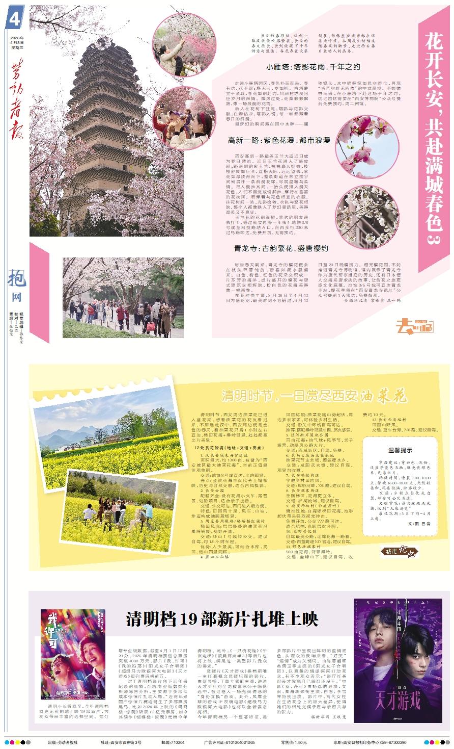 长安的春很短,短到一阵风就能吹落繁花;长安的春又很长,长到能藏下千年诗意与温柔。各色春花次第铺展,仿佛整座城市都在温柔地呼吸。本周我们继续追随春风的脚步,走进西安春日最动人的画卷。小雁塔:塔影花雨,千年之约 走进小雁塔园区,春色扑面而来。春有约,花不误;塔无言,岁如初。古塔静立千余载,春花如期赴约,用满树烂漫回应岁月的深情。微风过处,花瓣簌簌飘落,像一场浪漫的花雨。 游人在花树下驻足,塔影与花影交融,白瓣沾衣,塔影入镜,每一帧都藏着春日的浪漫。 最梦幻的瞬间藏在园中水畔——翻转镜头,水中锦鲤宛如悬空游弋,再现“皆若空游无所依”的中式意境。不妨循香而来,在小雁塔下赴这场千年之约。切记园区需要在“西安博物院”公众号提前免费预约,周二闭馆。高新一路:紫色花瀑,都市浪漫 西安高新一路最美玉兰大道近日成为春日顶流。近日玉兰花进入了盛放期,路两侧的紫玉兰,株株高大挺拔,枝桠舒展如巨伞,直指天际,远远望去,紫花如瀑倾泻而下,整条街道在林立楼宇间铺展开一条浪漫花廊,尽展温暖与柔情。行人漫步其间,一抬头便撞入漫天花色,人们不自觉放慢脚步,穿行在垂落的花枝间。若穿着与花色相宜的衣服,往花树间一站,光影流转,衣袂与繁花相映,整个人都像跌入了梦幻童话里,美得温柔又不真实。 玉兰花的花期很短,喜欢的朋友速去打卡,错过就要再等一年哦!地铁3/6号线至科技路站A口,向西步行200米过马路即达,免费开放,无需预约。青龙寺:古韵繁花,盛唐樱约 每当春天到来,青龙寺的樱花便会在枝头肆意绽放,游客如潮水般涌来。白色、粉色、红色的花朵交织成一片芬芳的海洋,成片盛开的樱花与唐式建筑交相辉映,粉白色的花海美得像一幅画卷。 樱花种类丰富,3月26日至4月12日为盛花期,最美时刻不容错过,4月12日至20日晚樱接力。逛完樱花园,不妨走进青龙寺博物馆,馆内展示了青龙寺作为唐代密宗祖庭的历史,还有日本僧人空海来唐求法的故事,让赏花之旅更添文化底蕴。地铁3/5号线可直达青龙寺站,樱花季需在“西安青龙寺遗址”公众号提前1天预约,免费参观。 全媒体记者 常皓萱 焦一鹤