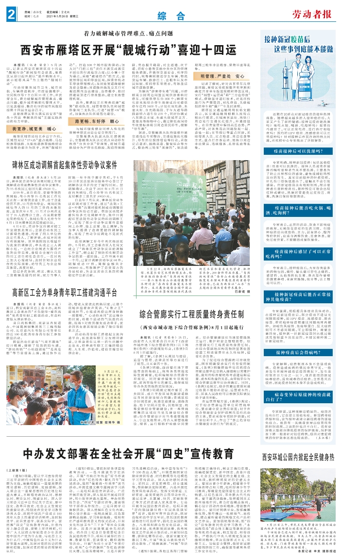 本报讯 (记者 苗莹) 5月 25日,记者从西安市雁塔区迎十四运“靓城行动”新闻发布会获悉,雁塔区从即日起开展以“提升精细水平,展示雁塔风采”为主题的“靓城行动”。 行动将聚焦城市卫生、城市容貌、车辆停放秩序、市政设施维护、空间秩序等7个方面31项工作,并贯穿全年,着力破解城市管理难点、痛点问题,提升城市精细化管理水平,以优美靓丽、整洁有序的城市风貌迎接第十四届全运会召开。 这是雁塔区率先落实西安市“服务十四运 奉献我的城”主题实践活动的有力举措。 街更净、城更美 暖心 雁塔区城管局局长乔亚宁介绍,区城管局以“17+25”重点线路、马拉松推荐线路、火炬传递推荐线路综合环境整治提升为抓手,开展“靓城行动”。打造100个城市服务驿站;加大对“门前三包”责任不落实或落实不到位的行政处罚力度;以小寨十字为重点,采取“疏堵结合”的方式,设置禁停区域和停放区域,探索非机动车停放管理模式;及时处置道路破损及安全隐患;对道路沿线及交叉口可视范围内违法建设、违章棚亭、临时搭建屋顶进行排查整治,建立长效管理机制。 此外,雁塔区正在筹备组建“城警”联动队伍、城管督察队伍和城管形象岗三支队伍,打造“城管+N”模式,加强执法队伍规范化建设。 路更畅、车好停 顺心 与城市服务驿站同样人性化的管理举措还出自公安交管部门。 交警雁塔大队副大队长裴剑表示,交警雁塔大队决定试点启动停车秩序“分类分区”管理制,将城市道路划分为严管示范路段、规范管理路段、常态提升路段,对主通道、次干道、背街小巷等实施分类分区的管理服务措施,在确保交通安全、有序的同时,统筹兼顾接送学生车辆、物流货运车辆、旅游巴士、出租车以及市民如厕、夜间停车等需求,有效盘活城市道路资源。 为解决“游客停车难”问题,开辟雁南公园周边闲置区域供游客临时停车,可提供停车位300个;雁塔文化新天地综合停车场建成后可提供停车位约1600个;计划在双杜路、朱雀大街、含光路南段、子午大道等路段新增占道车位270个,同时协调丈八东路立丰城、朱雀大街城市立方、麦德龙等购物中心,通过降低夜间停车收费标准吸引周边居民停车,缓解“停车难”。 据悉,交警雁塔大队持续将开展交通违法专项整治、交通设施优化提升、停车泊位摸排增设等行动,采取定点查扣、线路巡查、警便结合等方式,整治两三轮车“黑摩的”,坚决清理两三轮车非法载客、聚堆吊座等乱象。 明管理、严查处 安心 记者了解到,针对共享单车乱停放问题,雁塔区将按照整齐有序原则确定共享单车投放规模和停放区域,实行“城管+运营商”和“三分色停放”模式,借助蓝牙道钉技术,对无序投放行为严管重罚,对乱停放、失修破损的单车和“僵尸”车及时清理。 雁塔区交通运输局局长杨文鹏表示,区交通运输局根据人流特点和出行需求,在城南客运站、地铁口周边进行交通优化提升,开通接驳车。在日常监管中保持高压态势,严查严管,对各类违法问题发现一起、查处一起;在节假日等重点时段,采取增派人员、定点检查、周边巡查等方式,重点打击客运站、地铁口周边非法营运、违规载客、乱停乱放等乱象。