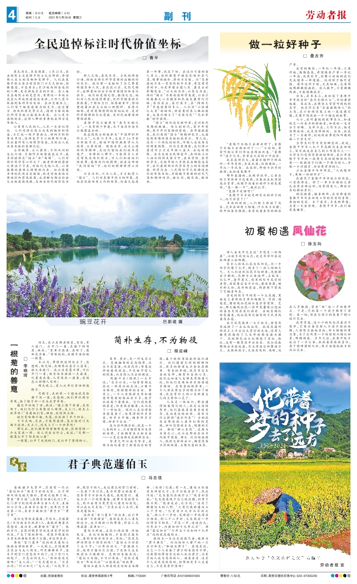 “袁隆平水稻又出新品种了,袁隆平水稻又出新品种了……”小时候,常常听到父辈们传达这样的讯息。“袁隆平”这个大名,常常在大家的口中谈论。 我在农村长大,看着水稻种子的品种一年年更新,长成禾苗,结满穗粒,一年比一年沉甸。在农村,即使不识字的祖母,也知道袁隆平。 那年春播时,我刚学识字,父亲在院子里拆种子包装袋,准备放在缸里浸泡后育芽,他随手指着水稻种子的包装袋,“袁—隆—平”,教我认字。 “袁隆平是谁呀?” “袁隆平爷爷就是研究水稻种子的人,他可厉害了!” 丰收的时候,人们脸上堆满了笑容,大家在田埂上相遇,汗水来不及擦,就开始各自报数,各家说着各家的稻谷产量。 我家的粮仓,一年比一年满,父亲种地,勤勤恳恳,希望粮食产量一年比一年高,收获时节,就像小时候的我们交成绩单一样谨慎。他对种子格外爱惜。每年选种子时,尤其细致,总要筛选那颗颗饱满的。农人眼中,只有颗颗饱满,才能穗穗成长。 后来,在书本上,我知道了袁隆平爷爷的身份“杂交水稻之父”,对他肃然起敬。再后来,在课堂上常常听到他的名字。他是作文里“我最敬佩的人”的主角,是小时候试卷上的一道道填空题,是围炉闲谈的一个个励志的故事。 从小,我听着他的故事长大,知道他是一位真正的耕耘者,知道他一生专注于田畴。生命不息,工作不止,他是这样说的,也是这样做的。后来,我成为了一名教师,把他的故事说给所教的每一个学生听。 当学生们学习有些懈怠时,我说,袁隆平爷爷八九十岁高龄还走在田埂上,坚定地走在自己的工作岗位上……当学生们觉得学英语好难时,我打开袁隆平爷爷的一段英文采访视频给他们看……鼓励孩子们做一个努力的人,并做一个对国家、对世界有用的人。 正如袁隆平爷爷所说,“人就像种子,要做一粒好种子”。 我看见了袁隆平爷爷逝去的消息,心里很难过。种了一辈子水稻的父亲也会有些难过吧,还有村里人,那些朴实的耕耘者们。 稻花散落,稻香阵阵,我仿佛看到袁隆平爷爷在田间工作的朴实的身影、亲切的笑容。禾下乘凉,多美的梦想,总有一天会实现。袁隆平爷爷,我们由衷感谢您。