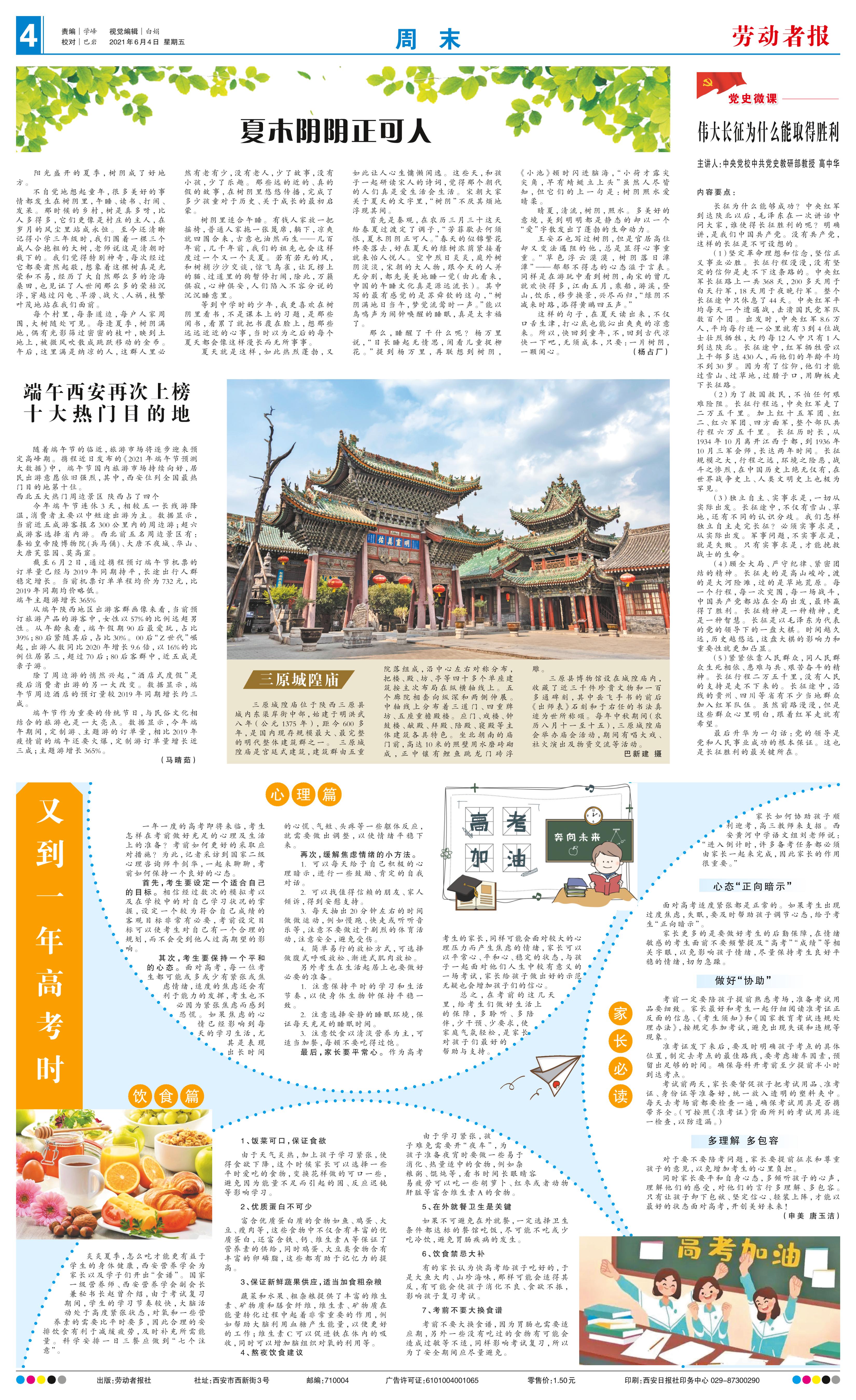 心 理 篇 一年一度的高考即将来临,考生怎样在考前做好充足的心理及生活上的准备?考前如何更好的采取应对措施?为此,记者采访到国家二级心理咨询师牛剑华,一起来聊聊,考前如何保持一个良好的心态。 首先,考生要设定一个适合自己的目标。相信经过数次的模拟考以及在学校中的对自己学习状况的掌握,设定一个较为符合自己成绩的客观目标非常有必要,考前设定目标可以使考生对自己有一个合理的规划,而不会受到他人过高期望的影响。 其次,考生要保持一个平和的心态。面对高考,每一位考生都可能或多或少有紧张或焦虑情绪,适度的焦虑还会有利于能力的发挥,考生也不必因为紧张焦虑而感到恐慌。如果焦虑的心情已经影响到每天的学习生活,尤其是表现 出长时间的心慌、气短、头疼等一些躯体反应,就需要做出调整,以使情绪平稳下来。 再次,缓解焦虑情绪的小方法。 1. 可以每天给予自己积极的心理暗示,进行一些鼓励、肯定的自我对话。 2. 可以找值得信赖的朋友、家人倾诉,得到安慰支持。 3. 每天抽出20分钟左右的时间做做运动,例如慢跑、快走或听听音乐等,注意不要做过于剧烈的体育活动,注意安全,避免受伤。 4. 简单易行的放松方式,可选择做腹式呼吸放松、渐进式肌肉放松。 另外考生在生活起居上也要做好必要的准备。 1. 注意保持平时的学习和生活节奏,以使身体生物钟保持平稳一致。 2. 注意选择安静的睡眠环境,保证每天充足的睡眠时间。 3. 注意饮食以清淡营养为主,可适当加餐,每顿不要吃得过饱。 最后,家长要平常心。作为高考考生的家长,同样可能会面对较大的心理压力而产生焦虑的情绪,家长可以以平常心、平和心、稳定的状态,与孩子一起面对他们人生中较有意义的一场考试,家长给孩子做出好的示范无疑也会增加孩子们的信心。 总之,在考前的这几天里,给考生们做好生活上的保障,多聆听、多陪伴,少干预、少要求,使家庭气氛轻松,是家长对孩子们最好的帮助与支持。 饮 食 篇 炎炎夏季,怎么吃才能更有益于学生的身体健康,西安营养学会为家长以及学子们开出“食谱”。国家一级营养师、西安营养学会副会长兼秘书长赵曾介绍,由于考试复习期间,学生的学习节奏较快,大脑活动处于高度紧张状态,对氧和一些营养素的需要比平时要多,因此合理的安排饮食有利于减缓疲劳,及时补充所需能量。科学安排一日三餐应做到“七个注意”。 1、饭菜可口,保证食欲 由于天气炎热,加上孩子学习紧张,使得食欲下降,这个时候家长可以选择一些平时爱吃的食物,变换花样做的可口一些,避免因为能量不足而引起的困、反应迟钝等影响学习。 2、优质蛋白不可少 富含优质蛋白质的食物如鱼、鸡蛋、大豆、瘦肉等,这些食物中不仅含有丰富的优质蛋白,还富含铁、钙、维生素A等保证了营养素的供给,同时鸡蛋、大豆类食物含有丰富的卵磷脂,这些都有助于记忆力的提高。 3、保证新鲜蔬果供应,适当加食粗杂粮 蔬菜和水果、粗杂粮提供了丰富的维生素、矿物质和膳食纤维,维生素、矿物质在能量转化过程中起着非常重要的作用,例如帮助大脑利用血糖产生能量,以便更好的工作;维生素C可以促进铁在体内的吸收,同时可以增加脑组织对氧的利用等。 4、熬夜饮食建议 由于学习紧张,孩子难免需要开“夜车”,为孩子准备夜宵时要做一些易于消化、热量适中的食物,例如杂粮粥、馄炖等,看书时间长眼睛容易疲劳可以吃一些胡萝卜、红枣或者动物肝脏等富含维生素A的食物。 5、在外就餐卫生是关键 如果不可避免在外就餐,一定选择卫生条件都达标的餐馆吃饭,尽可能不吃或少吃冷饮,避免胃肠疾病的发生。 6、饮食禁忌大补 有的家长认为快高考给孩子吃好的,于是大鱼大肉、山珍海味,那样可能会适得其反,有可能会使孩子消化不良、食欲不振,影响孩子复习考试。 7、考前不要大换食谱 考前不要大换食谱,因为胃肠也需要适应期,另外一些没有吃过的食物有可能会造成过敏等不适,同样影响考试复习,所以为了安全期间应尽量避免。 家长必读 家长如何协助孩子顺利迎考,高三教师来支招。西安黄河中学语文组刘老师说:“进入倒计时,许多备考任务都必须由家长一起来完成,因此家长的作用很重要。” 心态“正向暗示” 面对高考适度紧张都是正常的。如果考生出现过度焦虑,失眠,要及时帮助孩子调节心态,给予考生“正向暗示”。 家长更多的是要做好考生的后勤保障,在情绪敏感的考生面前不要频繁提及“高考”“成绩”等相关字眼,以免影响孩子情绪,尽量保持考生良好平稳的情绪,切勿急躁。 做好“协助” 考前一定要陪孩子提前熟悉考场,准备考试用品要细致。家长最好和考生一起仔细阅读准考证正反面的信息、《考生须知》和《国家教育考试违规处理办法》,按规定参加考试,避免出现失误和违规等现象。 准考证发下来后,要及时明确孩子考点的具体位置,制定去考点的最佳路线,要考虑堵车因素,预留出足够的时间。确保每科开考前至少提前半小时到达考点。 考试前两天,家长要督促孩子把考试用品、准考证、身份证等准备好,统一放入透明的塑料夹中。每天去考场前都要检查一遍,确保考试用具是否携带齐全。(可按照《准考证》背面所列的考试用具逐一检查,以防遗漏。) 多理解 多包容 对于要不要陪考问题,家长要提前征求