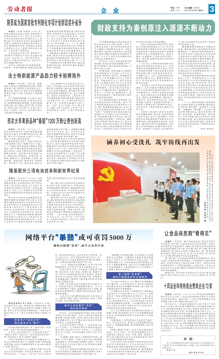 本报讯(徐颖 张琪悦)6月7日,记者从陕西省财政厅获悉:国家知识产权局日前发布《关于2021年专利转化专项计划拟奖补省份名单的公示》,根据2021年专利转化专项计划实施的相关规定,陕西成为全国首批专利转化专项计划财政奖补省份,将获得中央财政补助资金1亿元。据悉,陕西也是入选这一计划的唯一西部省份。 为申报此次专项计划,陕西制定了《陕西省专利转化专项计划实施方案(2021―2023年)》。经专家评审后一致认为,实施方案谋划长远、切实可行,具有很强的操作性。 近年来,省财政厅认真贯彻省委、省政府一系列决策部署,抢抓国家实施积极财政政策的重要机遇,做好项目储备,积极争取中央财政支持,全省知识产权工作不断取得新进步。2020年,全省有效发明专利拥有量 5.5 万件,全省每万人发明专利拥有量达到14.1件,居全国第7位。下一步,陕西省财政厅将认真落实党中央、国务院关于完善要素市场化配置的重大决策和强化知识产权运用的重要部署,进一步梳理全省促进技术转移转化相关政策,推动专项计划实施方案加快实施,逐步形成激励有效、转化充分、体系完善的专利运营生态链,为“十四五”时期陕西省不断深化改革,建设高标准市场体系,推进高质量发展提供强有力的支撑。