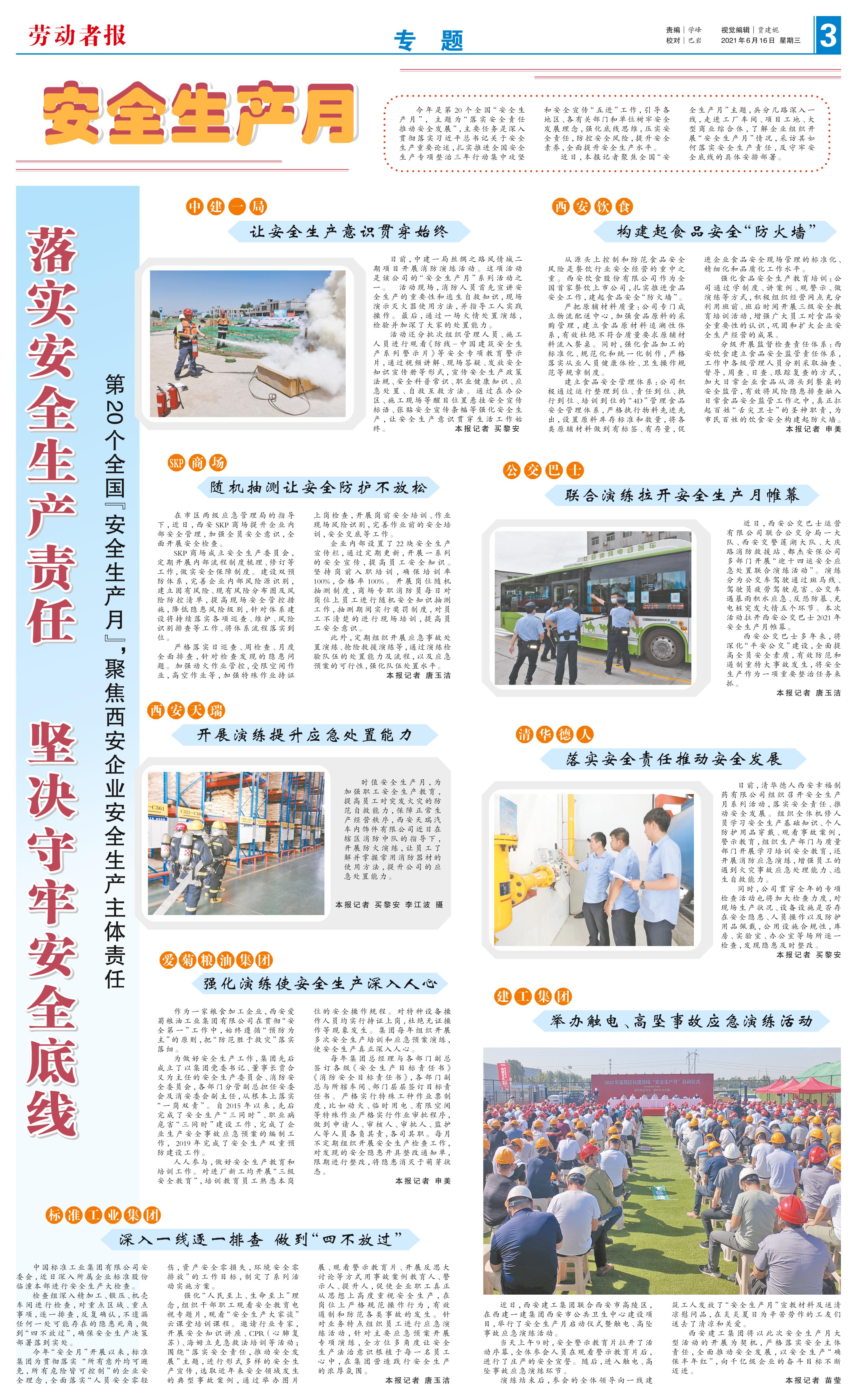 今年是第20个全国“安全生产月”,主题为“落实安全责任推动安全发展”,主要任务是深入贯彻落实习近平总书记关于安全生产重要论述,扎实推进全国安全生产专项整治三年行动集中攻坚和安全宣传“五进”工作,引导各地区、各有关部门和单位树牢安全发展理念,强化底线思维,压实安全责任,防控安全风险,提升安全素养,全面提升安全生产水平。 近日,本报记者聚焦全国“安全生产月”主题,兵分几路深入一线,走进工厂车间、项目工地、大型商业综合体,了解企业组织开展“安全生产月”情况,采访其如何落实安全生产责任,及守牢安全底线的具体安排部署。 中建一局 让安全生产意识贯穿始终 日前,中建一局丝绸之路风情城二期项目开展消防演练活动。这项活动是该公司的“安全生产月”系列活动之一。 活动现场,消防人员首先宣讲安全生产的重要性和逃生自救知识,现场演示灭火器使用方法,并指导工人实践操作。最后,通过一场火情处置演练,检验并加深了大家的处置能力。 活动还分批次组织管理人员、施工人员进行观看《防线-中国建筑安全生产系列警示片》等安全专项教育警示片,通过视频讲解、现场答疑、发放安全知识宣传册等形式,宣传安全生产政策法规、安全科普常识、职业健康知识、应急处置、自救互救方法。通过在办公区、施工现场等醒目位置悬挂安全宣传标语、张贴安全宣传条幅等强化安全生产,让安全生产意识贯穿生活工作始终。 本报记者 买黎安 西安饮食 构建起食品安全“防火墙” 从源头上控制和防范食品安全风险是餐饮行业安全经营的重中之重。西安饮食股份有限公司作为全国首家餐饮上市公司,扎实推进食品安全工作,建起食品安全“防火墙”。 严把原辅材料质量:公司专门成立物流配送中心,加强食品原料的采购管理,建立食品原材料追溯性体系,有效杜绝不符合质量要求原辅材料流入餐桌。同时,强化食品加工的标准化、规范化和统一化制作,严格落实从业人员健康体检、卫生操作规范等规章制度。 建立食品安全管理体系:公司积极通过运行整理到位、责任到位、执行到位、培训到位的“4D”管理食品安全管理体系,严格执行物料先进先出,设置原料库存标准和数量,将各类原辅材料做到有标签、有存量,促进企业食品安全现场管理的标准化、精细化和品质化工作水平。 强化食品安全生产教育培训:公司通过学制度、讲案例、观警示、做演练等方式,积极组织经营网点充分利用班前、班后时间开展三级安全教育培训活动,增强广大员工对食品安全重要性的认识,巩固和扩大企业安全生产经营的成果。 分级开展监督检查责任体系:西安饮食建立食品安全监管责任体系,工作中各级管理人员分别采取抽查、督导,周查、日查、跟踪复查的方式,加大日常企业食品从源头到餐桌的安全监管,有效将风险隐患排查融入日常食品安全监管工作之中,真正扛起百姓“舌尖卫士”的圣神职责,为市民百姓的饮食安全构建起防火墙。 本报记者 申美 SKP商场 随机抽测让安全防护不放松 在市区两级应急管理局的指导下,近日,西安SKP商场提升企业内部安全管理,加强全员安全意识,全面开展安全检查。 SKP商场成立安全生产委员会,定期开展内部流程制度梳理、修订等工作,做实安全保障制度。建设双预防体系,完善企业内部风险源识别,建立固有风险、现有风险分布图及风险防控清单,提高现场安全管控措施,降低隐患风险级别,针对体系建设将持续落实各项巡查、维护、风险识别排查等工作、将体系流程落实到位。 严格落实日巡查、周检查、月度全面排查,针对检查发现的隐患问题。加强动火作业管控,受限空间作业,高空作业等,加强特殊作业持证上岗检查,开展岗前安全培训、作业现场风险识别,完善作业前的安全培训,安全交底等工作。 企业内部设置了22块安全生产宣传栏,通过定期更新,开展一系列的安全宣传,提高员工安全知识。坚持岗前入职培训,确保培训率100%,合格率100%。开展岗位随机抽测制度,商场专职消防员每日对岗位上员工进行随机安全知识抽测工作,抽测期间实行奖罚制度,对员工不清楚的进行现场培训,提高员工安全意识。 此外,定期组织开展应急事故处置演练、抢险救援演练等,通过演练检验队伍的处置能力及流程,以及应急预案的可行性,强化队伍处置水平。 本报记者 唐玉洁 公交巴士 联合演练拉开安全生产月帷幕 近日,西安公交巴士运营有限公司联合公交分局一大队、西安交警莲湖大队、大庆路消防救援站、都杰安保公司多部门开展“迎十四运安全应急处置联合演练活动”。演练分为公交车驾驶通过斑马线、驾驶员疲劳驾驶危害、公交车遇暴雨积水应急、反恐防暴、充电桩突发火情五个环节。本次活动拉开西安公交巴士2021年安全生产月帷幕。 西安公交巴士多年来,将深化“平安公交”建设,全面提高全员安全素质,有效防范和遏制重特大事故发生,将安全生产作为一项重要整治任务来抓。 本报记者 唐玉洁 西安天瑞 开展演练提升应急处置能力 时值安全生产月,为加强职工安全生产教育,提高员工对突发火灾的防范自救能力,保障正常生产经营秩序,西安天瑞汽车内饰件有限公司近日在辖区消防中队的指导下,开展防火演练,让员工了解并掌握常用消防器材的使用方法,提升公司的应急处置能力。 本报记者 买