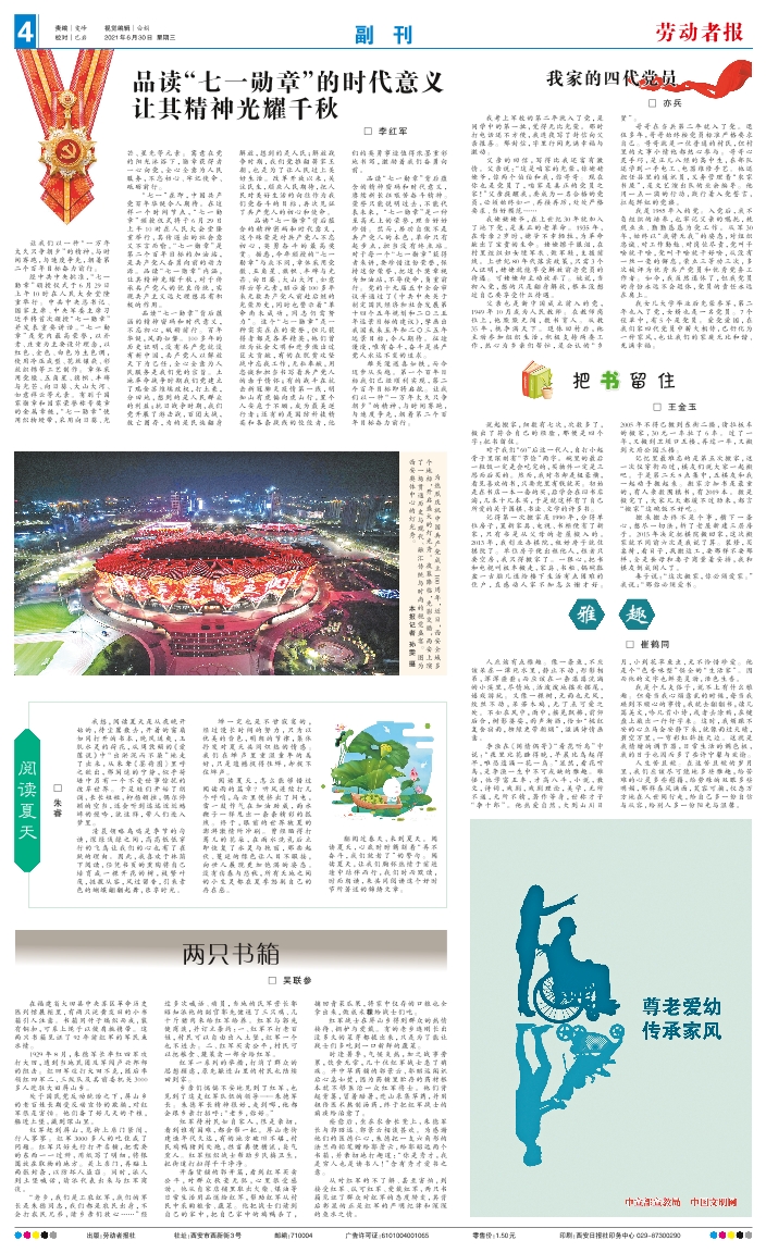 我考上军校的第二年就入了党,是同学中的第一批,觉得无比光荣。那时打电话还不方便,我连夜写了封信向父亲报喜。那封信,字里行间充满幸福与激动。 父亲的回信,写得比我还富有激情。父亲说:“这是咱家的光荣,你姥姥姥爷,你两个伯伯和我,你哥哥。现在你也是党员了,咱家是真正的党员之家!”父亲提醒我,要成为一名合格的党员,必须始终如一、再接再厉,处处严格要求、当好模范…… 我姥姥姥爷,在上世纪30年就加入了地下党,是真正的老革命。1935年,在母亲2岁时,姥爷不幸牺牲,为革命献出了宝贵的生命。姥姥擦干眼泪,在村里组织妇女缝军衣、做军鞋,支援前线。上世纪80年代落实政策,只需3个人证明,姥姥就能享受解放前老党员的待遇。可姥姥却主动放弃了。她说,当初入党,想的只是翻身解放,根本没想过自己要享受什么待遇。 父亲也是新中国成立前入的党,1949年10月成为人民教师。在教师岗位上,他默默无闻,教书育人。从教35年,桃李满天下。退休回村后,他主动参加组织生活,积极支持两委工作,热心为乡亲们帮忙,是公认的“乡贤”。 哥哥在当兵第二年就入了党。退伍多年,哥哥始终按党员标准严格要求自己。哥哥就是一位普通的村民,但村里的大事小情他都热心参与。哥哥心灵手巧,是正儿八经的高中生,在部队还学到一手电工、电器维修手艺。他还担任县里的通讯员,义务管理着“农家书屋”,是文艺演出队的业余编导。他用一点一滴的行动,践行着入党誓言,扛起鲜红的党旗。 我是1985年入的党。入党后,我不负组织的培养,也牢记父亲的嘱托,兢兢业业、勤勤恳恳为党工作。从军30年,始终以“我将无我”的姿态,对组织忠诚、对工作勤勉、对岗位尽责,党叫干啥就干啥,党叫干啥就干好啥,从没有一丝一毫的懈怠,荣立三等功三次,多次被评为优秀共产党员和优秀党务工作者。如今,我虽然退休了,但我党员的身份永远不会退休,党员的责任永远在肩上。 我女儿大学毕业后光荣参军,第二年也入了党,女婿也是一名党员。7个侄辈中,有5个是党员。爱党爱国,在我们家四代党员中薪火相传,已衍化为一种家风,也让我们的家庭无比和谐、充满幸福。