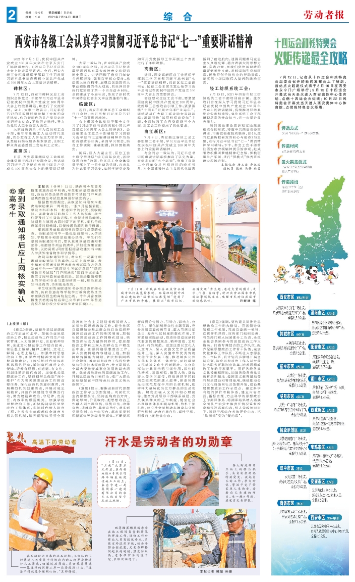 2021年7月1日,庆祝中国共产党成立100 周年大会在北京天安门广场隆重举行,习近平总书记在庆祝大会上发表重要讲话。会后,西安各级工会积极组织干部职工学习贯彻习近平总书记在庆祝中国共产党成立100周年大会上重要讲话精神。 碑林区: 7月12日,西安市碑林区总工会组织全体党员、干部学习习近平总书记在庆祝中国共产党成立100周年大会上的重要讲话,并进行了交流研讨。会上,大家一致表示,习近平总书记的重要讲话激发起了大家的奋进热情,作为新时代的共产党员必将牢记初心使命,不负历史重任,努力为党和人民争取更大光荣。 大家纷纷表示,作为党员和工会干部,要牢牢把握工人运动时代主题,充分发挥工人阶级主力军作用,认真履行维权服务基本职责,让职工群众真正感受到工会是职工之家。 莲湖区: 日前,西安市莲湖区总工会组织全体党员干部召开专题会议,传达学习习近平总书记在庆祝中国共产党成立100周年大会上的重要讲话精神。 大家一致认为,在中国共产党成立100周年之际,习近平总书记发表重要讲话具有重大政治意义和深远历史意义。讲话回顾了我党百年奋斗光辉历程,强调百年初心使命,总结伟大建党精神,展现党创造的伟大事业和取得的伟大成就,向世界宣告我们党实现了第一个百年奋斗目标,全面建成了小康社会,体现了新时代中国特色社会主义事业的蓬勃气象。 临潼区: 近日,西安市临潼区总工会组织召开会议,学习贯彻习近平总书记“七一”重要讲话精神。 会上带领全体党员干部全文学习了《习近平总书记在庆祝中国共产党成立100周年大会上的讲话》。会议要求全体党员干部要把学习贯彻习近平总书记重要讲话精神作为当前首要政治任务,全面学习领会,结合工作实际,准确把握,抓好贯彻落实。 随后,区人大副主任、区总工会主席宁掌珠以“学习百年党史,汲取奋进力量”为题,给区总工会全体党员干部上了一节生动的党课,内容从为什么要学习党史,如何学好党史及如何用党史指导工作开展三个方面进行了详细讲解。 高新区: 近日,西安高新区总工会组织干部职工学习贯彻习近平总书记“七一”重要讲话精神,高新区党工委副书记、区总工会主席王宽让领学习近平总书记在庆祝中国共产党成立100周年大会上的重要讲话。 会议要求全区工会干部,要紧紧围绕庆祝中国共产党成立100周年,做好职工思想政治引领工作;紧紧围绕“十四五”开局之年和“全运年”,团结动员广大职工群众助力追赶超越;紧紧围绕“基层组织建设年”主题,全面加强工会自身建设三个方面,对工会工作提出了具体要求。 曲江新区: 7月9日,西安曲江新区工会工委组织工会干部,学习习近平总书记在庆祝中国共产党成立100周年大会上的重要讲话精神。 与会同志一致认为,习近平总书记的重要讲话系统提出了以史为鉴、开创未来的“九个必须”,吹响了向第二个百年奋斗目标迈进的嘹亮号角,为全面建设社会主义现代化国家指明了前进航向,通篇闪耀着马克思主义真理光辉,蕴含着强大的思想力量、实践力量,是我们党治国理政的重要纲领性文献,是科学指引党和国家、民族开创千秋伟业的行动指南,是实现中华民族伟大复兴的政治宣言。 轻工纺织系统工会: 7月13日,2021年西安市轻工纺织系统工会干部培训班开课。此次培训旨在深入学习贯彻习近平总书记在庆祝中国共产党成立100周年大会上的讲话精神,持续推进轻纺系统企业班组建设,强化系统工会干部履职尽责的使命担当,进一步提升业务能力。 培训采取理论宣讲和实地观摩相结合的形式,特邀中共西安市委宣讲团、市委党校教授刘晓芬,以《从党的发展历程看党的初心与使命》为主题,进行习近平总书记“七一”讲话精神学习辅导;下午,参会工会干部前往西安市劳模精神展示馆参观,赴咸阳纺织集团梦桃精神纪念馆、梦桃班组生产车间,进行“梦桃式”优秀班组建设现场培训。 本报记者 唐玉洁 李江波通讯员 张琳 冯倩 韩苗