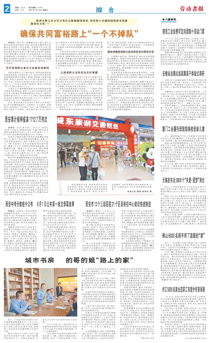 本报讯(杨小玲)随着陕西省分层分类社会救助制度体系的逐步完善,越来越多困难群众的基本生活得到了有力保障。尤其是今年以来,陕西省民政厅结合开展党史学习教育,将城镇困难群众救助帮扶作为践行“我为群众办实事”实践活动和“解忧暖心传党恩”行动重要内容,从加快推进城镇低收入家庭救助工作、加大城镇特殊困难群体关爱帮扶力度等10个方面,持续加大对城镇困难群众的救助帮扶力度,确保共同富裕路上“一个不掉队”。 织牢困难群众基本生活救助保障网 为防止低收入人口致贫返贫,陕西省民政系统加快推进低收入家庭认定工作,及时将符合条件的家庭按程序确认为低收入家庭,将低收入家庭中的重病、重残人员参照“单人户”纳入低保范围。截至5月底,全省共认定城乡低收入家庭9.81 万户28.62万人,低收入家庭中的重病、重残人员参照“单人户”纳入低保2.11万人。 全省扎实开展城镇困难群众社会救助政策落实情况大排查活动,排查了近两年来申请过社会救助但未审核通过的城镇困难群众9454户;新纳入城镇低保10.85万户19.57万人,落实“重病重残刚性支出和必要的就业成本扣减”1.75万户,实施“分类施保”6.47万人、“渐退帮扶”1318户。 近日,省政府成立省未成年人保护工作领导小组,着力构建家庭保护、学校保护、社会保护、网络保护、政府保护、司法保护“六位一体”的新时代未成年人保护工作格局。省民政厅自4月22日起全面开展残疾人两项补贴资格认定申请“跨省通办”,申请人可以向全国范围内任何乡镇(街道)设立的残疾人两项补贴受理窗口提出申请,不受户籍地限制。 对符合条件的群众以及其他社会救助制度暂时无法覆盖的困难群众,陕西省民政部门及时给予临时救助,保障其基本生活。推动全省1312个乡镇(街道)全部建立临时救助储备金制度,小额和紧急情况的临时救助实现乡镇(街道)直接审批,方便困难群众及时受助。今年1月至5月,全省累计实施临时救助28.6万人次,发放临时救助金2.6亿元。 让困难群众受助更加及时便捷 为实现“让信息多跑路、让群众少跑腿”的目标,陕西民政“e救助”微信公众号上线运行,困难群众通过手机足不出户即可办理救助业务。截至目前,全省已有14.2万人次通过“e救助”申请获得社会救助,审批通过率达到80.62%。 规范完善急难对象主动发现、“一门受理、协同办理”、快速响应服务等工作机制。全省19974个村组(社区)全部建立“急难问题快速响应服务队”,主动发现并协助符合救助条件的对象申办各类救助保障业务或提供各类帮扶服务。陕西省民政系统推动所有乡镇(街道)全面建立“一门受理、协同办理”工作机制,完善窗口服务制度,科学细化受理、分办、转办、反馈等工作流程,确保困难群众“求助有门”。 陕西省民政厅积极推行社会救助审核确认权限下放,将低保对象、特困人员审核确认权限全面下放至乡镇人民政府(街道办事处),实现救助更及时、保障更有力、动态管理更高效。 确保城镇困难群众救助帮扶更加精准有效 在渭南市富平县,“智慧养老”现已成为养老服务的新模式。渭南市民政局依托互联网资源,将分散居住的老人全部纳入信息化管理,及时准确地将定制服务贴心送达,满足更多元的养老需求,形成了“平台+服务+老人+终端”的现代新型智能居家养老服务模式,有效缓解了空巢、独居、特困老人的生活困难等问题。 这是陕西省实施政府援助居家养老的一个缩影。同时,陕西省开展了分散供养特困人员探视服务,降低独居老人居家养老风险,确保困难老人居家养老安全。 陕西省民政系统大力推进部门数据共享比对,不断健全防返贫监测预警机制,精准掌握困难对象情况,第一时间走访确认,及时将陷入困境的群众纳入救助范围。此外,省民政系统还主动将城市低保数据与人社、医保、残联等部门进行共享对接,有效推动有关部门落实社保、医保等专项救助帮扶措施。 民政部门动员引导行业协会商会、慈善组织、专业社工、志愿者等社会力量参与城镇困难群众救助帮扶工作。开展培育发展社区社会组织专项行动,支持社区社会组织通过综合包户、结对帮扶等多种方式,为城镇困难群体提供生活照料、心理疏导、法律援助等关爱服务。