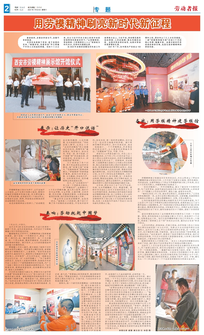 陕西省人大常委会副主任、省总工会主席郭大为,西安市委副书记、市委政法委书记韩松共同为劳模精神展示馆揭牌。 一线职工代表正在聆听全国劳动模范徐虎的故事 省劳模陈艳聆听母亲于素梅的故事 工作人员正在精心布展 市民参观劳模精神展示馆 环卫工人以“金牌工人”为榜样 市劳模王学武一双鞋穿了20多年 勤者能劳,多勤多劳者生巧,多勤巧劳者善造。 中华民族是勤于劳动、善于创造的民族,“尊重劳动,热爱劳动”早已根植于中华儿女的血脉精魂。党的十八大以来,在以习近平同志为核心的党中央的坚强领导和真挚关怀下,“让劳模精神、劳动精神、工匠精神深入人心”逐渐成为时代共识,在新时代熠熠生辉。 在2020年全国劳动模范和先进工作者表彰大会上,习近平说,劳动模范是民族的精英、人民的楷模,是共和国的功臣。这是对劳动者的肯定,也是对劳动实现梦想的礼赞。 2021年7月,在中国共产党成立100周年之际,西安市土门工人文化宫南院,一座“劳模精神展示馆”历经4 个月的精心布展,隆重开馆。这是对新时代劳动者的使命召唤,也是弘扬劳模精神的具体实践。 展示:让历史“开口说话” 劳模精神展示馆分为序厅、正厅及尾厅三大版块,正厅是展示馆核心版块,按照时间轴和劳模精神发展历程,区分群星耀九州、回首来时路、走进新时代3个展示单元,分别展示全国、陕西、西安地区劳模风采和劳动精神的丰硕成果。 走进劳模精神展示馆序厅,“劳动模范是民族的精英、人民的楷模,是共和国的功臣。”的标语映入眼帘,头顶正上方“全国劳动模范”的巨型徽章闪闪发光,两侧写有“爱岗敬业、艰苦奋斗、淡泊名利、争创一流、勇于创新、甘于奉献”和“劳动最光荣、劳动最崇尚、劳动最伟大、劳动最美丽”的字样。 正厅里讲述了各个时期、各行各业涌现出的劳动模范,像“两弹元勋”邓稼先、“共和国勋章”获得者钟南山,“梦桃精神”的原型赵梦桃等,把他们的事迹以图、文为基础,采取现代声、光、电的表现形式,把劳模精神立体地展现出来。 其中,在“走进新时代”单元有一个创新亮点版块,叫“劳模佳话”,这里集中了8个关于劳模有趣、感人的小故事,他们中有母女劳模、父女劳模、夫妻劳模、全家劳模、同名劳模、劳模演劳模等,只需拿起展板旁的听筒,他们的故事便会映入耳畔。 “像这种形式展现劳模精神,还是第一次见。”退休职工吕奶奶说,整个展厅汇集了各个时期的劳动模范,不仅有西安市的,还有全国、省一级的劳动模范,其中也不乏一些大家耳熟能详的劳模。展厅根据劳模的事迹特点,进行实景还原,通过一张张照片、一个个劳模物品,在多情景的交流互动中,让人感受到劳模就在身边,“劳模精神”可亲、可敬、可学。 西安市人大常委会副主任、市总工会主席薛振虎说,自今年3月2日经西安市总工会主席办公会研究决定后,西安市劳模精神展示馆就全面启动了。劳模精神、劳动精神、工匠精神是以爱国主义为核心的民族精神,是以改革创新为核心的时代精神的生动体现,是党精神体系的重要组成部分,是鼓舞全党全国各族人民风雨无阻、勇敢前进的强大精神力量。西安市总要依托劳模精神展示馆,大力学习宣传弘扬劳模精神,引导广大职工见贤思齐,争当劳模,进一步焕发劳动热情,释放创造潜能,坚定不移听党话,矢志不渝跟党走,建功立业新时代,汇聚起西安建设国家中心城市和追赶超越的蓬勃力量。 近年来,西安市总工会下大力气弘扬、传承、光大劳模精神,关心、尊重劳模。按照中华全国总工会关于加强和规范工人文化宫管理的要求,把清租出来的场地用来建设劳模精神展示馆,是工会聚焦主责主业的具体体现,也是在新时代弘扬劳模精神、让劳模精神在古城大地上开花结果的具体体现,也是工会系统为中国共产党成立100周年献礼的重点工程。 奋战:用劳模精神建劳模馆 劳模精神展示馆建设项目全面启动后,市总立即成立了西安市劳模精神展示馆建设专班,工作专班下设策划文秘组、资料收集组、项目建设组、运营管理组4个西安市劳模精神展示馆工作机构,经过4个月的共同努力,劳模精神展示馆落成了。 一张张劳模照片,一件件劳模物品,展示了我国各个时期的劳模,为了党的事业、国家的建设发展艰苦奋斗的光辉历程,让参观者在一个个震撼人心的创业故事中,激发力量,感受劳动光荣。 “接到任务是3月上旬,感觉责任特别大,更感使命神圣。”王罡是资料收集组的一员,从项目前期征集劳模史料、文献缩编,到建馆期间实地走访劳模本人、劳模亲属搜集照片、实物,王罡全程参与。 让他印象最深的是去临潼区南庙村庞玉芹红色教育基地,为了让更多人学习庞玉芹带领村民脱贫致富的故事,收集组通过区工会与教育基地人员取得联系,再三沟通却被告知物品都被封存在展示柜里难以取出,眼看就要无功而返,可收集组不死心,半路折返再次游说,真诚的态度打动了对方,最终协助他们打开了展柜,拿到了珍贵的资料。 建设劳模馆是市总工会劳模管理和劳模宣传工作的一个里程碑。期间,资料收集组人员共缩编文献15万余字,收集照片3千余张,实物展品近千件。他们只是劳模精神展示馆工作团队的一个缩影,却展现了新时期工会干部“功成未必在我,建功必定有我”的责任担当。 入伏后的西安,持续高温,在施工现场,坐在轮