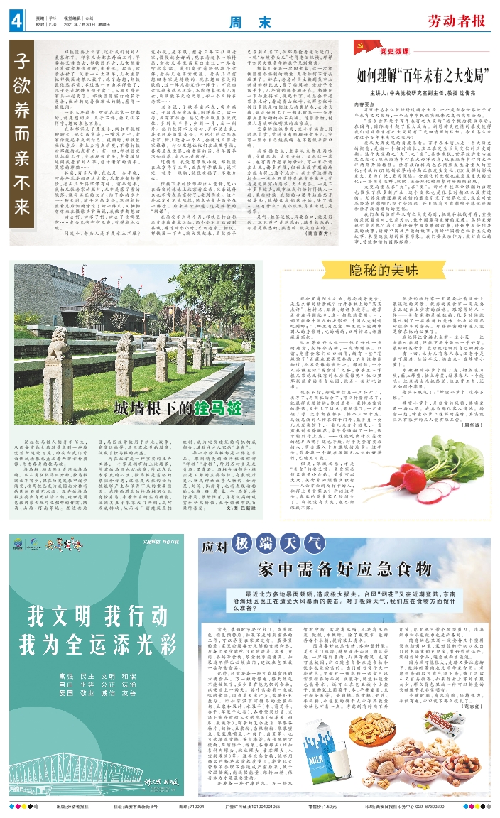 最近北方多地暴雨频频,造成极大损失。台风“烟花”又在近期登陆,东南沿海地区也正在遭受大风暴雨的袭击。对于极端天气,我们应在食物方面做什么准备? 首先,暴雨时节要少出门。发布红色、橙色预警后,如果不是特别重要的工作,可以尽量在家里进行。最要紧的是:家里必须备好足够的食物和水,应备上至少能吃 3天的蔬菜、水果、鱼肉、蛋奶等食物,尽量把冰箱填满。如果迫不得已必须出门,建议在包里放一些即食食品。 此外,还需要备一些可直接食用的方便食品。万一短时停电、停天然气不能做饭了,至少要有能充饥的食物,以便顶上一两天。其中需要有一点咸味的食品,因为夏天出汗多,需要补充盐分。比如常温下可储存的盒装牛奶、豆浆和果汁,水果干(枣、葡萄干、杏干、苹果干之类),各种坚果炒货,室温下能存放两三天的水果(如苹果、西瓜、脆桃等),即食的复合麦片、早餐谷物片、奶粉、豆浆粉、杂粮糊粉、袋装蜜豆、袋装鹰嘴豆、牛肉干、卤蛋等。也可选择能量棒、蛋白棒等,或传统的方便面、压缩饼干、榨菜、各种罐头(比如各种肉罐头、豌豆罐头、番茄罐头、八宝粥罐头)等。这些应急食物,就不用那么严格要求营养质量了,毕竟几天营养不合理不会造成严重后果,便于常温储藏,能提供能量、维持血糖、保存体力才是最要紧的。 还要备一些干净的水。万一供水暂时中断,需要有水喝,也要有水洗菜、做饭、冲厕所。除了瓶装水,最好再备个水桶,提前装上清水。 随身备好应急食物、水和塑料袋。夏天出门旅游,特别是去山区、湖区等地,一旦遇到暴雨、山洪等情况,也有可能被困,所以随身自备应急食物和饮水也是必需的。出门时可背个大一些的包,里面放一瓶水和一两盒可以常温储存的牛奶、豆浆等,既能补能量也能补水。还可以在包里放个小盒子,里面装上葡萄干、枣、早餐麦圈、豆子和坚果等。蛋白棒、能量棒、奶片、牛轧糖、小包装的饼干点心等高能量食物也可备一点。考虑到有时撕不开包装,包里也可带个微型剪刀。消毒纸巾和小包纸巾也是必备的。 随身的包里还一定要备几个塑料袋包括封口袋,装好你的手机以及出门时充满电的充电宝,装好你的证件,装好你的食品,避免被雨水浸泡。 因为风可能很大,走路又要注意脚下,旅游时带雨衣比雨伞更合用。考虑到降雨后可能气温下降,饿了之后人又容易怕冷,如果你身上穿的衣服太少,那么背包里放一件可以折叠的长袖速干衣非常明智。 关键时刻,有水有粮,保持体力,手机有电,心中就不那么慌乱了。 (范志红)