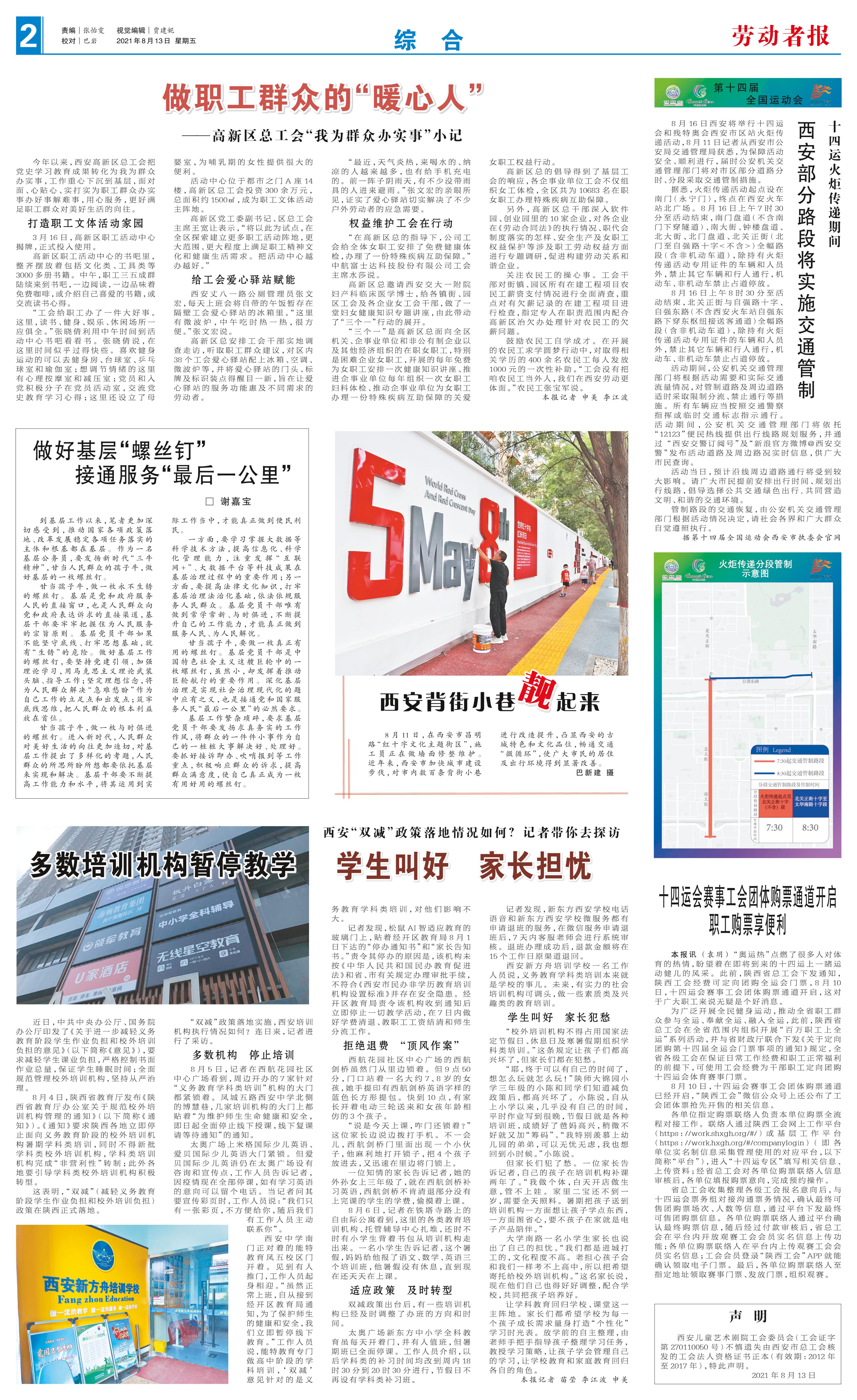 近日,中共中央办公厅、国务院办公厅印发了《关于进一步减轻义务教育阶段学生作业负担和校外培训负担的意见》(以下简称《意见》),要求减轻学生课业负担,严格控制书面作业总量,保证学生睡眠时间;全面规范管理校外培训机构,坚持从严治理。 8月4日,陕西省教育厅发布《陕西省教育厅办公室关于规范校外培训机构管理的通知》(以下简称《通知》)。《通知》要求陕西各地立即停止面向义务教育阶段的校外培训机构暑期学科类培训,同时不得新批学科类校外培训机构,学科类培训机构完成“非营利性”转制;此外各地要引导学科类校外培训机构积极转型。 这表明,“双减”(减轻义务教育阶段学生作业负担和校外培训负担)政策在陕西正式落地。 “双减”政策落地实施,西安培训机构执行情况如何?连日来,记者进行了采访。 多数机构 停止培训 8月5日,记者在西航花园社区中心广场看到,周边开办的7家针对“义务教育学科类培训”机构的大门都紧锁着。凤城五路西安中学北侧的博慧巷,几家培训机构的大门上都贴着“为维护师生生命健康和安全,即日起全面停止线下授课,线下复课请等待通知”的通知。 太奥广场上米格国际少儿英语、爱贝国际少儿英语大门紧锁。但爱贝国际少儿英语仍在太奥广场设有咨询和宣传点,工作人员告诉记者,因疫情现在全部停课,如有学习英语的意向可以留个电话。当记者问其要宣传彩页时,工作人员说:“我们只有一张彩页,不方便给你,随后我们有工作人员主动联系你”。 西安中学南门正对着的能特教育凤五校区门开着。见到有人推门,工作人员起身相迎。“虽然正常上班,自从接到经开区教育局通知,为了保护师生的健康和安全,我们立即暂停线下教育。”工作人员说,能特教育专门做高中阶段的学科培训,‘双减’意见针对的是义务教育学科类培训,对他们影响不大。 记者发现,松鼠AI智适应教育的玻璃门上,贴着经开区教育局8月1日下达的“停办通知书”和“家长告知书。”责令其停办的原因是,该机构未按《中华人民共和国民办教育促进法》和省、市有关规定办理审批手续,不符合《西安市民办非学历教育培训机构设置标准》并存在安全隐患。经开区教育局责令该机构收到通知后立即停止一切教学活动,在7日内做好学费清退、教职工工资结清和师生分流工作。 拒绝退费 “顶风作案” 西航花园社区中心广场的西航剑桥虽然门从里边锁着。但9点50分,门口站着一名大约 7、8岁的女孩,她手提印有西航剑桥英语字样的蓝色长方形提包。快到10点,有家长开着电动三轮送来和女孩年龄相仿的3个孩子。 “说是今天上课,咋门还锁着?”这位家长边说边拨打手机。不一会儿,西航剑桥门里面出现一个小伙子,他麻利地打开锁子,把4个孩子放进去,又迅速在里边将门锁上。 一位知情的家长告诉记者,她的外孙女上三年级了,就在西航剑桥补习英语,西航剑桥不肯清退部分没有上完课的学生的学费,偷摸着上课。 8月6日,记者在铁塔寺路上的自由际公寓看到,这里的各类教育培训机构、托管辅导中心扎堆,还时不时有小学生背着书包从培训机构走出来。一名小学生告诉记者,这个暑假,妈妈给他报了语文、数学、英语三个培训班,他暑假没有休息,直到现在还天天在上课。 适应政策 及时转型 双减政策出台后,有一些培训机构已经及时调整了办班的方向和时间。 太奥广场新东方中小学全科教育虽每天开着门,并有人值班,但暑期班已全面停课。工作人员介绍,以后学科类的补习时间均改到周内18时30分到20时30分进行,节假日不再设有学科类补习班。 记者发现,新东方西安学校电话语音和新东方西安学校微服务都有申请退班的服务,在微信服务申请退班后,7天内客服老师会进行系统审核。退班办理成功后,退款金额将在15个工作日原渠道退回。 西安新方舟培训学校一名工作人员说,义务教育学科类培训本来就是学校的事儿。未来,有实力的社会培训机构可调头,做一些素质类及兴趣类的教育培训。 学生叫好 家长犯愁 “校外培训机构不得占用国家法定节假日、休息日及寒暑假期组织学科类培训。”这条规定让孩子们都高兴坏了,但家长们都在犯愁。 “耶,终于可以有自己的时间了,想怎么玩就怎么玩!”陕师大锦园小学三年级的小陈和同学们知道减负政策后,都高兴坏了。小陈说,自从上小学以来,几乎没有自己的时间,平时作业写到很晚,节假日就是各种培训班,成绩好了爸妈高兴,稍微不好就又加“筹码”。“我特别羡慕上幼儿园的弟弟,可以无忧无虑,我也想回到小时候。”小陈说。 但家长们犯了愁。一位家长告诉记者,自己的孩子在培训机构补课两年了。“我做个体,白天开店做生意,管不上娃。家里二宝还不到一岁,需要全天照料。暑期把孩子送到培训机构一方面想让孩子学点东西,一方面图省心,要不孩子在家就是电子产品陪伴。” 大学南路一名小学生家长也说出了自己的担忧。“我们都是进城打工的,文化程度不高。老担心孩子会和我们一样考不上高中,所以把希望寄托给校外培训机构。”这名家长说,现在他们自己也得好好调整,配合学校,共同把孩子培养好。 让学科教育回归学校、课堂这一主阵地。家长们都希望学校为每一个孩子成长需求量身打造“个性化”学习时光表。放学前的自主整理,由老师手把手指导孩子整理学习任务