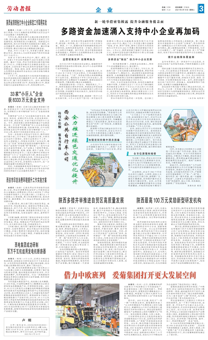 近期,央行、银保监会等金融监管部门密集发声,谋划新一轮举措,进一步加大中小企业支持力度。据悉,下一步,稳健的货币政策要保持流动性合理充裕,结构性政策也将进一步强化,增加对中小企业的定向滴灌。银行信贷、资本市场等多路资金将加速涌入,帮助中小企业缓解资金压力渡过难关,有效提升金融服务覆盖面。 监管密集发声 政策再加力 近日召开的中央政治局会议提出,稳健的货币政策要保持流动性合理充裕,助力中小企业和困难行业持续恢复。 一系列具体部署已经展开。金融政策方面,央行2021年下半年工作会议要求,引导金融机构加大对小微企业、“三农”、制造业等重点领域和薄弱环节支持力度。银保监会下半年工作会也表示,围绕改善经济社会薄弱环节金融服务,继续实施系列纾困政策,不断改善小微企业金融服务。 财政政策也将进一步发力。财政部表示,下一步,将密切跟踪宏观经济形势,考虑助企纾困发展需要,进一步研究完善有关具体政策执行过程中存在的问题,持续激发市场主体活力,促进经济平稳运行和高质量发展。 地方层面也相继展开部署,披露新一轮中小企业支持方案。8月4日北京下发《进一步完善北京民营和小微企业金融服务体制机制行动方案(2021-2023年)》,确定了近三年民营小微企业融资“增量、扩面、降价”目标,督导五家国有大型商业银行北京市分行2021年普惠小微贷款增速不低于30%。8月6日,陕西省财政厅提前下达资金2000万元,支持中国建设银行陕西省分行等12家金融机构降低小微企业贷款利率。 多路资金“输血”助力中小企业发展 一系列政策部署下,多路资金加速涌入,帮助中小企业缓解资金压力,渡过难关。 财政部副部长许宏才近日表示,今年以来,财政部门进一步优化和落实减税降费政策,帮助市场主体恢复元气,增强活力。通过继续实施制度性减税政策、分类调整阶段性的减税降费政策、出台新的结构性减税政策以及持续实施降费措施等,预计全年为市场主体减负将超过7000亿元。 同时,为支持实体经济发展,促进综合融资成本稳中有降,人民银行决定于7月15日下调金融机构存款准备金率0.5个百分点(不含已执行5%存款准备金率的金融机构)。人民银行有关负责人表示,此次降准为全面降准,释放长期资金约1万亿元,目的在于引导金融机构积极运用降准资金加大对小微企业的支持力度。 资本市场的作用也将进一步发挥。近日新三板精选层转板上市制度进入实施阶段。新三板是资本市场服务中小企业的“主阵地”,符合条件的新三板精选层公司可向科创板、创业板转板上市。业内指出,新三板精选层转板上市制度落地,为中小企业提供了一条“边融资、边交易、边上市”的新路径,有利于资本市场将更好地为中小企业赋能。 提升金融服务覆盖面 业内专家表示,进一步支持中小企业发展,未来还应加快产品和服务创新,不断拓宽融资方式和渠道。 国家金融与发展实验室特聘研究员任涛认为,一方面,可以鼓励通过尽职免责、单列信贷计划、内部资金转移定价优惠等形式,提高服务小微企业积极性和强化资源保障。另一方面,充分利用科技赋能平台进行融资对接,持续加大首贷、续贷、信用贷款、中长期贷款投放力度。此外,探索金融科技在客户信用评价、授信准入、风险管理等环节的应用,有效提升金融服务覆盖面。 谈及如何平衡风险与帮扶小微企业的关系,任涛认为,可以进一步发展小微企业贷款保证保险,同时支持银行与国家融资担保基金、国家农业信贷担保联盟开展合作,明确风险分担比例,降低担保费用和企业融资成本。 (汪子旭 向家莹)