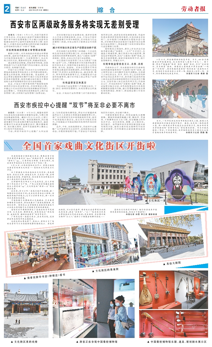 ▲文化街区一景 ▲读者在新华书店(钟楼店)看书 ▲ 文化街区的美食街 ▲易俗大剧院 ▲文化街区里的戏楼 ▲游客正在参观中国秦腔博物馆 ▲中国秦腔博物馆乐器、道具、原创剧本展示区 充满着秦腔古韵的露天戏台、聚集在架子鼓等乐器旁准备音乐“show”的潮流青年、回荡着的“秦味儿”rap......汇集传统与新潮、古典与现代,这是西安市易俗社文化街区方言广场的一景。 9月14日,以西安易俗社为中心、重装打造的全国首家戏曲文化街区——易俗社文化街区正式开街。 位于钟楼东北角的易俗社文化街区,东起案板街、西至北大街、南起东大街、北至西一路,分布着易俗社剧场、钟楼邮局、西安新华书店钟楼店旧址三座近现代文物保护单位。 从钟楼邮局北部出入口走进街区,没几步便到了街区的方言广场。广场上空的音响播放着陕西本土特色的“rap”,文化街区的“两馆一台”便坐落在这里。 在这里,你可以听一曲高亢粗犷的秦腔;看一场精彩纷呈的折子戏;或者走进青曲社小剧场,领略陕西相声的魅力;也可以去新华书店,捧一本书坐在角落细细品读。 中国秦腔艺术博物馆以文物藏品、艺术装置和蜡像等为载体,详细地展示了秦腔发展脉络、戏曲知识等。现场近20台音视频互动查询体验机可以让观众现场聆听众多秦腔名家的经典唱段。 易俗社百年博物馆讲述了易俗社的百年风雨历程、艺术成就、精神传承,再现易俗社“移风易俗、启迪民智、辅助社会教育”的百年坚守。 广场北边有一座露天戏台,在本周五晚,这里将会举办两场开街主题歌会。 走到这里如果逛累了,别担心,紧邻方言广场的美食街可以为你提供饱餐休憩的地方。若是外地游客,可以在同盛祥、西安饭庄品尝带有当地特色的美食;若是“老西安”,“五一”饭店的名优菜点带你找回当年的老味道;音乐酒馆、音乐餐吧则为都市“打工人”提供了小酌聚会的解压佳地…… 易俗社文化街区开街啦!相信你身临其中能够有更好的体验感,快来打卡看看吧! 本报记者 孙雯 李江波 摄影报道