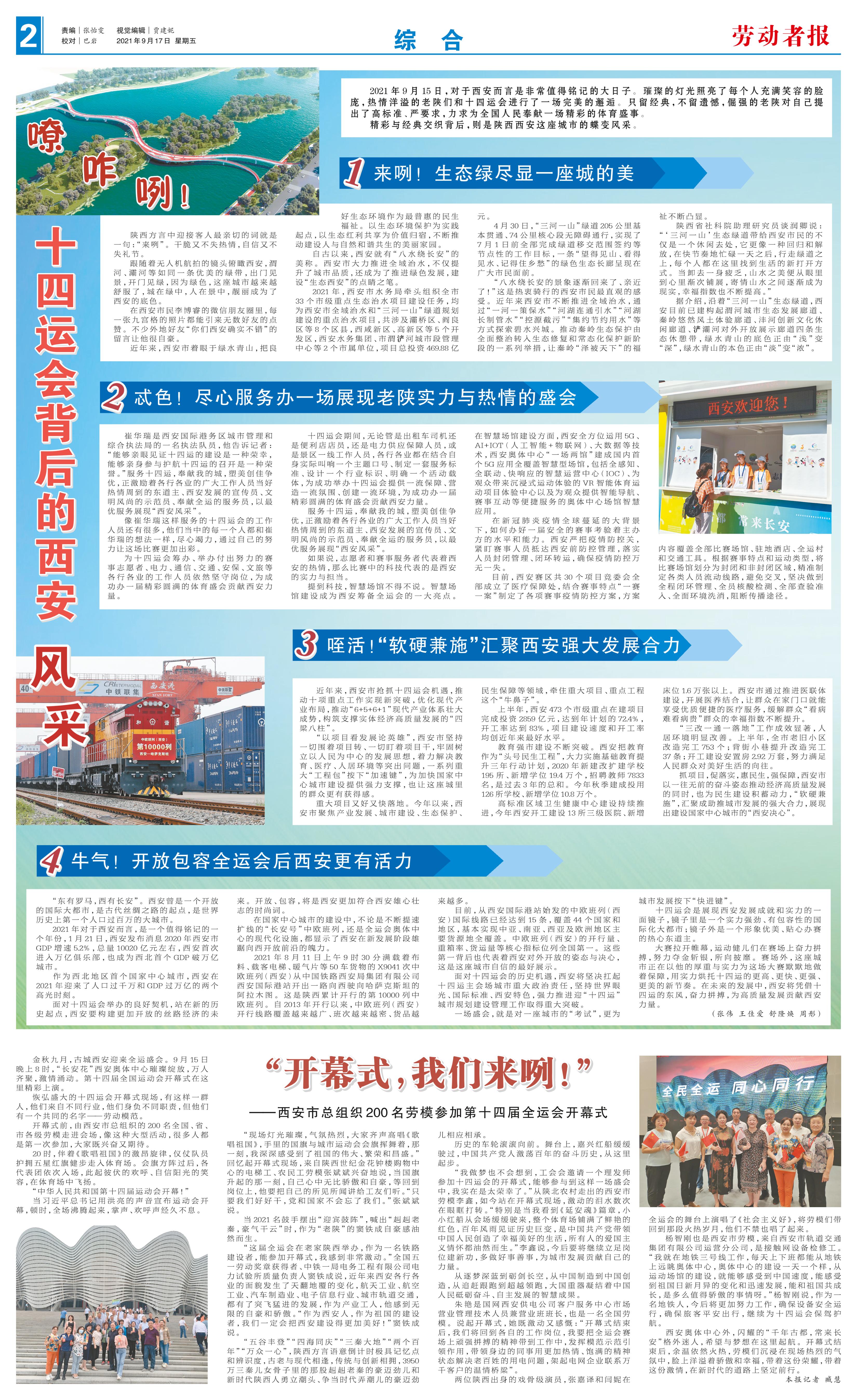2021年9月15日,对于西安而言是非常值得铭记的大日子。璀璨的灯光照亮了每个人充满笑容的脸庞,热情洋溢的老陕们和十四运会进行了一场完美的邂逅。只留经典,不留遗憾,倔强的老陕对自己提出了高标准、严要求,力求为全国人民奉献一场精彩的体育盛事。 精彩与经典交织背后,则是陕西西安这座城市的蝶变风采。 1 来咧!生态绿尽显一座城的美 陕西方言中迎接客人最亲切的词就是一句:“来咧”。干脆又不失热情,自信又不失礼节。 跟随着无人机航拍的镜头俯瞰西安,渭河、灞河等如同一条优美的绿带,出门见景,开门见绿,因为绿色,这座城市越来越舒服了,城在绿中,人在景中,靓丽成为了西安的底色。 在西安市民李博睿的微信朋友圈里,每一张九宫格的照片都能引来无数好友的点赞。不少外地好友“你们西安确实不错”的留言让他很自豪。 近年来,西安市着眼于绿水青山,把良好生态环境作为最普惠的民生 福祉。以生态环境保护为实践起点,以生态红利共享为价值归宿,不断推动建设人与自然和谐共生的美丽家园。 自古以来,西安就有“八水绕长安”的美称。西安市大力推进全域治水,不仅提升了城市品质,还成为了推进绿色发展,建设“生态西安”的点睛之笔。 2021年,西安市水务局牵头组织全市33个市级重点生态治水项目建设任务,均为西安市全域治水和“三河一山”绿道规划建设的重点治水项目,共涉及灞桥区、阎良区等8个区县,西咸新区、高新区等5个开发区,西安水务集团、市渭浐河城市段管理中心等2个市属单位,项目总投资469.88亿元。 4月30日,“三河一山”绿道205公里基本贯通、74公里核心段无障碍通行,实现了7月1日前全部完成绿道移交范围签约等节点性的工作目标,一条“望得见山、看得见水、记得住乡愁”的绿色生态长廊呈现在广大市民面前。 “八水绕长安的景象逐渐回来了、亲近了!”这是热衷骑行的西安市民最直观的感受。近年来西安市不断推进全域治水,通过“一河一策保水”“河湖连通引水”“河湖长制管水”“控源截污”“集约节约用水”等方式探索碧水兴城。推动秦岭生态保护由全面整治转入生态修复和常态化保护新阶段的一系列举措,让秦岭“泽被天下”的福祉不断凸显。 陕西省社科院助理研究员谈润卿说:“‘三河一山’生态绿道带给西安市民的不仅是一个休闲去处,它更像一种回归和解放,在快节奏地忙碌一天之后,行走绿道之上,每个人都在这里找到生活的新打开方式。当卸去一身疲乏,山水之美便从眼里到心里渐次铺展,寄情山水之间逐渐成为现实,幸福指数也不断提高。” 据介绍,沿着“三河一山”生态绿道,西安目前已建构起渭河城市生态发展廊道、秦岭悠然风土体验廊道、沣河创新文化休闲廊道、浐灞河对外开放展示廊道四条生态休憩带,绿水青山的底色正由“浅”变“深”,绿水青山的本色正由“淡”变“浓”。 2 忒色!尽心服务办一场展现老陕实力与热情的盛会 崔华瑞是西安国际港务区城市管理和综合执法局的一名执法队员,他告诉记者:“能够亲眼见证十四运的建设是一种荣幸,能够亲身参与护航十四运的召开是一种荣誉。”服务十四运,奉献我的城,塑美创佳争优,正激励着各行各业的广大工作人员当好热情周到的东道主、西安发展的宣传员、文明风尚的示范员、奉献全运的服务员,以最优服务展现“西安风采”。 像崔华瑞这样服务的十四运会的工作人员还有很多,他们当中的每一个人都和崔华瑞的想法一样,尽心竭力,通过自己的努力让这场比赛更加出彩。 为十四运会筹办、举办付出努力的赛事志愿者、电力、通信、交通、安保、文旅等各行各业的工作人员依然坚守岗位,为成功办一届精彩圆满的体育盛会贡献西安力量。 十四运会期间,无论管是出租车司机还是便利店店员,还是电力供应保障人员,或是景区一线工作人员,各行各业都在结合自身实际叫响一个主题口号、制定一套服务标准、设计一个行业标识、明确一个活动载体,为成功举办十四运会提供一流保障、营造一流氛围、创建一流环境,为成功办一届精彩圆满的体育盛会贡献西安力量。 服务十四运,奉献我的城,塑美创佳争优,正激励着各行各业的广大工作人员当好热情周到的东道主、西安发展的宣传员、文明风尚的示范员、奉献全运的服务员,以最优服务展现“西安风采”。 如果说,志愿者和赛事服务者代表着西安的热情,那么比赛中的科技代表的是西安的实力与担当。 提到科技,智慧场馆不得不说。智慧场馆建设成为西安筹备全运会的一大亮点。在智慧场馆建设方面,西安全方位运用5G、AI+IOT(人工智能+物联网)、大数据等技术,西安奥体中心“一场两馆”建成国内首个5G应用全覆盖智慧型场馆,包括全感知、全联动、快响应的智慧运营中心(IOC)、为观众带来沉浸式运动体验的VR智能体育运动项目体验中心以及为观众提供智能导航、赛事互动等便捷服务的奥体中心场馆智慧应用。 在新冠肺炎疫情全球蔓延的大背景下,如何办好一届安全的赛事考验着主办方的水平和能力。西安严把疫情防控关,紧盯赛事人员抵达西安前防控管理,落实人员封闭管理、闭环转运,确保疫情防控万无一失。 目前,西安赛区共30个项目竞委会全部成立了医疗保障处,结合赛事特点“一赛一案”制定了各项赛事疫情防控方案,方案内容覆盖全部比赛场馆、