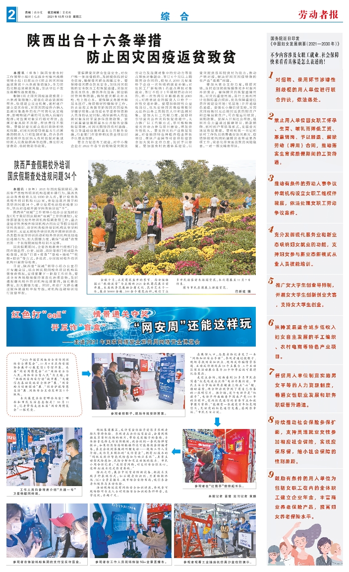 参观者投骰子,现场寻找安防答案。 参观者在“红旗亭”前排起长队。 工作人员向参观者介绍“天通一号”卫星物联网终端。 参观者在体验蚂蚁集团的支付宝反诈盲盒。 参观者在工作人员现场体验5G+全景直播车。 参观者观看工业抽油机仿真沙盘攻防演示。 “2021年国家网络安全宣传周网络安全博览会”,10月8日在西安国际会展中心展览馆1号馆开幕。本届“网安周博览会”以“网络安全为人民,网络安全靠人民”为主题,分“丝路网安西安行动”城市展、“关键信息基础设施安全保护”展、“网安助力创新驱动”展、“网安护航智慧生活”展、网络安全互动发布区5个板块。 本次展览具体有哪些内容?哪些和市民生活息息相关?10月 11日,记者带您走进本届“网安周博览会”一探究竟。 在展馆入口,志愿者给记者发了一本“网络知识安全手册”,参观者通过投骰子、现场寻找网安知识点、现场反诈骗情景答题、互动反诈游戏在18个主展台、6个互动区闯关活动展台集齐20个印章后就可获得纪念奖品。 走进主会场,迎面看到20多名市民在写着“红色电波永流传”电话亭展位前。市民王女士拿起话筒在键盘上轻点“ok”键、摆好姿势,两分钟后就拿到了有自己形象的一张明信片。据介绍,这个电话亭是“红旗亭”,电话亭外面贴着中国共产党100年的历程中,党内红色通信的重要节点和故事图片资料。“能拥有一张建党百年红色明信片,见证党的红色通信发展,感到很幸运。”市民王女士说。 蚂蚁集团展区,反诈盲盒体验亭前很多参观者排队等待体验。参观者点击任选盲盒后,会看到根据真实案例改编的短片,带你走进骗子的套路,当体验者选择支付宝转账时,就会收到一条风险弹窗提示,如果仍然坚持转账操作还可能要做套防骗考卷,甚至会收到客服的叫醒电话……现场工作人员介绍,反诈交互模拟的“反诈盲盒”,拥有AI技术的“蚂蚁反欺诈智能风险感知与响应系统”,具有主动型风险感知、风险分析和交互劝阻的能力。市民小周告诉记者:“我经常网购,对支付安全很关心,这种AI技术还是很重要的。” 除此之外,展会中还有安防新设备、新技术呈现多种表现形式,如云堤身份识别、卫星物联终端、5G+全景直播车、城市综合安防布局,吸引参会者积极参与互动体验。 活动现场还设有网络安全知识讲座,参观者可现场聆听专业人士对网络安全知识的各种科普,边学边玩,乐趣十足。 本报记者 苗莹 实习记者 黄鹏