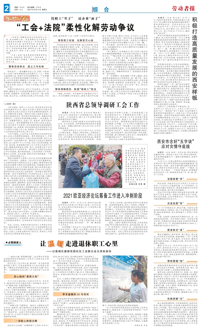 一年时间,调解劳动争议纠纷案件30余起,成功调解10起。这是灞桥区总工会郑长福劳动争议调解工作室成立一年来的成绩。从没有专业人员、没有学科背景、没有办公地点,到如今成为减轻法院行政成本、发挥“娘家人”作用的有效举措,灞桥区总工会一路走来,真抓实干,推动“工会+法院”工作取得新进展。 “工会+法院”就是要柔性化解劳动争议的同时,实现高效‘案结事了’,形成法院、工会齐抓共建的工作格局。”灞桥区总工会相关负责人说。 聚焦劳动争议 建立工作机制 国庆前夕,一场由灞桥区总工会、法院、司法局和人社部门参加的联席会议如期召开,“上一季度完成调解9起,均集中在劳动报酬纠纷。”“在调解过程中,还有需要规范调解行为的地方。”“下一季度,我们还需要在调解技巧方面再下功夫”……参与联席会议的各部门负责人你一言我一语,不说虚话,没有客套,总结上一季度工作经验,安排下一季度工作。 定期召开联席会议,成为工作室成立一年来的惯例,灞桥区总工会高度重视联席会议的召开,总结经验、明确职责、反思问题,大家坐在一起,寻找问题、商议方法,让联席会议真正开出实效,开出成绩,成为推进“工会+法院”工作的有力推手。 聚焦职工权益 化解双方心结 田某因违反公司相关制度,被公司辞退,田某要求公司赔偿相关费用,无果。双方经过一次劳动仲裁后,问题依然没有解决。为了将矛盾化解在诉前,灞桥区人民法院将该案件分流至灞桥区总工会郑长福劳动争议调解工作室调解。自接到该案起,调解员便多次通过电话沟通,了解案情。 9月10月上午,调解员组织双方来到调解室,希望双方能面对面进行沟通,互相谅解。调解室内,田某和公司各执一词,针锋相对,不肯让步。 为了避免矛盾激化,调解员不厌其烦地做双方当事人的思想工作,平息怨气,努力寻求双方利益的平衡点。经过调解员的耐心疏导,双方冰释前嫌,握手言和并签订调解协议,企业一次支付黄某解除劳动关系的经济补偿、双倍工资差额、加班费、2021年5月份工资,共计37000元整,高于劳动仲裁的裁决。 “调解是在平等的前提下进行的,大家坐在一起,有商有量,这样心里才能舒服,没有疙瘩。”灞桥区总工会郑长福劳动争议调解工作室调解员如是说。 聚焦调解前后 彰显“娘家人”担当 “感谢,郑老师!不好意思今天耽误你们吃午饭了,你们的调解工作很到位,确实为我们单位和职工化解了矛盾、解决了纠纷,作为我个人也是受益匪浅,学到了很多。”原告代理人赵某某激动地握着调解员郑长福的手说道。这是发生在灞桥区总工会郑长福劳动争议调解工作室门口的一幕。 郑长福是一位有着20年工会工作经验的老工会人,也是灞桥区总工会郑长福劳动争议调解工作室的核心调解员。 “职工要里子,企业要面子,职工的里子就是合法合理的报酬和尊重,企业的面子就是职工不要起诉企业。”“德法相济123:法析责,德明理。原告三,被告一,二手举,支个梯。”这是郑长福在手机笔记本里记录的工作感悟。长的有几百字,短的几十字。这些长长短短的笔记是郑长福的工作写照也是调解室所有调解员的真实写照。 “在每一次调解结束后,我都会把手机号码留给职工留给企业,希望他们今后遇到问题还能想到我,想到工会。调解虽然结束了,但是服务还要延伸。”郑长福说。 在一次调解中,眼看调解工作陷入僵局,郑长福提出给原被告双方单独谈话、逐一做工作。他分别给双方陈述利害及诉讼可能带来风险,并通过摆事实、讲道理、谈感情等,劝说单位退一退、引导职工让一让;职工和单位,双方本是一条心,相互对立伤双方,握手言和大家好。 “调解工作就是需要足够的耐心,站在对方的角度想一想,为职工争得合法合理的报酬,用诚心给职工以尊重,让得到里子的职工给企业擦亮面子。”郑长福说。 (赵文青)