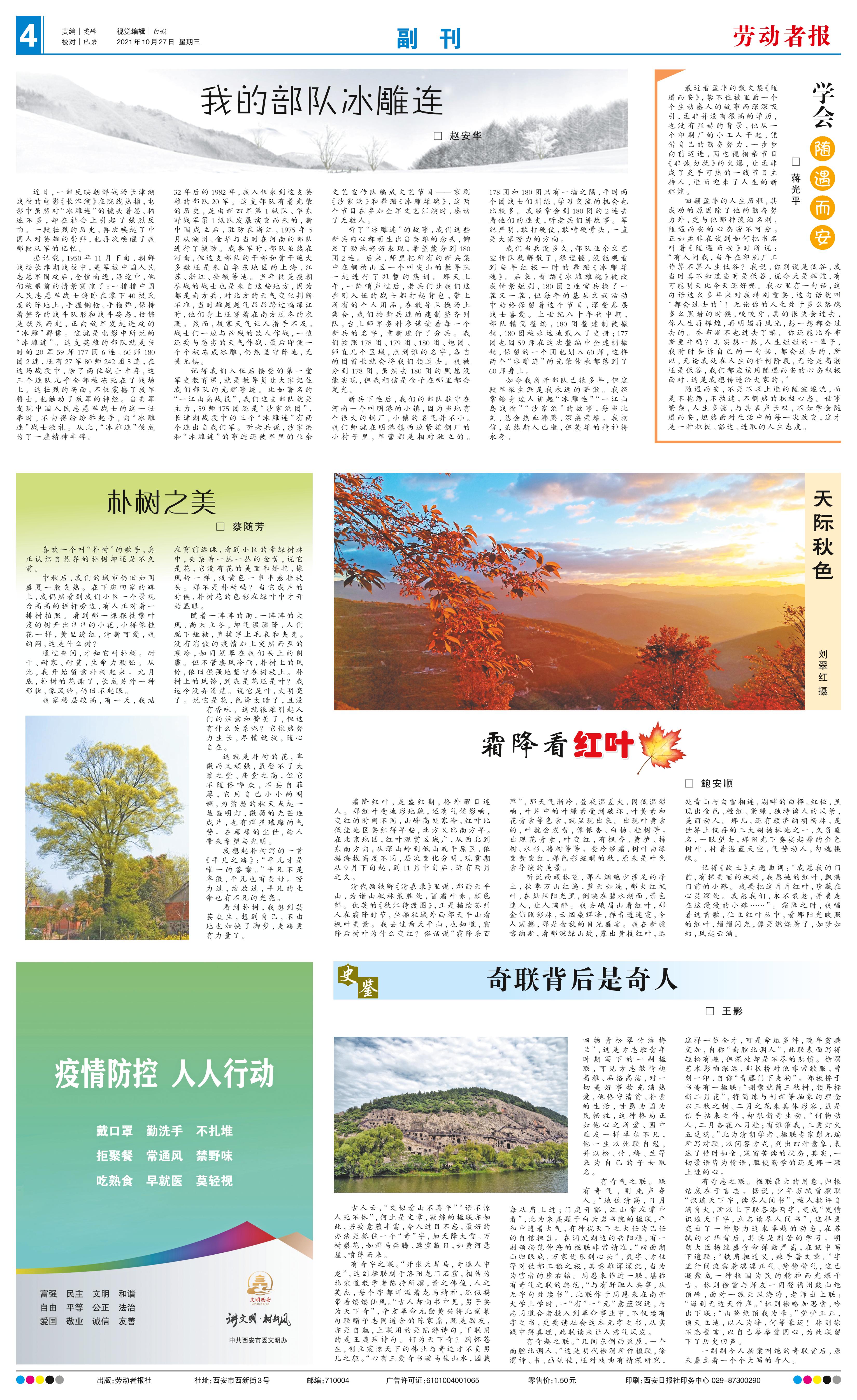 近日,一部反映朝鲜战场长津湖战役的电影《长津湖》在院线热播,电影中虽然对“冰雕连”的镜头着墨、描述不多,却在社会上引起了强烈反响。一段壮烈的历史,再次唤起了中国人对英雄的崇拜,也再次唤醒了我那段从军的记忆。 据记载,1950年11月下旬,朝鲜战场长津湖战役中,美军被中国人民志愿军围攻后,仓惶南逃,沿途中,他们被眼前的情景震惊了:一排排中国人民志愿军战士俯卧在零下40摄氏度的阵地上,手握钢枪、手榴弹,保持着整齐的战斗队形和战斗姿态,仿佛是跃然而起,正向敌军发起进攻的“冰雕”群像。这就是电影中所说的“冰雕连”。这支英雄的部队就是当时的20军 59师177团6连、60师180团2连,还有27军80师242团5连,在这场战役中,除了两位战士幸存,这三个连队几乎全部被冻死在了战场上。这壮烈的场面,不仅震撼了我军将士,也触动了敌军的神经。当美军发现中国人民志愿军战士的这一壮举时,不由得纷纷举起手,向“冰雕连”战士敬礼。从此,“冰雕连”便成为了一座精神丰碑。 32年后的1982年,我入伍来到这支英雄的部队20军。这支部队有着光荣的历史,是由新四军第1纵队、华东野战军第1纵队发展演变而来的,新中国成立后,驻防在浙江,1975年5月从湖州、金华与当时在河南的部队进行了换防。我参军时,部队虽然在河南,但这支部队的干部和骨干绝大多数还是来自华东地区的上海、江苏、浙江、安徽等地。当年抗美援朝参战的战士也是来自这些地方,因为都是南方兵,对北方的天气变化判断不准,当时雄赳赳气昂昂跨过鸭绿江时,他们身上还穿着在南方过冬的衣服。然而,极寒天气让人措手不及。战士们一边与凶残的敌人作战,一边还要与恶劣的天气作战,最后即便一个个被冻成冰雕,仍然坚守阵地,无畏无惧。 记得我们入伍后接受的第一堂军史教育课,就是教导员让大家记住我们部队的光辉事迹。比如著名的“一江山岛战役”,我们这支部队就是主力,59师175团还是“沙家浜团”,长津湖战役中的三个“冰雕连”有两个连出自我们军。听老兵说,沙家浜和“冰雕连”的事迹还被军里的业余文艺宣传队编成文艺节目——京剧《沙家浜》和舞蹈《冰雕雄魂》,这两个节目在参加全军文艺汇演时,感动了无数人。 听了“冰雕连”的故事,我们这些新兵内心都萌生出当英雄的念头,铆足了劲地好好表现,希望能分到180团2连。后来,师里把所有的新兵集中在桐柏山区一个叫尖山的教导队一起进行了短暂的集训。那天上午,一阵哨声过后,老兵们让我们这些刚入伍的战士都打起背包,带上所有的个人用品,在教导队操场上集合,我们按新兵连的建制整齐列队,台上师军务科参谋读着每一个新兵的名字,重新进行了分兵。我们按照178团、179 团、180团、炮团、师直几个区域,点到谁的名字,各自的团首长就会将我们领过去。我被分到 178团,虽然去180团的夙愿没能实现,但我相信是金子在哪里都会发光。 新兵下连后,我们的部队驻守在河南一个叫明港的小镇,因为当地有个很大的钢厂,小镇的名气并不小。我们师就在明港镇西边紧挨钢厂的小村子里,军营都是相对独立的。178团和180团只有一墙之隔,平时两个团战士们训练、学习交流的机会也比较多。我经常会到180团的2连去看他们的连史,听老兵们讲故事。军纪严明,敢打硬仗,敢啃硬骨头,一直是大家努力的方向。 我们当兵没多久,部队业余文艺宣传队就解散了,很遗憾,没能观看到当年红极一时的舞 蹈《冰雕雄魂》。后来,舞蹈《冰雕雄魂》被改成情景短剧,180团2连官兵换了一茬又一茬,但每年的基层文娱活动中始终保留着这个节目,深受基层战士喜爱。上世纪八十年代中期,部队精简整编,180 团整建制被撤销,180团被永远地载入了史册;177团也因59师在这次整编中全建制撤销,保留的一个团也划入60师,这样两个“冰雕连”的光荣传承都落到了60师身上。 如今我离开部队已很多年,但这段军旅生涯是我永远的骄傲。我经常给身边人讲起“冰雕连”“一江山岛战役”“沙家浜”的故事,每当此刻,总会热血沸腾,深感荣耀。我相信,虽然斯人已逝,但英雄的精神将永存。