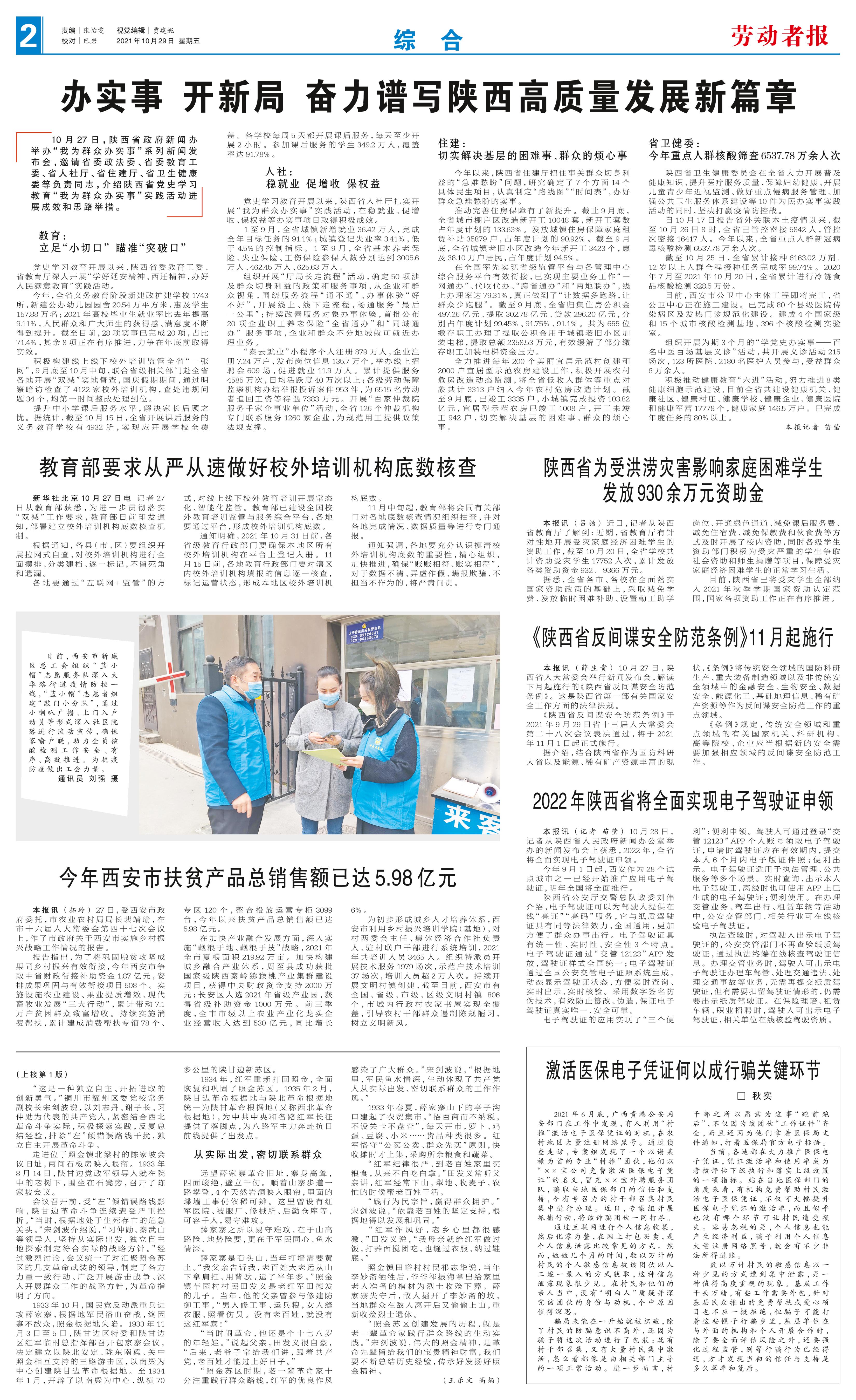 10月27日,陕西省政府新闻办举办“我为群众办实事”系列新闻发布会,邀请省委政法委、省委教育工委、省人社厅、省住建厅、省卫生健康委等负责同志,介绍陕西省党史学习教育“我为群众办实事”实践活动进展成效和思路举措。 教育:立足“小切口”瞄准“突破口” 党史学习教育开展以来,陕西省委教育工委、省教育厅深入开展“学好延安精神、西迁精神,办好人民满意教育”实践活动。 今年,全省义务教育阶段新建改扩建学校1743所,新建公办幼儿园园舍20.54万平方米,惠及学生157.88万名;2021年高校毕业生就业率比去年提高9.11%,人民群众和广大师生的获得感、满意度不断得到提升。截至目前,28项实事已完成20项,占比71.4%,其余8项正在有序推进,力争在年底前取得实效。 积极构建线上线下校外培训监管全省“一张网”,9月底至10月中旬,联合省级相关部门赴全省各地开展“双减”实地督查,国庆假期期间,通过明察暗访检查了4122家校外培训机构,查处违规问题34个,均第一时间整改处理到位。 提升中小学课后服务水平,解决家长后顾之忧。据统计,截至10月15日,全省开展课后服务的义务教育学校有4932所,实现应开展学校全覆盖。各学校每周5天都开展课后服务,每天至少开展2小时。参加课后服务的学生349.2万人,覆盖率达91.78%。 人社:稳就业促增收 保权益 党史学习教育开展以来,陕西省人社厅扎实开展“我为群众办实事”实践活动,在稳就业、促增收、保权益等办实事项目取得积极成效。 1至9月,全省城镇新增就业36.42万人,完成全年目标任务的91.1%;城镇登记失业率3.41%,低于4.5%的控制指标。1至9月,全省基本养老保险、失业保险、工伤保险参保人数分别达到3005.6万人、462.45万人、625.63万人。 组织开展“厅局长走流程”活动,确定50项涉及群众切身利益的政策和服务事项,从企业和群众视角,围绕服务流程“通不通”、办事体验“好不好”,开展线上、线下走流程,畅通服务“最后一公里”;持续改善服务对象办事体验,首批公布20项企业职工养老保险“全省通办”和“同城通办”服务事项,企业和群众不分地域就可就近办理业务。 “秦云就业”小程序个人注册879万人,企业注册7.24万户,发布岗位信息135.7万个,举办线上招聘会609 场,促进就业11.9万人。累计提供服务4585万次,日均活跃度40万次以上;各级劳动保障监察机构办结举报投诉案件953件,为6515名劳动者追回工资等待遇7383万元。开展“百家仲裁院服务千家企事业单位”活动,全省126个仲裁机构专门联系服务1260家企业,为规范用工提供政策法规支撑。 住建:切实解决基层的困难事、群众的烦心事 今年以来,陕西省住建厅扭住事关群众切身利益的“急难愁盼”问题,研究确定了7个方面14个具体民生项目,认真制定“路线图”“时间表”,办好群众急难愁盼的实事。 推动完善住房保障有了新提升。截止9月底,全省城市棚户区改造新开工10048套,新开工套数占年度计划的133.63%。发放城镇住房保障家庭租赁补贴35879户,占年度计划的90.92%。截至9月底,全省城镇老旧小区改造今年新开工3423个,惠及36.10万户居民,占年度计划94.5%。 在全国率先实现省级监管平台与各管理中心综合服务平台有效衔接,已实现主要业务工作“一网通办”、代收代办、“跨省通办”和“两地联办”,线上办理率达79.31%,真正做到了“让数据多跑路,让群众少跑腿”。截至9月底,全省归集住房公积金497.26亿元、提取302.78亿元、贷款296.20亿元,分别占年度计划99.45%、91.75%、91.1%。共为655位缴存职工办理了提取公积金用于城镇老旧小区加装电梯,提取总额2358.53万元,有效缓解了部分缴存职工加装电梯资金压力。 全力推进每年200个美丽宜居示范村创建和2000户宜居型示范农房建设工作,积极开展农村危房改造动态监测,将全省低收入群体等重点对象共计3313户纳入今年农村危房改造计划。截至9月底,已竣工3335户,小城镇完成投资103.82亿元,宜居型示范农房已竣工1008户,开工未竣工942户,切实解决基层的困难事、群众的烦心事。 省卫健委:今年重点人群核酸筛查6537.78万余人次 陕西省卫生健康委员会在全省大力开展普及健康知识、提升医疗服务质量、保障妇幼健康、开展儿童青少年近视监测、做好重点慢病服务管理、加强公共卫生服务体系建设等10件为民办实事实践活动的同时,坚决打赢疫情防控战。 自10月17日报告省外关联本土疫情以来,截至10月26日8时,全省已管控密接5842人,管控次密接16417人。今年以来,全省重点人群新冠病毒核酸检测6537.78万余人次。 截至10月25日,全省累计接种6163.02万剂,12岁以上人群全程接种任务完成率99.74%。2020年7月至2021年10月20日,全省累计进行冷链食品核酸检测328.5万份。 目前,西安市公卫中心主体工程即将完工,省公卫中心正在施工建设。已完成80个县级医院传染病区及发热门诊规范化建设。建成4个国家级和15个城市核酸检测基地、396个核酸检测实验室。 组织开展为期3个月的“学党史办实事——百名中医百场基层义诊”活动,共开展义诊活动215场次,123所医院、2180名医护人员参与,受益群众6万余人。 积极推动健康教育“六进”活动,努力推进8类健康细胞示范建设,目前全省共建设健康机关、健康社区、健康村庄、健康学校、健康企业、健康医院和健康军营17778个,健康家庭146.5万户。已完成年度任务的80%以上。 本报记者 苗莹