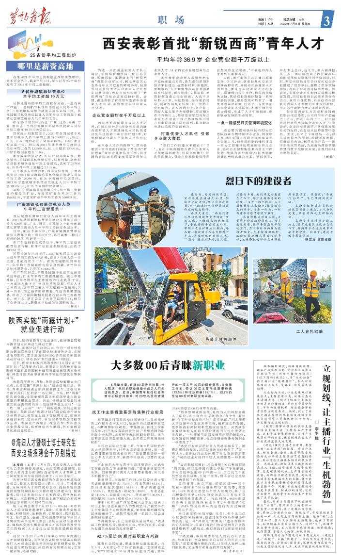 6月毕业季,首批00后告别校园,步入职场。他们的职业选择也成为人们关注的焦点。近日,中国青年报社社会调查中心联合问卷网,对2072名受访者进行的一项关于00后的调查显示,在选择工作时,受访00后主要考虑薪资待遇(73.5%)和行业前景(61.1%)。92.7%的受访00后对新职业有兴趣。 找工作主要看重薪资待遇和行业前景 李荛娟是河南某高校应届毕业生,目前找到的工作和专业不太对口,她表示自己愿意积累经验,不断调整职业规划。李荛娟说,在找工作的过程中,自己比较看重成长空间,“希望选择的职业跟专业相符,或者契合未来的职业规划。现在没有那么迫切想要赚大钱,也希望工作氛围是轻松的”。 本科应届毕业生梁一萌,今年9月即将到西北大学读研究生,对于未来的职业选择,梁一萌比较看重薪资和成长空间。“我更愿意选择一份压力不太大的工作,薪资不用很高,但要有成长空间”。 河北师范大学大四学生寇津昊表示,在选择工作时首先会考虑薪酬问题,“要能够满足正常生活。但薪酬高代表对人才的要求也高,所以会不断提升自己”。 数据显示,在选择工作时,00后受访者主要考虑的是薪资待遇(73.5%)、行业前景(61.1%)。然后是有发展空间(58.8%)、符合兴趣爱好(53.9%)。其他还有:稳定性(48.8%)、专业匹配度(41.9%)、自由度(36.7%)、所在城市(36.5%)、团队氛围(33.8%)和有双休(33.5%)等。 柳羽(化名)是广西某高校大三学生,她表示对于工作,会更看重个人的发展空间,“我觉得在工作中体现个人价值很重要,如果能和兴趣结合起来就更好了。虽然可能很难一步到位,但会逐渐向目标靠近”。 李荛娟表示,自己很愿意从基层做起。“做基层工作要能吃苦,但成长更快,学到的更多,会成为促进未来发展的无形财富”。 92.7%受访00后对新职业有兴趣 随着社会的发展,职业选择也越来越多。今年6月,人社部公布了18项新职业。本次调查显示,92.7%的受访00 后对新职业有兴趣,其中37.4%的受访00后非常有兴趣。 “很多新职业的出现,是因为人们将爱好融入了职业,这也符合00后的特点,有个性、敢创新,在工作中提高自己的生活幸福感。”河北师范大学应届毕业生雷天倚觉得,随着社会的发展,更多的就业岗位和机会也应运而生。灵活就业在鼓励年轻人创造自我价值的同时也在推动社会发展,“一些伴随互联网发展而出现的新职业,也许随着时间的推移,也会慢慢变得像传统职业一样常见了”。 “感觉近些年灵活就业人员越来越多了。随着新媒体的发展,灵活就业的岗位也多了。”梁一萌认为,新职业的出现体现了社会发展的新需求,“灵活就业对我们年轻人来说也是一种新机遇”。 “最近刷短视频时,总会看到‘00后整顿职场’的话题,但我觉得没有这么夸张。”李荛娟说,作为首批毕业的00后中的一员,自己找工作时虽然会看重双休、五险一金等,但不会过度挑剔工作内容和工作氛围。 反向背调、准点下班、拒绝团建……对于现在一些所谓“00后整顿职场”的现象,调查中,48.2%的受访者觉得年轻人有魄力,做了自己想做的事情,47.7%的受访者坦言有些不良职场规则是该改改了。与此同时,46.0%的受访者表示应该理性表达诉求,不要变成“杠精”,29.4%的受访者认为这些行为太过偏激了,弊大于利。 来自浙江的90后宁晓(化名),有个比自己小10岁的00后妹妹,她感觉现在00后在职场中的表现,是一种“冲劲儿”的体现,“也许当初90后初入职场时,前辈们看我们也会觉得有许多跟职场格格不入的特点,但现在我们也在适应职场环境”。 宁晓觉得,职场需要年轻人的活力和创造力,与此同时,学会倾听来自年轻人的声音也很重要,“需要采用合理的方式,让年轻人发挥出他们的优势,实现青年和社会的共同发展”。 据《青年时讯》