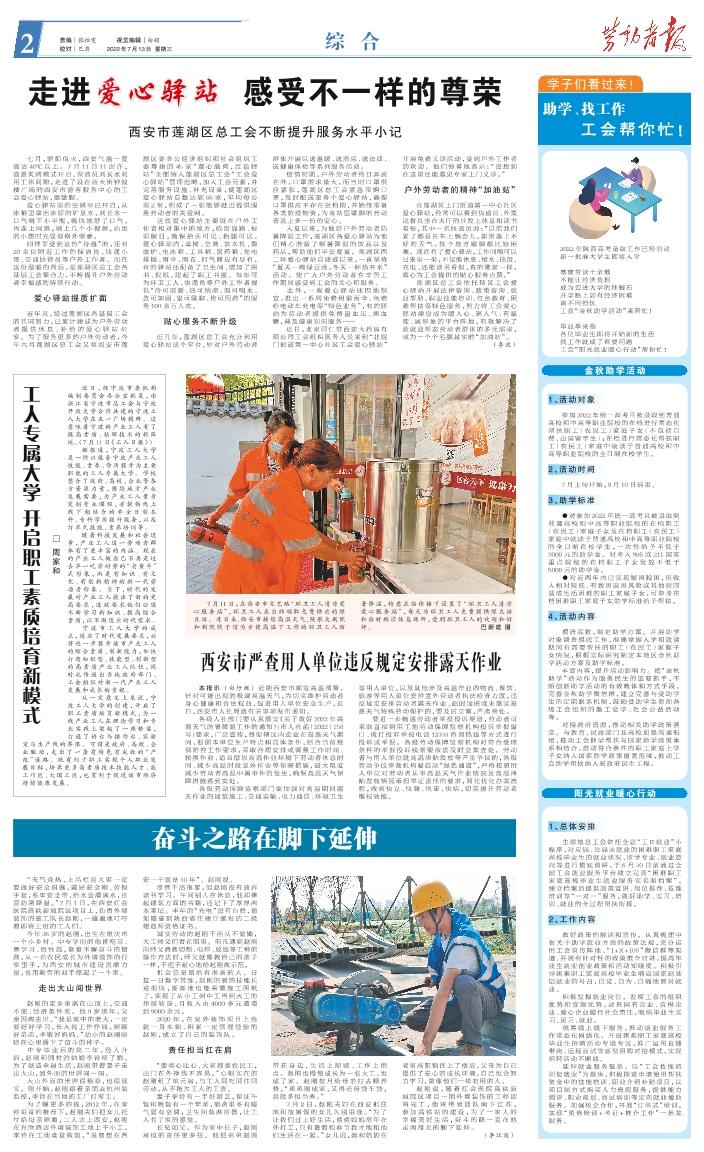 七月,骄阳似火,西安气温一度高达40℃以上。7月11日11时许,高温炙烤模式开启,保洁员刘长水利用工休间隙,走进了设在西大街钟鼓楼广场的西安市游客服务中心的工会爱心驿站,歇歇脚。 爱心驿站里的空调早已开启,从冰箱里拿出冰好的矿泉水,刘长水一口气喝下小半瓶,畅快地舒了口气。再连上网络,刷上几个小视频,站里的小憩时光显得格外惬意。 同样享受到这份“待遇”的,还有20余位附近工作的保洁员、快递小哥、交通协管员等户外工作者。而在这份温暖的背后,是莲湖区总工会各基层工会聚合力,不断提升户外劳动者幸福感的持续行动。 爱心驿站提质扩面 近年来,经过莲湖区各基层工会的共同努力,已累计建成为户外劳动者提供休息、补给的爱心驿站 41家。为了服务更多的户外劳动者,今年六月莲湖区总工会又将西安市莲湖区委非公经济组织和社会组织工委筹建的45家“莲心港湾,红色驿站”全部纳入莲湖区总工会“工会爱心驿站”管理范畴,加入工会元素,并完善服务设施、补充设备,使莲湖区爱心驿站总数达到86家,平均每公里2家,织成了一张能够就近提供服务劳动者的关爱网。 这些爱心驿站主要设在户外工作者相对集中的地方,临街靠路、标识醒目,确保抬头可见、抬腿可达。爱心驿站内,桌椅、空调、饮水机、微波炉、电冰箱、工具箱、医药箱、充电排插、雨伞、雨衣、打气筒应有尽有,有的驿站还配备了卫生间、增加了图书、报纸,建起了职工书屋。每年可为环卫工人、快递员等户外工作者提供“冷可取暖、热可纳凉、渴可喝水、急可如厕、累可歇脚、伤可用药”的服务100余万人次。 贴心服务不断升级 近几年,莲湖区总工会充分利用爱心驿站这个平台,针对户外劳动者群体开展以送温暖、送清凉、送法律、送健康体检等系列服务活动。 疫情初期,户外劳动者终日奔波在外,口罩需求量大,而当时口罩供应紧张,莲湖区总工会紧急采购口罩,及时配送至各个爱心驿站,确保口罩供应不存在空档期,并始终常备各类防疫物资,为来站里歇脚的劳动者送上多一份的安心。 入夏以来,为做好户外劳动者防暑降温工作,莲湖区各爱心驿站为他们精心准备了解暑降温的饮品以及药品,帮助他们平安度夏。莲湖区西二环爱心驿站自建成以来,一直坚持“夏天一碗绿豆汤,冬天一杯热开水”活动。使广大户外劳动者在辛苦工作期间感受到工会的关心和服务。 此外,一些爱心驿站还因地制宜,推出一系列免费租借雨伞、免费给电动车充电等“特色业务”,有的驿站为劳动者提供免费量血压、测血糖,普及健康知识服务…… 近日,北京同仁堂西安大药房有限公司工会组织医务人员来到“北院门街道第一中心社区工会爱心驿站”开展免费义诊活动,受到户外工作者的欢迎。他们惊喜地表示:“没想到在这里还能遇见专家上门义诊。” 户外劳动者的精神“加油站” 在莲湖区土门街道第一中心社区爱心驿站,经常可以看到快递员、外卖送餐员坐在大厅的沙发上休息和读书看报,其中一名快递员说:“以前我们累了都是在车上躺会儿,如果遇上不好的天气,找个地方歇脚都比较困难。现在有了爱心驿站,工作间隙可以过来坐一坐,不仅能休息、接水、热饭、充电、还能读书看报,真的像家一样,真心为工会提供的贴心服务点赞。” 莲湖区总工会依托辖区工会爱心驿站开展法律咨询、政策咨询、就业帮助、职业技能培训、红色教育、困难帮扶等特色服务,努力将工会爱心驿站建设成为暖人心、聚人气、有温度、展形象的平台阵地,有效解决了新就业形态劳动者群体的多元需求,成为一个个名副其实的“加油站”。 (李波)