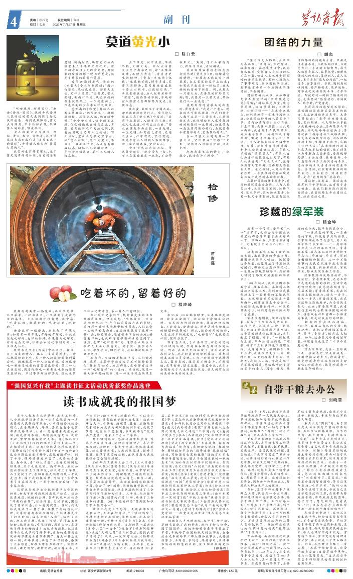 每个人都有自己的梦想,我也不例外。从小我就梦想着有朝一日自己能成为一名光荣的人民解放军战士,心中便暗暗地鼓着劲儿,点着煤油灯、蜡烛,甚至打着手电筒都在发奋读书,打内心想着将来要报效祖国,得先学好本领。那时候没有电话、没有电视,常常陪伴我的便是书。像《鸡毛信》《小兵张嘎》《闪闪的红星》等许多小人书,我都看过多遍。还有《钢铁是怎样炼成的》《雷锋日记》《可爱的中国》《十万个为什么》这些书籍让我爱不释手,感觉有滋有味!到了中学,课外读物更丰富了,我开始看杂志、看小说、看“四大名著”,总感觉时间过得很快,日子也很充实。高中毕业,我就如愿以偿地穿上了绿军装,后来考上了军校,入了党提了干,在祖国航天测控领域一干就是22年,圆了我的报国梦,唱响了“生命里有了当兵的历史,一辈子都不会后悔!”的青春之歌。 记得我军校毕业分配到黄洋山营区的时候,初来乍到对新环境感觉不适应。该山远离城区,蜿蜒的山路,靠部队班车连接着“外面的世界”,信息闭塞,生活不便,团站处于留守状态,让人感到寂寞。当时,战友给我送来了一摞子书,分散了我的烦乱心理,没事时看看书就当解闷,开始读书是为了打发时间,后来逐渐“入戏”,钻进了书林,却不能自拔,养成了习惯,觉得山上还挺好,绿荫连绵,空气清新,周边安静,真是读书修身的好地方!回过头来想想,也正是黄洋山让我多读了许多书,重要的是让我爱读书的习惯更加根深蒂固了,看见书籍总爱翻一翻,经年累月,丰富了知识储备,夯实了业务根基,助推工作能力的提升。实践告诉我:读史明智,读哲明理;读百科全书,长千方百计;读书无穷,迷津自明。可以毫不夸张地说:读书让我梦圆职业生涯!让我一路由文书、司务长、助理员、股长、后勤处副处长顺利地成长为司训基地副队长,成就了梦想,先后18次受嘉奖,多次被评为“优秀共产党员”,并荣立了个人三等功。 转业回到地方,悉心研读市场营销、房地产开发类书籍,延伸自身的营产、房产管理经验,应聘到一家大型企业,积极出谋划策,制定营销方案,拓展网络渠道,提升了效益,赢得了集团的信赖,在试用期未满就被任命为企划部经理。 2009年我又投身工会工作,《工人日报》《陕西工人报》《劳动者报》《陕西工运》等读物便成了我的至爱,每日必看,从中学到了不少的工作方法。阅读练就了娴熟的业务技能,帮助我快捷地进入角色,独当一面,逐步成为业务骨干。业余我翻阅电脑操作书籍,学会了PPT制作、图册编辑等技巧,延续自身的企划经验,轻车熟路地创建了工会的系列宣传册和幻灯片。几年来,先后编印宣传册38期、制作幻灯片31部,助推了工会业务的开展。2011年还被评为“莲湖区知识型职工优秀个人”。 读书让我爱上了写作。无论在部队还是在地方,无论在何岗位,“干啥吆喝啥”,坚持业务研究和创新,笔耕不辍,也品尝了收获的甘甜,曾被全军《司务长》杂志、《劳动者报》聘任为通讯员。当我的第一篇通讯《秦岭山区“一头牛”》被全军《营房问题研究》杂志“文明之花”栏目刊登后,别提我有多高兴了!从此,一发不可收拾,《科研试验后勤》《司务长》等业务刊物便与我结缘,一方方“豆腐块”不断呈现。多年来,先后在军地刊物发表业务论文、通讯稿件200余篇,其中论文《刷106涂料常见的问题及对策》等 5篇在部队后勤管理研究成果评审中获奖;参加部队机关公文写作大赛荣获二等奖;散文《我的母亲》荣获“首届真情人生全国纪实散文征文评选”三等奖;论文《看病方便多了》参加《西安晚报》“30年回首话健康”征文荣获二等奖;散文《爱逛西大街的理由》荣获《西安晚报》“上海城杯·我和西大街征文”优秀奖;参加西安晚报、楹联协会、商场联合举办的“消费迎新 春联送福”活动,写给国美电器的楹联“海纳百川家电群雄争霸送冬去,壁立千仞国美独树一帜迎春来”从3600件应征作品中脱颖而出,荣获优胜奖;论文《坚持“八到位”认真做好街道工会工作》荣获市总工会组织员征文大赛一等奖;稿件《恋家》荣获《劳动者报》“党徽激励我”征文大赛三等奖;论文《“四化”创新促规范“四措”并举保安全》荣获市总工运理论研究成果评选二等奖;论文《持之以恒开展集体协商 推动职工企业和谐双赢》获市总工会优秀调研成果三等奖;《读书积累是一笔财富》获“中铁工会杯”陕西省职工读书征文大赛优秀奖;《工会经历我将永远铭记》获莲湖区总工会“我与工会的故事”征文一等奖;《誓词千钧伴我行》获“重温入党誓词——给党说句心里话”陕西省总工会征文二等奖…… 回顾自己半生的历程,成于书、功于读,是读书成就了我的梦想,践行了初心使命,圆了报国梦。我把美好的青春年华留在了军营,奉献给了祖国的航天测控事业,把余热余光奉献给职工群众暨公益事业,我将继续努力,活到老、学到老,终身学习,让读书不断刷新聪慧的头脑,使夕阳的余晖更灿烂。 (孙养利)