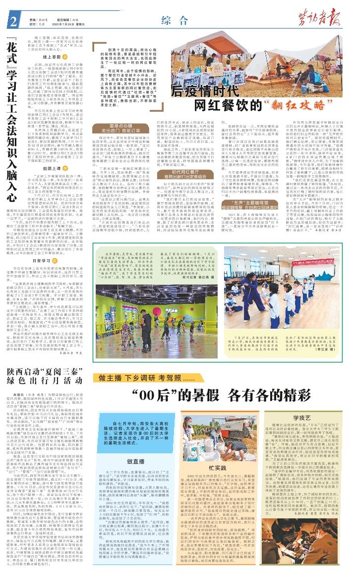 自七月中旬,西安各大高校陆续放假,大学生进入了暑期生活。记者发现许多00后的大学生选择走入社会,开启了不一样的暑期生活模式。 做直播 大三学生肖航,放暑假后,就开启了“主播生活”。“我学的专业是表演,玩抖音的初衷就是传播快乐,学习更多知识,带来不同的体验和感悟。”肖航说。 肖航拍的短视频有创意,点赞人数也高。凭借着短视频积攒的粉丝基础和独特的搞笑风格,他的直播间总是很“火爆”,粉丝蹭蹭地往上涨。 2002年出生的星河,今年读大一。“我想站在舞台上,站在灯光下。”星河说,暑期他想历练一下自己,顺便赚点零花钱。每天从早上9时直播到下午6时,他除了“打PK”、和粉丝聊天,还添加了才艺说唱。 “直播没有想象得那么简单。”星河说,刚开始直播比较难,赚的钱比较少,直播9个小时,有时收入十几元,有时几十元。让他最为难受的是,有时不知道哪里没说好,还会被骂。 和星河风格截然不同的准大学生璟连,她的直播风格就特别温柔。“我今年考上了中国传媒大学,就是想利用暑期在抖音直播赚点钱用做上学的学费。”璟连平时喜欢追星,“我想通过不断的努力向偶像靠近。” 忙实践 2002年出生的侯思玉,今年读大二,暑假期间,她来到陕西广播电视台进行认知实习,希望通过实践提升自己的能力。“在学校,虽然理论学习不少,但没有机会去实践,这次实践,我要把在课堂上学到的理论知识,运用到实际工作中,找差距、补短板。”侯思玉说。 第一次跟老师出去采访,侯思玉看到老师询问采访对象问题时,她赶紧拿出笔和本子进行详细的记录。在老师的指导下,她完成了第一篇消息的采写。“我最期待的就是通过实践,提高自己的文字表达能力”。侯思玉说。 一直在西安生活的大学生王雄飞,暑期跟随实践调研团的成员前往长安区四皓村,进行大学生下乡社会实践活动。 “初次来到四皓村的时候,我很震惊。”秀丽的风景、干净整洁的街道和多种产业的融合发展,俨然与他印象中的乡村风貌截然不同,村民们的淳朴与热情更让他印象深刻。调研之余,他还帮着村民干农活,“那是我第一次在田地里劳动,很新奇,但也很累,很充实。” 六点起床、阳光暴晒、日行两万步已经成了他的常态,但淳朴的乡村与发展的奥秘都深深地吸引着他,再苦再累也是快乐的。 学技艺 随着社会经济的发展,“开车”已经成为了现代社会的必备技能。鲁东大学大三学生王振淇暑期回到西安后,第一时间就报考了驾校。 “暑期时间比较长,考驾照刚合适。”王振淇说,每天在训练场又热又晒,感觉自己现在黑得像“炭”。开始,她还对开车有点恐惧,迟迟不敢上手,但当真正通过自己的控制让车开动,甚至完成各种规定动作时,她还是觉得很有成就感。“我很认真地学,肯定在开学前能拿到驾照。”王振淇笑着说。 为了让自己的生活更加丰富充实,杨蒲每个假期都会选择进一步提升自己的摄影技术。 “我学的是编导专业,同喜欢摄影的朋友一起组织了摄影社团,找各种地方拍照,相互交流经验。”杨蒲说,他们还请了专业的老师来指导。虽然夏天背着相机和支架又热又累,但因为热爱,她愿意去追逐,这也让她在专业技能上得到了更快的提升。 杨语萱在上海上学,为了减轻家里的负担,放假回到西安就选择了在附近的奶茶店打工。杨语萱每天从上午10时,一直干到晚上11时,连吃饭都得和同事换着吃。她坦言,假期的收入打算当做下学期的学费,帮父母分担一些压力。 本报记者 苗莹 实习生 刘杰