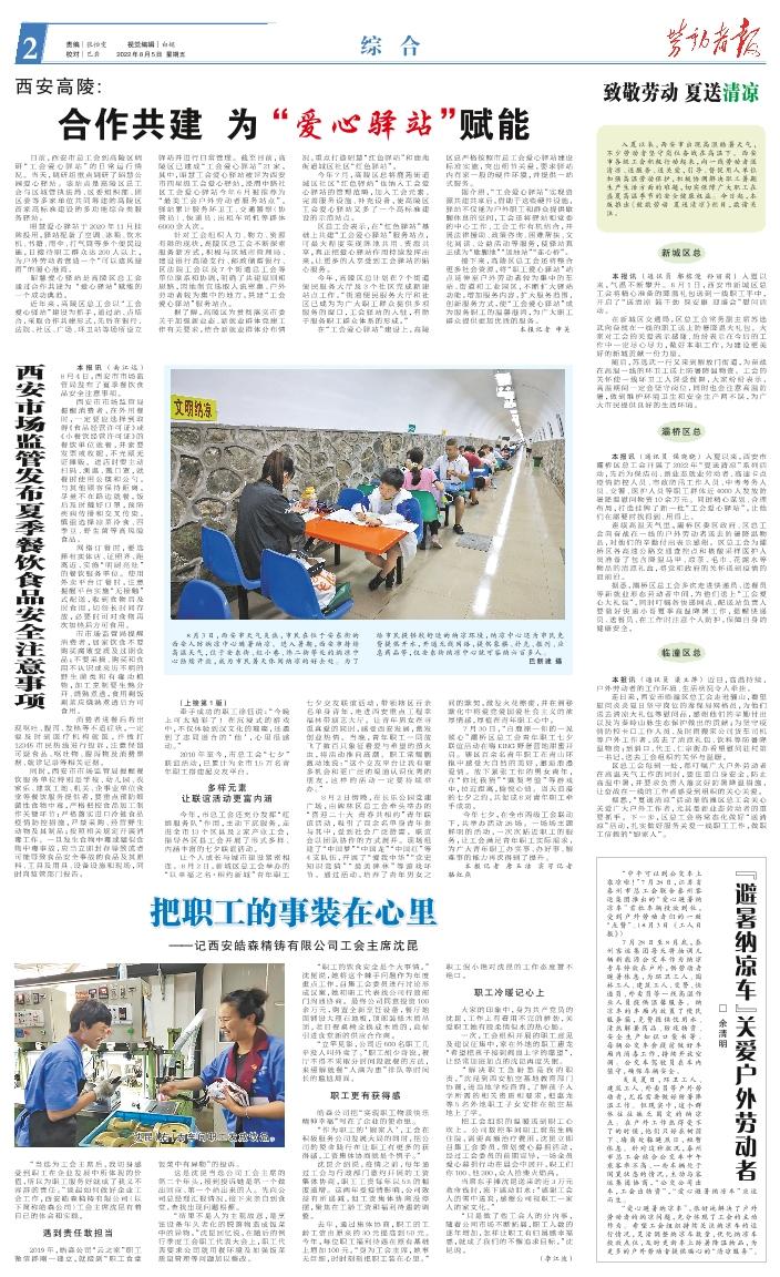 入夏以来,西安市出现高温酷暑天气,不少劳动者坚守岗位奋战在高温下。西安市各级工会积极行动起来,向一线劳动者送清凉、送服务、送关爱,引导、督促用人单位加强高温劳动保护,积极协调解决职工暑期生产生活方面的难题,切实保障广大职工在盛夏高温季节的安全健康权益。今日起,本版推出《致敬劳动 夏送清凉》栏目,敬请关注。 新城区总 本报讯 (通讯员 鄢榕漫 孙丽莉)入夏以来,气温不断攀升。8月1日,西安市新城区总工会将精心准备的降温礼包送到一线职工手中,开启了“送清凉 鼓干劲 保安康 迎盛会”慰问活动。 在新城区交通局,区总工会常务副主席苏选武向奋战在一线的职工送上防暑降温大礼包。大家对工会的关爱表示感谢,纷纷表示在今后的工作中一定尽心尽力,做好本职工作,为建设更美好的新城贡献一份力量。 随后,苏选武一行又来到解放门街道,为奋战在高温一线的环卫工送上防暑降温物资。工会的关怀使一线环卫工人深受鼓舞,大家纷纷表示,高温期间一定会坚守岗位,同时也会注意高温防暑,做到维护环境卫生和安全生产两不误,为广大市民提供良好的生活环境。 灞桥区总 本报讯(通讯员 侯晓晓)入夏以来,西安市灞桥区总工会开展了2022年“夏送清凉”系列活动,先后为保洁员、新业态就业劳动者、高速卡点疫情防控人员、市政防汛工作人员、中考考务人员、交警、医护人员等职工群体近4000人发放防暑降温慰问物资10余万元。同时精心谋划、合理布局,打造挂牌了新一批“工会爱心驿站”,让他们在需要时找得到、用得上。 连续高温天气里,灞桥区委区政府、区总工会向奋战在一线的户外劳动者送去防暑降温物品,对他们的辛勤付出表示感谢。区总工会为灞桥区各高速公路交通查控点和核酸采样医护人员准备了包含降温马甲、凉茶、毛巾、花露水等物品的清凉礼盒,将党和政府的关怀送到疫情的最前沿。 据悉,灞桥区总工会多次走进快递员、送餐员等新就业形态劳动者中间,为他们送上“工会爱心大礼包”,同时叮嘱各快递网点、配送站负责人要做好快递小哥夏季高温降暑工作,提醒快递员、送餐员、在工作时注意个人防护,保障自身的健康安全。 临潼区总 本报讯(通讯员 梁立萍)近日,高温持续,户外劳动者的工作环境、生活状况令人牵挂。 连日来,西安市临潼区总工会走进骊山,看望慰问炎炎夏日坚守岗位的秦保局网格员,为他们送去清凉大礼包等慰问品,感谢他们的辛勤付出以及为秦岭山脉生态保护做出的贡献;为坚守疫情防控卡口工作人员、及时雨搬家公司货车司机等户外工作者,送去了清凉礼包、饮料等防暑降温物资;到斜口、代王、仁宗街办看望慰问驻村第一书记,送去工会组织的关怀与温暖。 区总工会每到一处,都叮嘱广大户外劳动者在高温天气工作的同时,要注重自身安全,防止高温中暑,并要求负责人落实好防暑降温措施,让奋战在一线的工作者感受到组织的关心关爱。 据悉,“夏送清凉”活动是临潼区总工会关心关爱广大户外工作者,尤其是新业态劳动者的重要抓手。下一步,区总工会将常态化做好“送清凉”活动,扎实做好服务关爱一线职工工作,做职工信赖的“娘家人”。