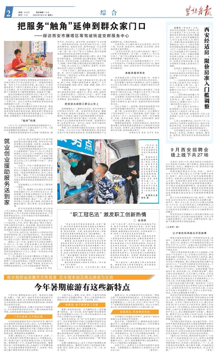 本报讯(孟珂)9月,西安市职业介绍服务中心计划组织27场线上线下招聘会,服务未就业高校毕业生、农民工、城镇失业人员、脱贫劳动力和有招聘需求的各类用人单位。 网络视频招聘会有 18 场,每周二、周四9时至 17 时在“猫头英云人才市场”招聘平台举行,每周三、周五 9 时至17时在显摆网招聘平台举行,求职者可选择通过移动端或电脑端进入会场。这些招聘会类型丰富,包括综合类网络视频招聘会、服务型企业网络视频招聘会、中小微企业网络视频招聘会、就业援助“暖心活动”网络视频招聘会、健康养老家政物业服务专场网络视频招聘会、白鹿原大学城就业创业促进联盟未就业毕业生专场网络视频招聘会等。 线下小型专场招聘会有9场,每周二、周四9时至12时在西安市人力资源和社会保障大厦一层举行。其中,9月1日、20日为中小微企业招聘会,9月6日、15日为综合类人力资源招聘会,9月8日、29日为民营企业招聘会,9月13日、22日为未就业毕业生招聘会,9月27日为服务型企业招聘会。 西安市职业介绍服务中心将免费为求职人员提供求职登记、职业指导等就业服务,为用人单位提供招聘登记、用工指导、招聘信息发布、线上线下招聘洽谈等公共就业服务。