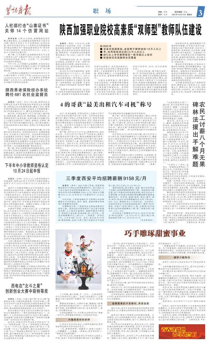到2025年 ■全省完成国家级、省级骨干教师培训1.8万人以上 ■市、校两级培训达到2.5万人次以上 ■80%以上专任教师接受一轮市级以上培训 ■校级培训实现教师全员覆盖 本报讯(郭妍)9月28日,从陕西省教育厅传来消息:为进一步加强职业院校高素质“双师型”教师队伍建设,推动现代职业教育高质量发展,陕西将进一步做好职业院校教师素质提高计划(2022—2025年)实施工作。 陕西将健全国家、省、市、校四级培训体系,全面落实“五年一周期”的教师全员培训制度,创新培训形式,丰富培训内容,促进师德养成、知识更新和能力提升。 到2025年全省完成国家级、省级骨干教师培训1.8万人以上,市、校两级培训达到2.5万人次以上,80%以上专任教师接受一轮市级以上培训,校级培训实现教师全员覆盖,努力造就一支师德高尚、技艺精湛、专兼结合、充满活力的高素质“双师型”教师队伍。 陕西将丰富培训内容,到2025年,实现全省职业院校德育骨干管理人员、思政课专任教师培训全覆盖。对接行业新技术、新标准和新要求,开发省级专业培训核心课程新形态教材,开展课程教学专项信息化技能、课程实施能力、公共基础课教学能力等培训,提高教师教育教学能力。 加强社会服务能力,落实教师企业实践制度,注重教师理论提高与实践锻炼结合,教育教学能力提高与服务能力增强结合。支持职业院校聘请企业、科研院所和社会上具有实际工程经验、创新创业能力、专业技术技能的专家人才走进学校开展讲座、培训、技术交流等活动。 完善培训机制,建立健全国家、省、市、校四级培训体系,国家级培训示范引领,侧重于对关键重点教师群体实施培训;省级培训核心带动,侧重于对教学与管理骨干人员的创新培训;市级培训基础保障,侧重于对新入职教师和青年教师的培训;校级培训突出特色,侧重于对教师基础能力和教育教学理论的通识培训及教师适应学校教学改革需求的针对性培训。 创新培训形式,陕西将根据不同教师培训需要,科学制定培训方案,采取线上线下混合研修、结对学习、跟岗研修、顶岗研修、访学研修、返岗实践等方式开展培训。完善政府、行业、企业、学校等多方参与的教师培训机制,鼓励区域内校校、校企联合组织实施培训,加强区域间资源共享、经验交流。 健全培训支持体系,打造高水平教师培训基地,陕西将遴选建设一批省级“双师型”教师培训基地、企业实践基地。鼓励高水平职业院校与行业企业共建教师发展中心。培育高素质专业化培训者团队,推进优质培训资源建设。实施重点培训项目,打造陕西特色培训项目。 支持职业院校设立产业导师特聘岗,聘请企业工程技术人员、高技能人才、管理人员、能工巧匠等,采取兼职任教、合作研究、参与项目等方式到校工作,深度参与教育教学改革。